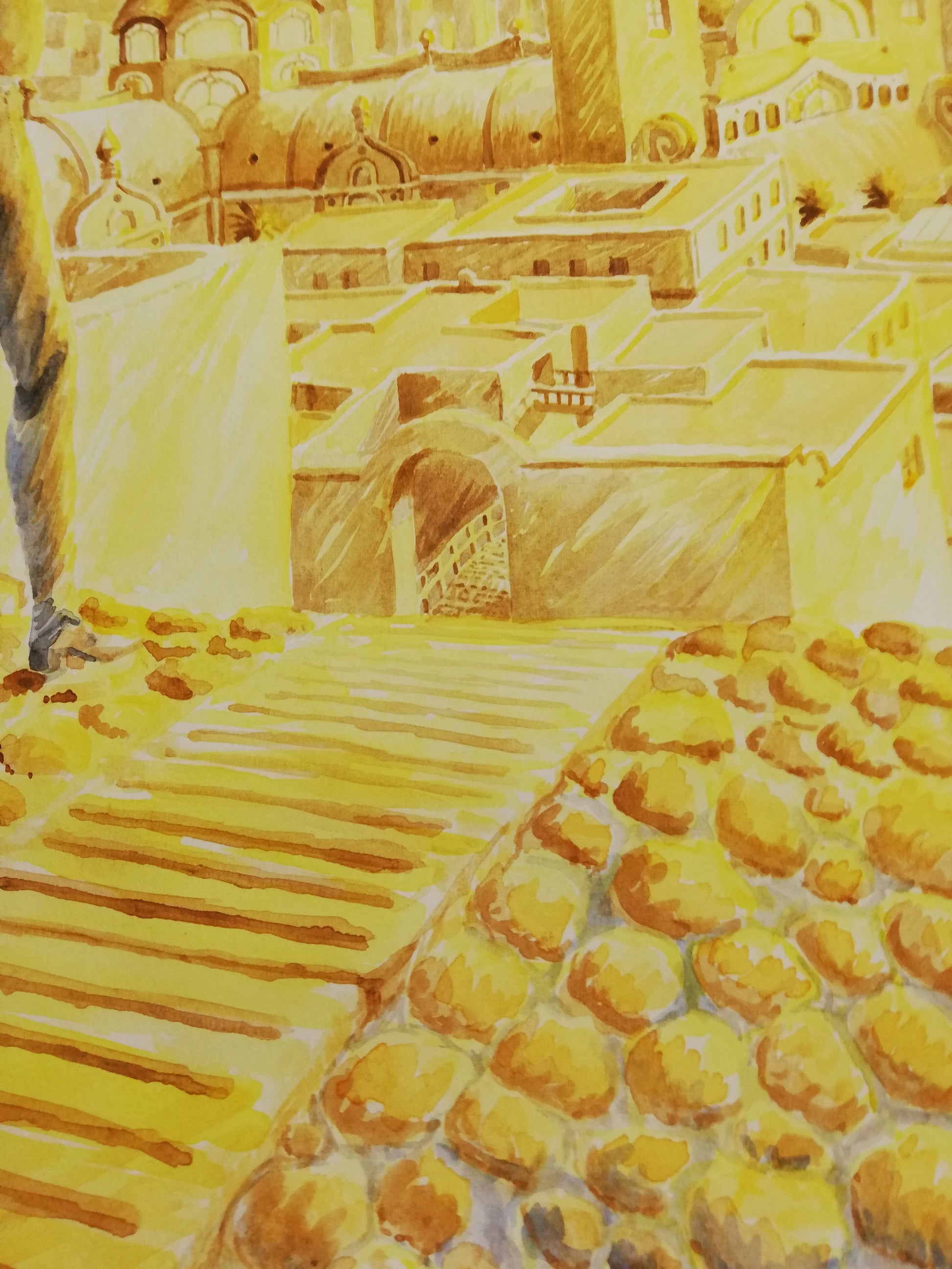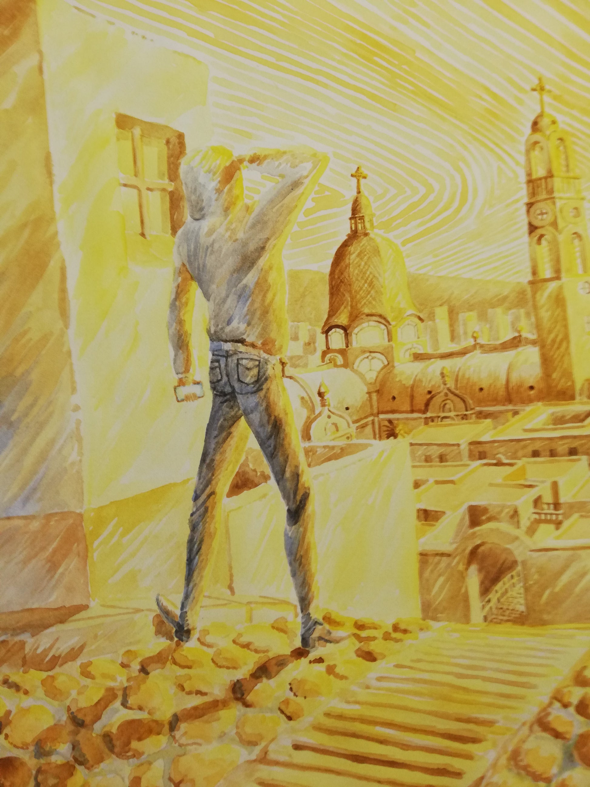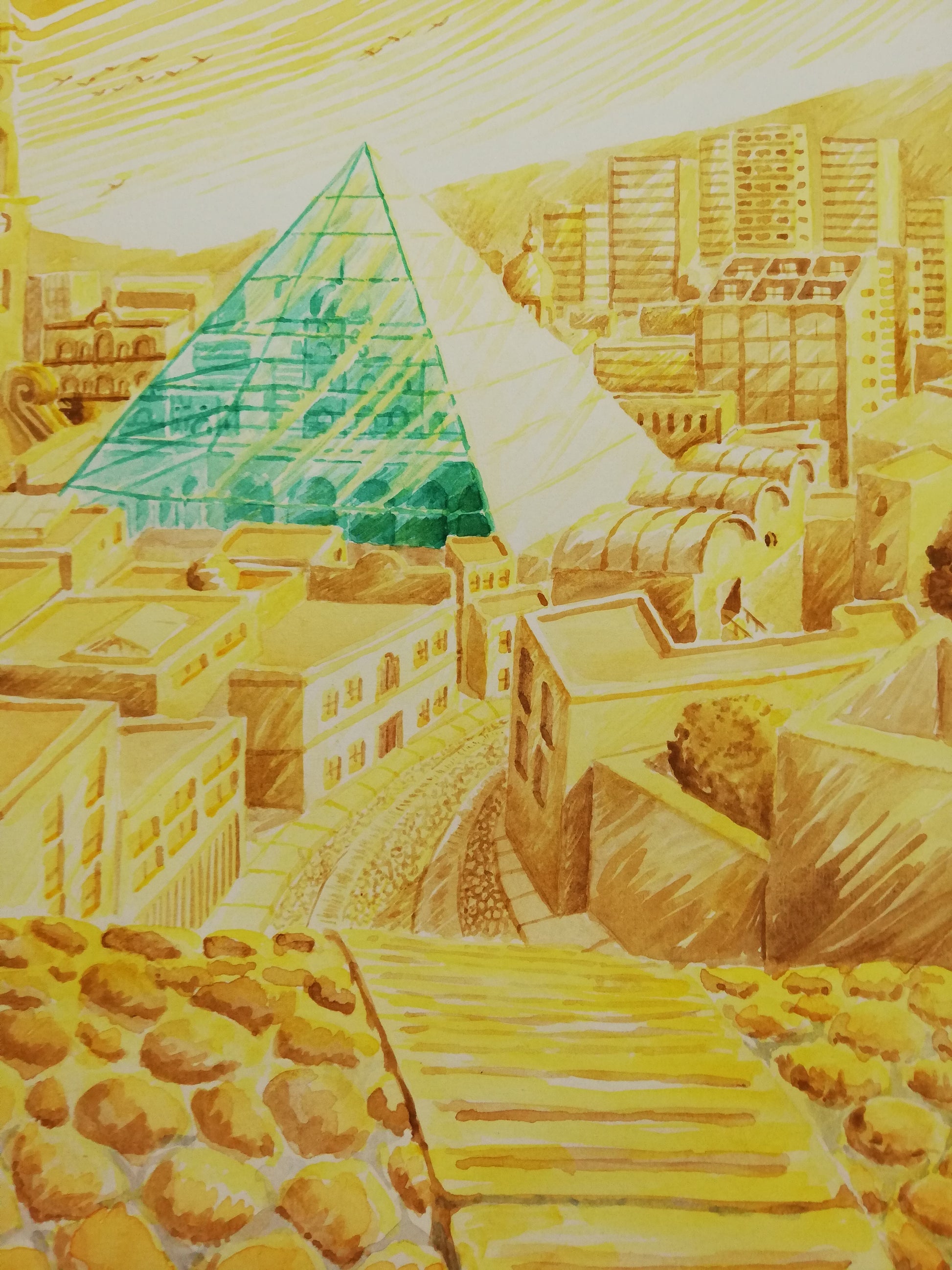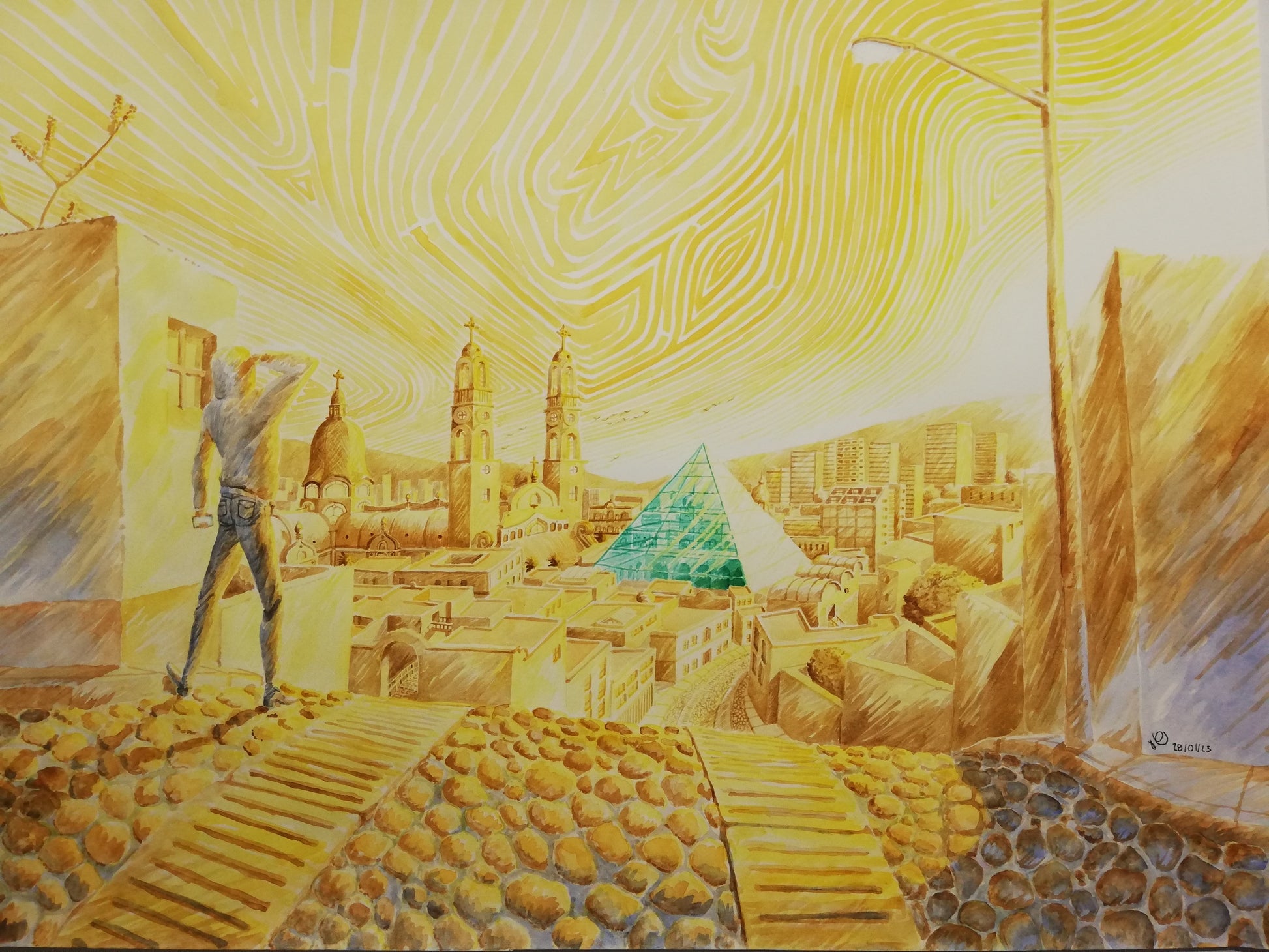 Paisaje de atardecer que muestra a un joven que contempla una gran pirámide de cristal, la cual se asoma entre el paisaje urbano dorado.