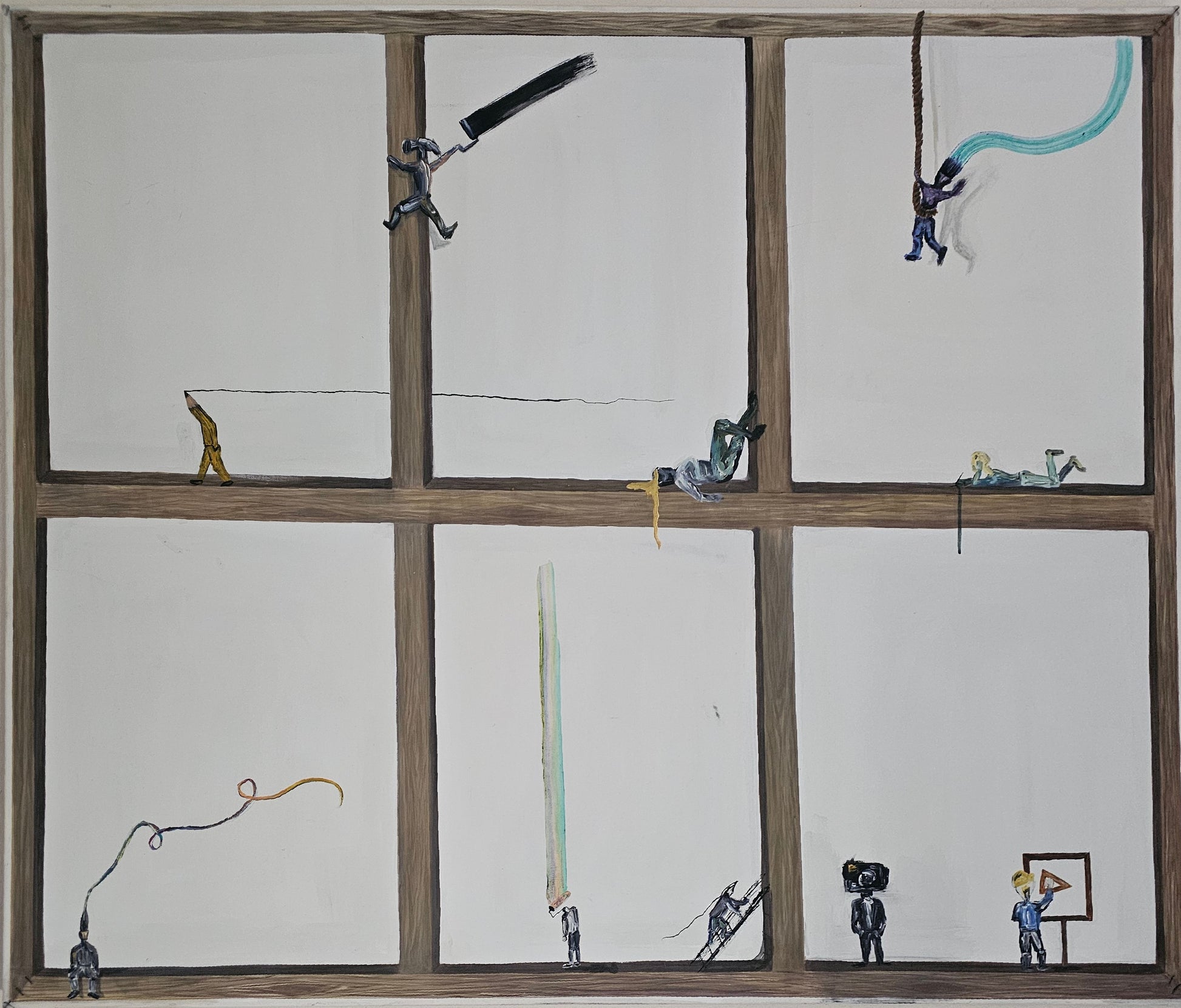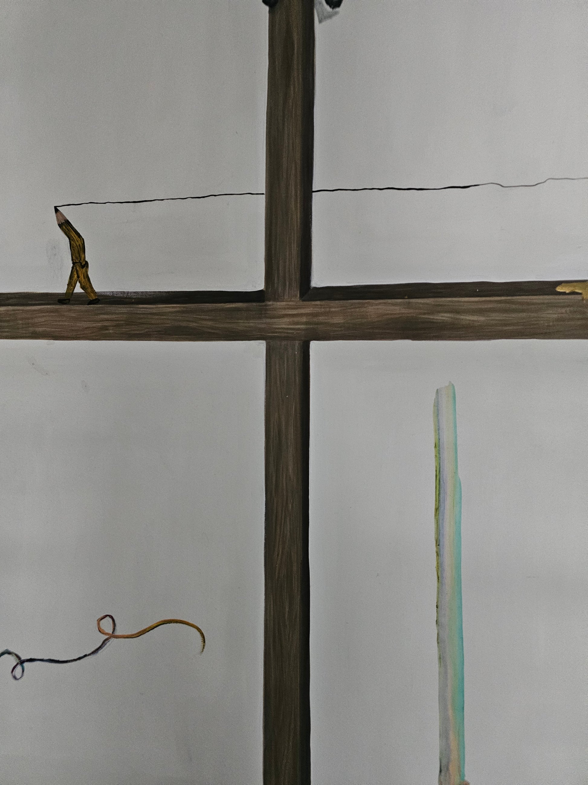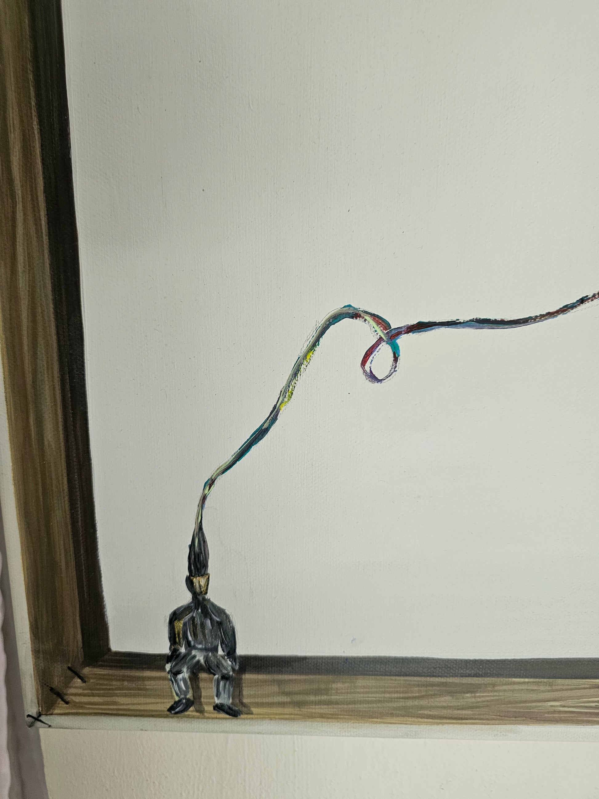 Cada pieza lleva un esfuerzo, una planeación una historia etc. La pintura es el marco del bastidor al frente del mismo simulando la parte trasera, aunado a esto unos "personajes" que exponen parte del proceso creativo y emocional que conlleva crear una pieza.