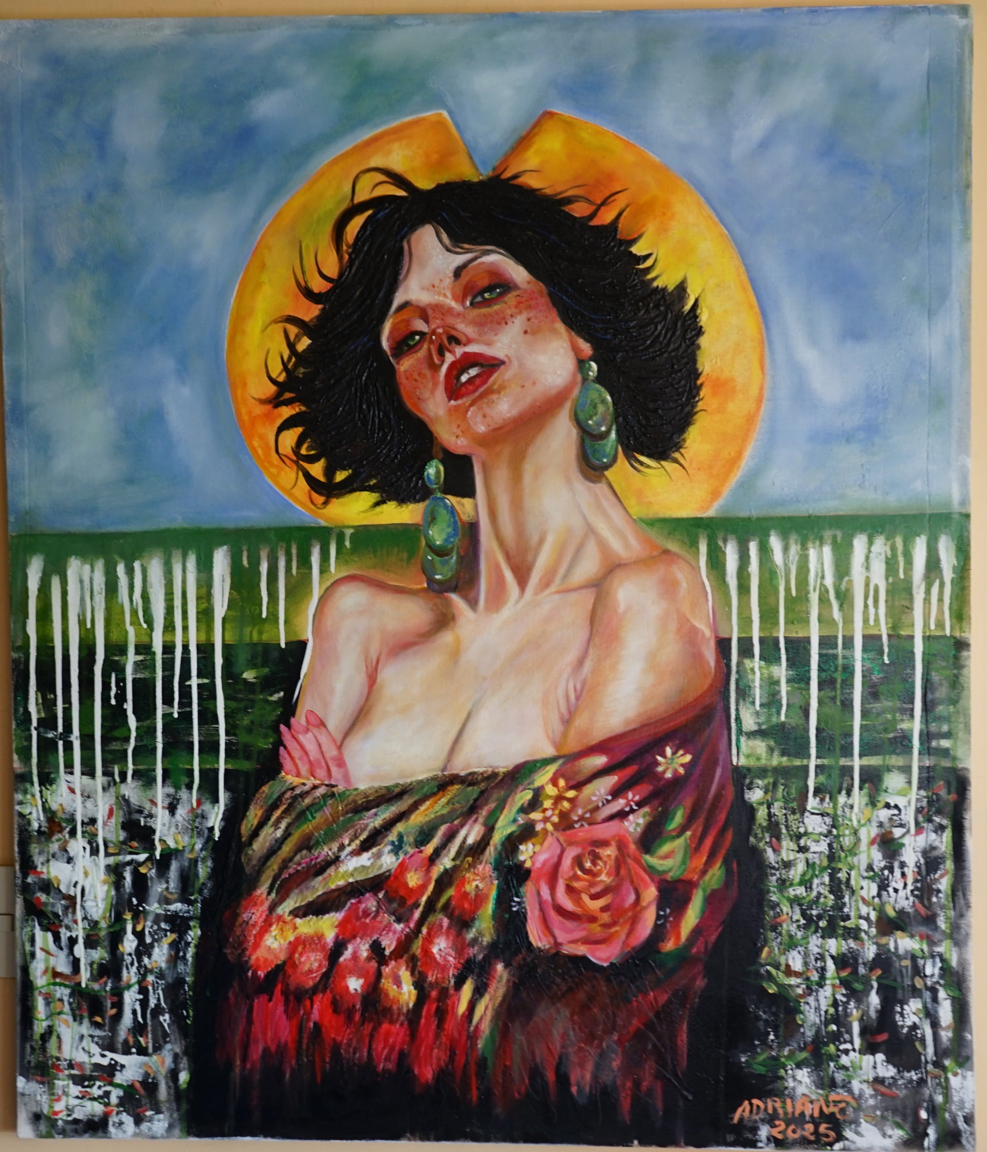 Técnica mixta con un leve relieve en su cabello y Chal que cubre sus brazos.