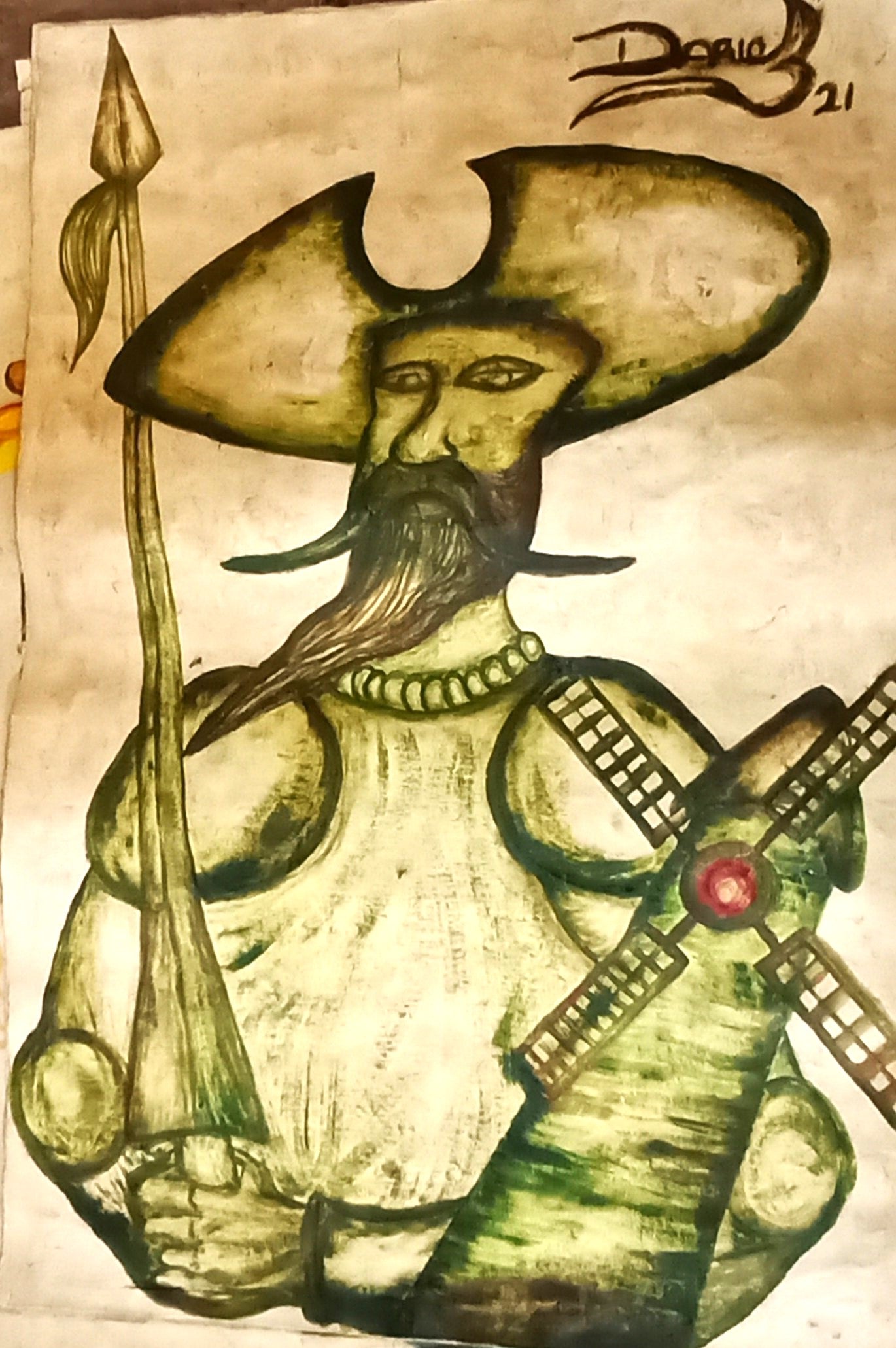 Esta obra es una más de las diversas interpretaciones de éste personaje icónico de la literatura universal, queda claro que las técnicas y maneras de ejemplificar han sido interminables e indudablemente el trabajo que muestro en esta pintura pone de manifiesto la importancia e impacto de la obra de Cervantes la cual ha marcado una etapa de mi vida; este trabajo está realizado en óleo sobre papel amate, el árbol del cual es extraído de forma artesanal el papel se llama "Palo brujo", al ser un papel no se permiten errores en la aplicación del óleo ya que si representa un cierto grado de dificultad.