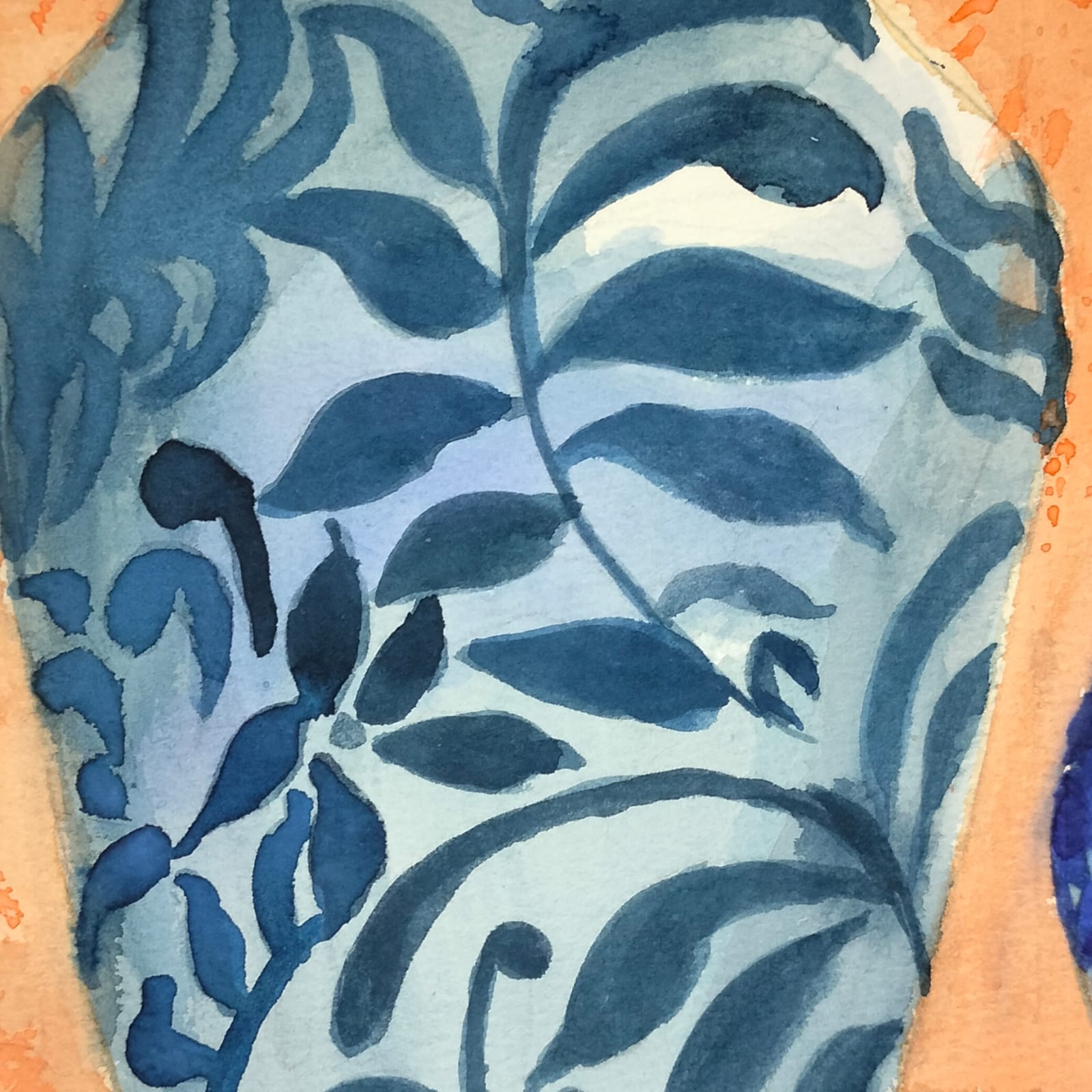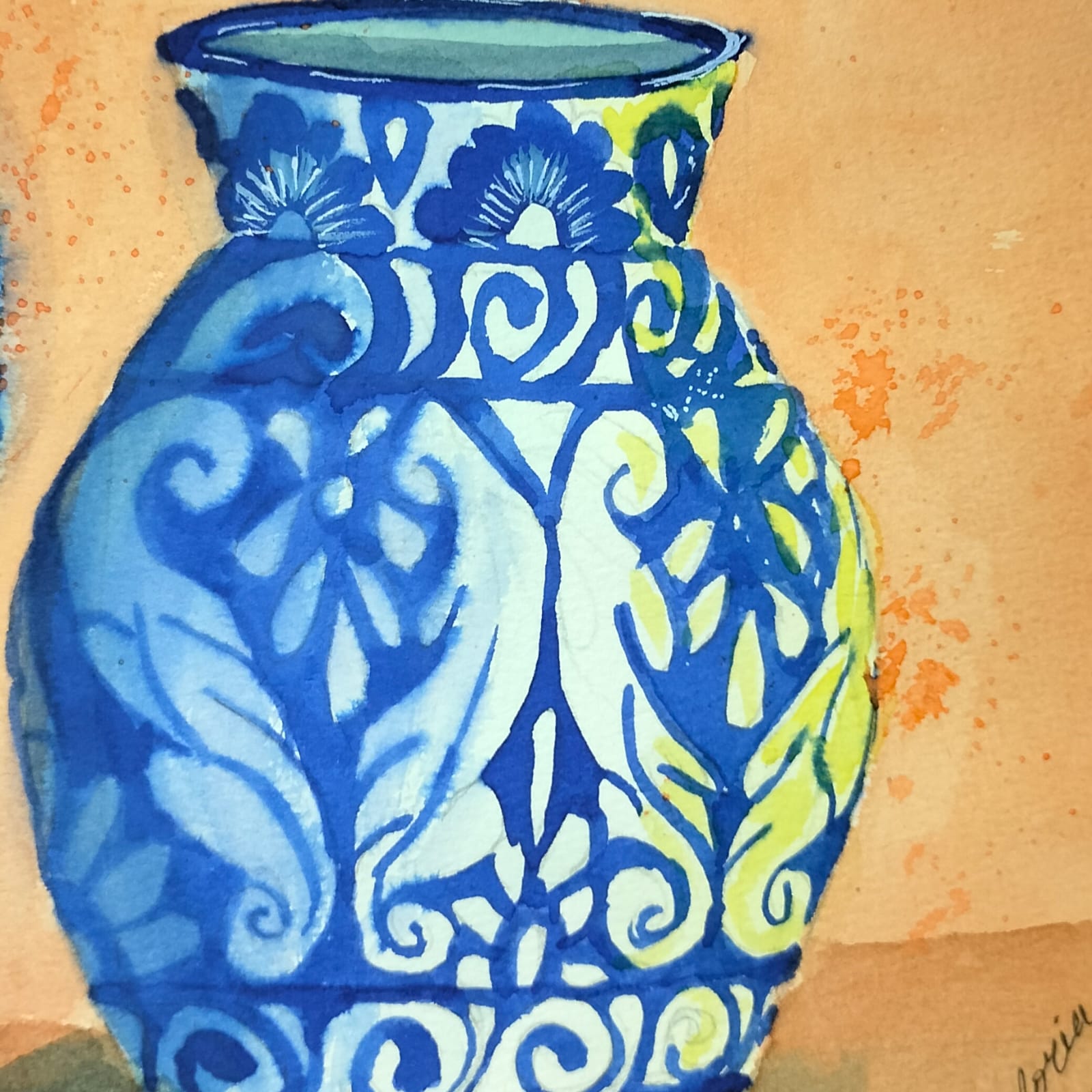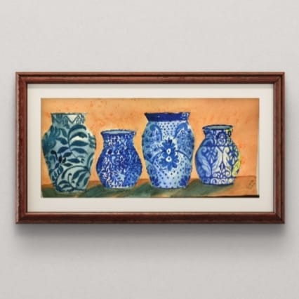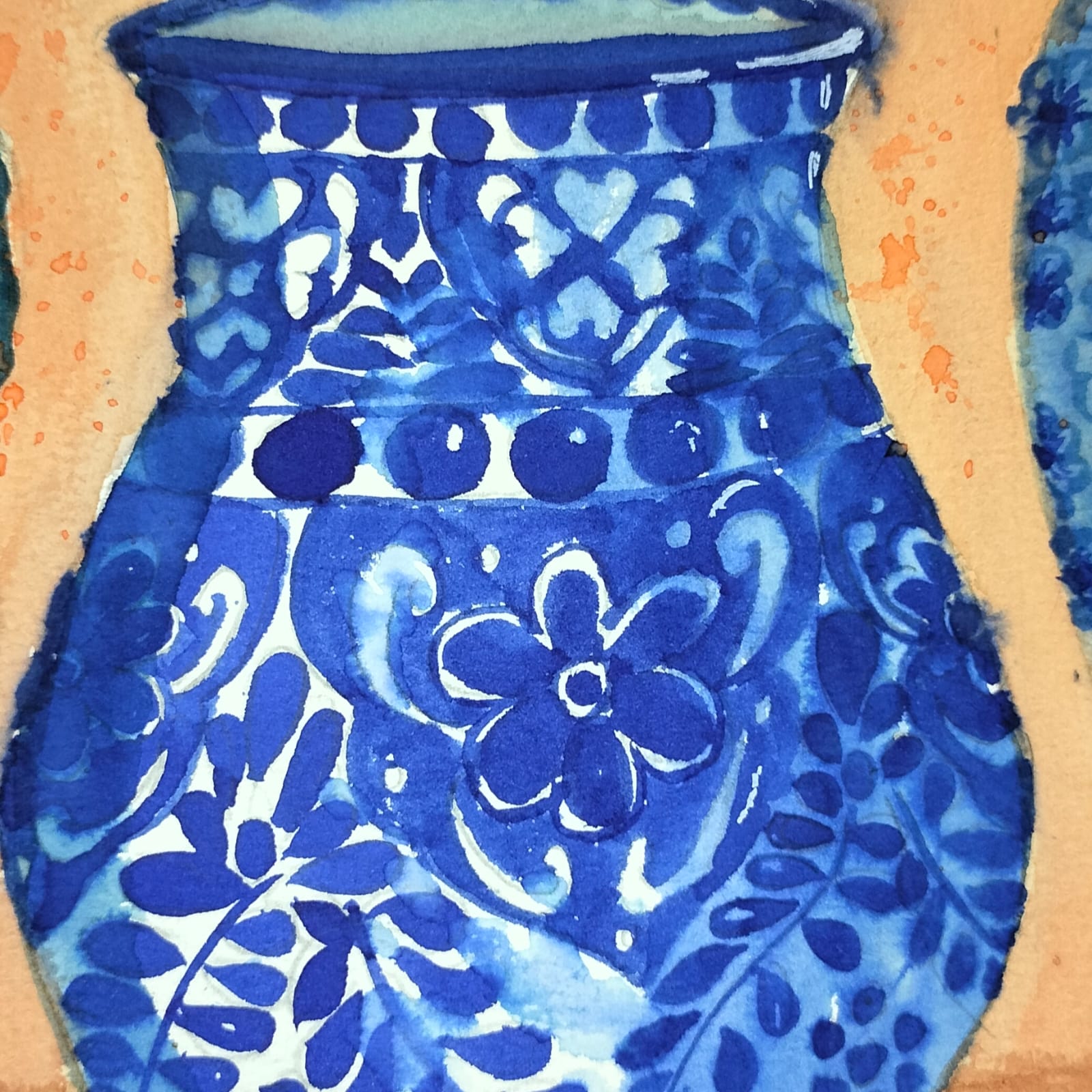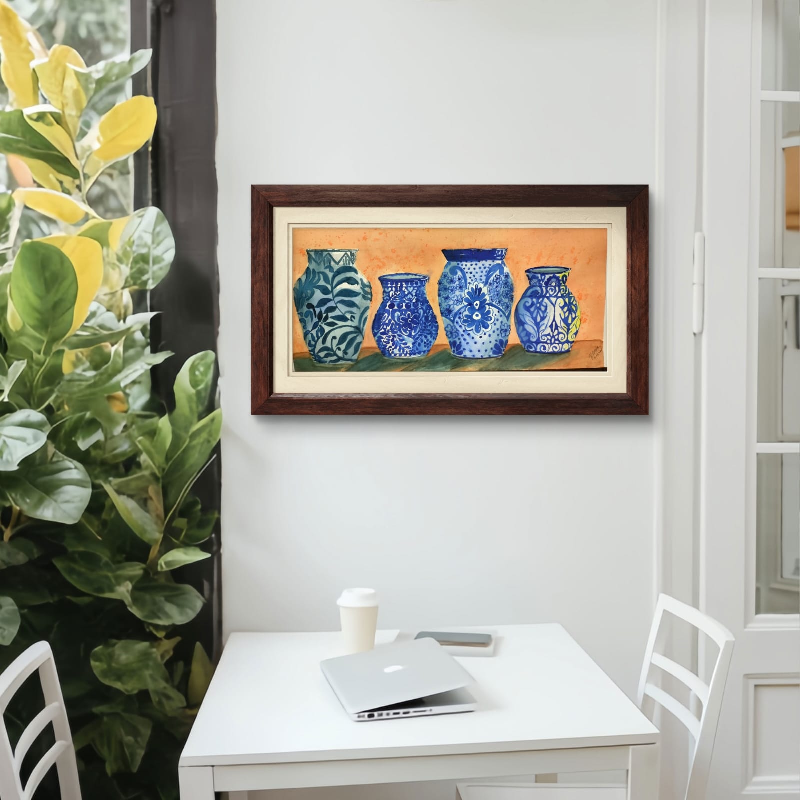 Cuatro jarrones azules sobre un fondo cálido se convierten en símbolos de herencia, historia y memoria. Cada trazo honra las raíces culturales que nos sostienen, imperfectas pero llenas de significado. Una pieza que celebra lo que llevamos dentro.