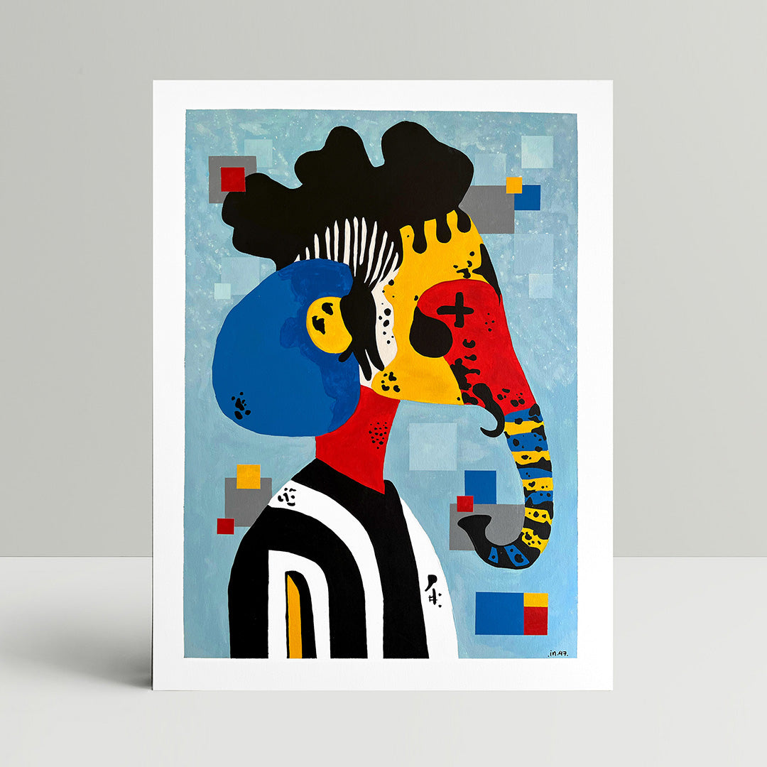 Es un retrato surrealista de perfil. El uso del color block (azul, rojo, amarillo) y las formas geométricas en un fondo celeste evocan a Kandinsky y sugieren la fragmentación del recuerdo y la sabiduría del elefante.