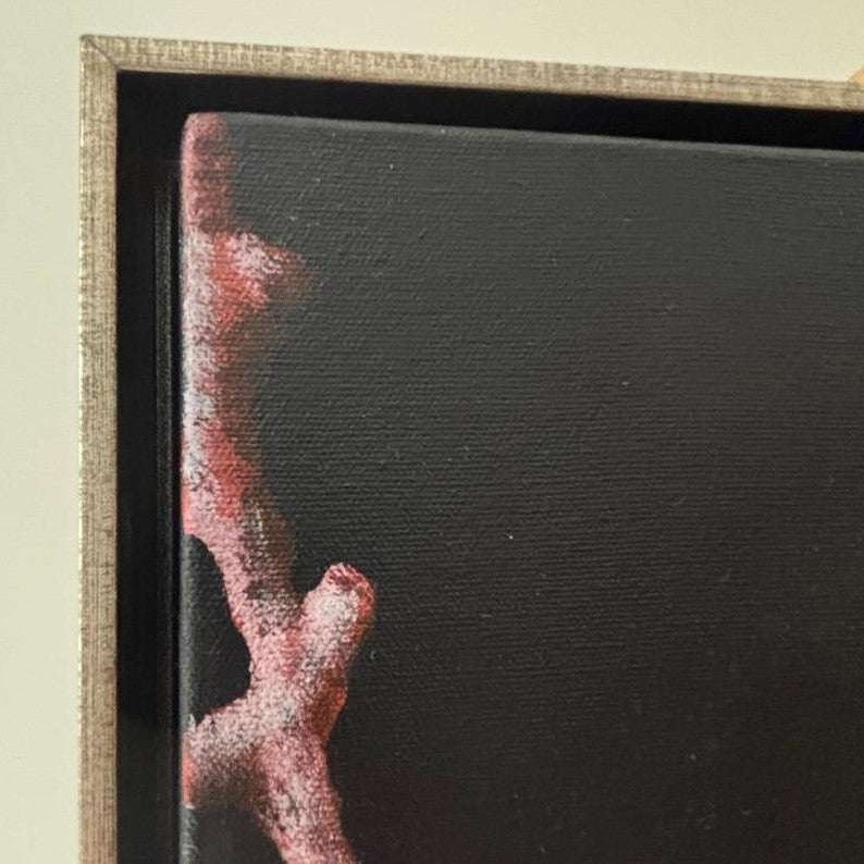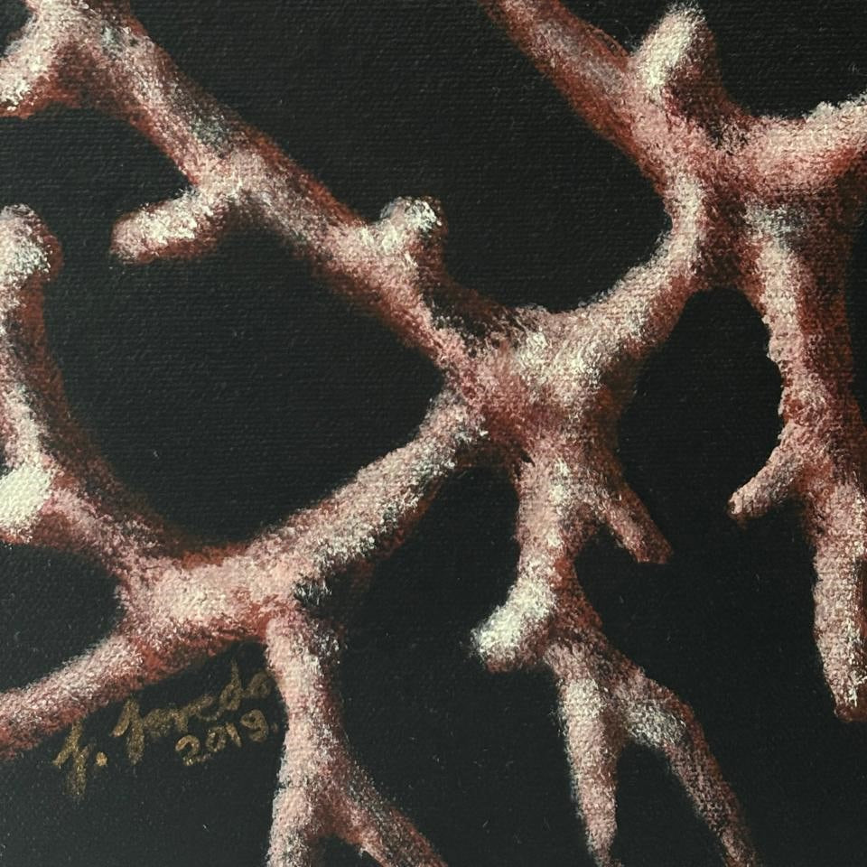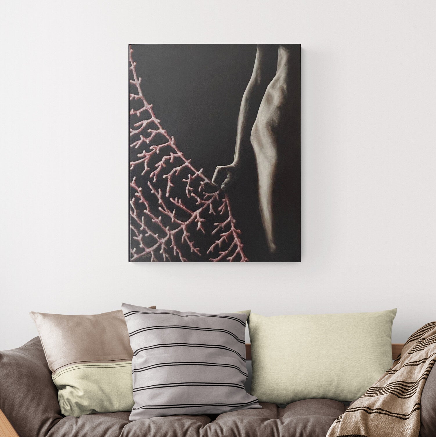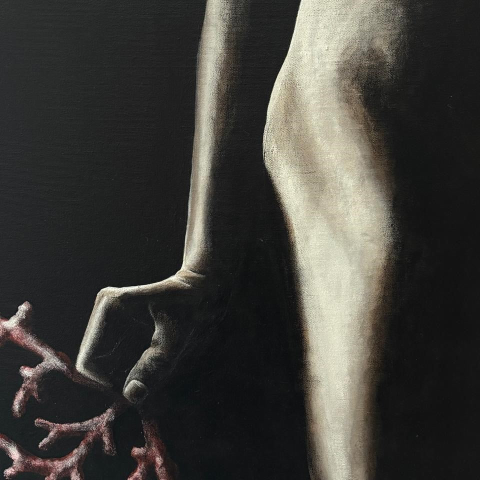 Personaje femenino, que se encuentra en su espacio íntimo y personal, entre la luz y la oscuridad. En su mano sostiene una red de coral que representa las experiencias de su vida.