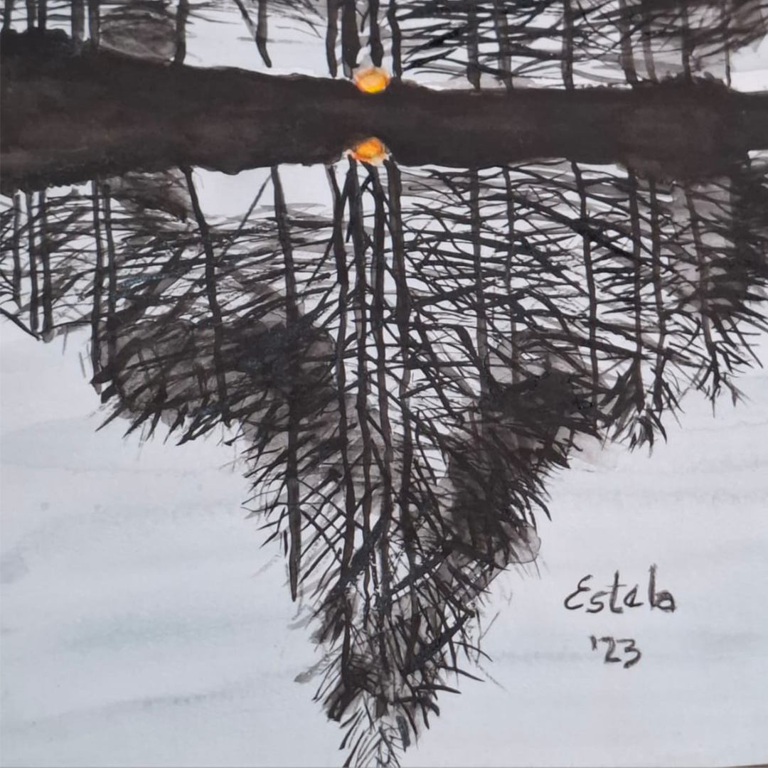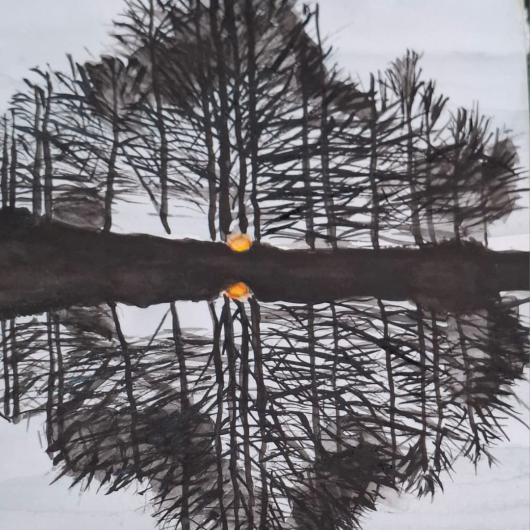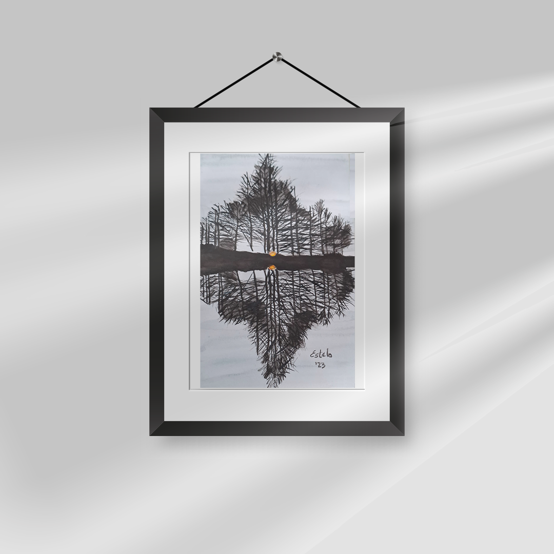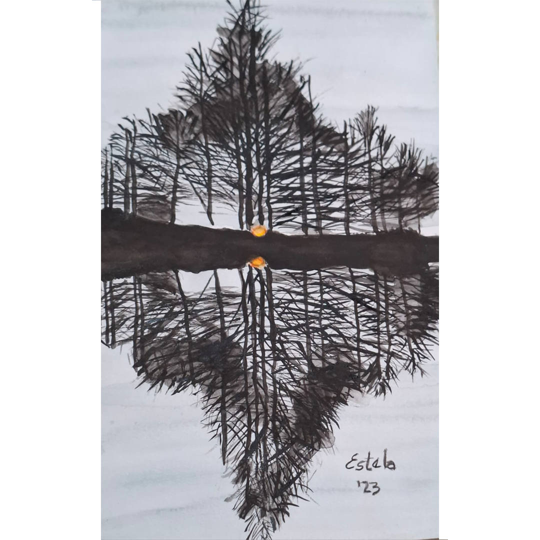 Esta pintura me dice que siempre hay dos caminos El mundo es Dual. En esta pintura vemos como un árbol se refleja en un espejo de agua sin ningún esfuerzo. El mundo podría ser así pero el hombre lo complica todo