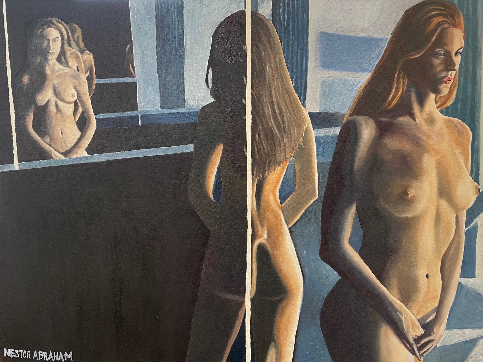 Mujer admirando toda su belleza en varios espejos viendo todo su cuerpo desnudo en multiples reflejos.