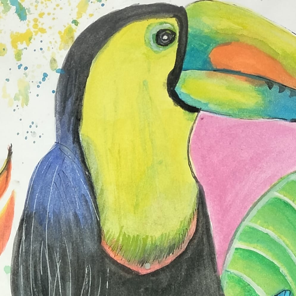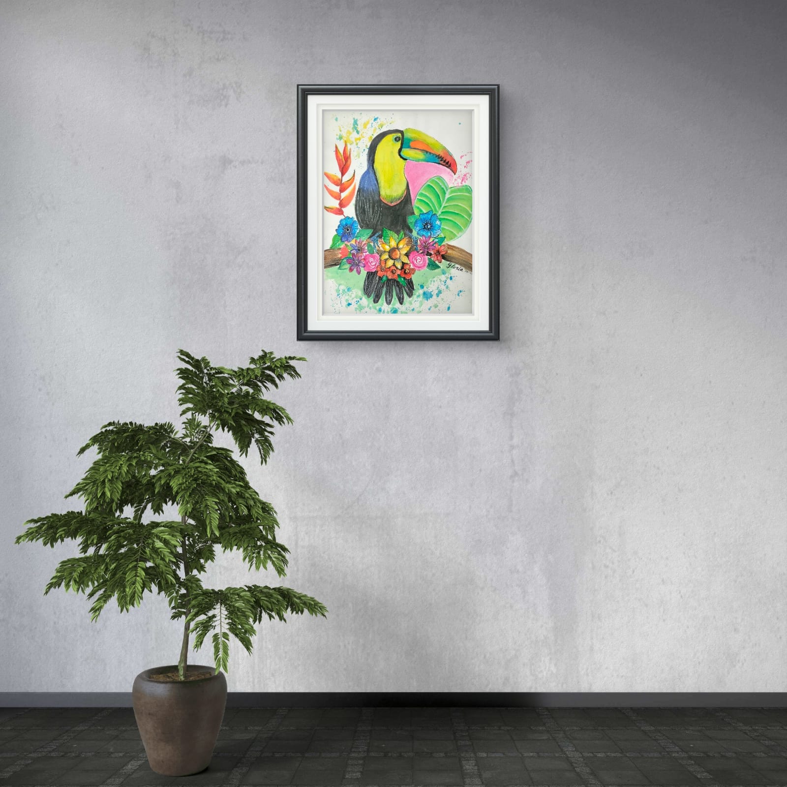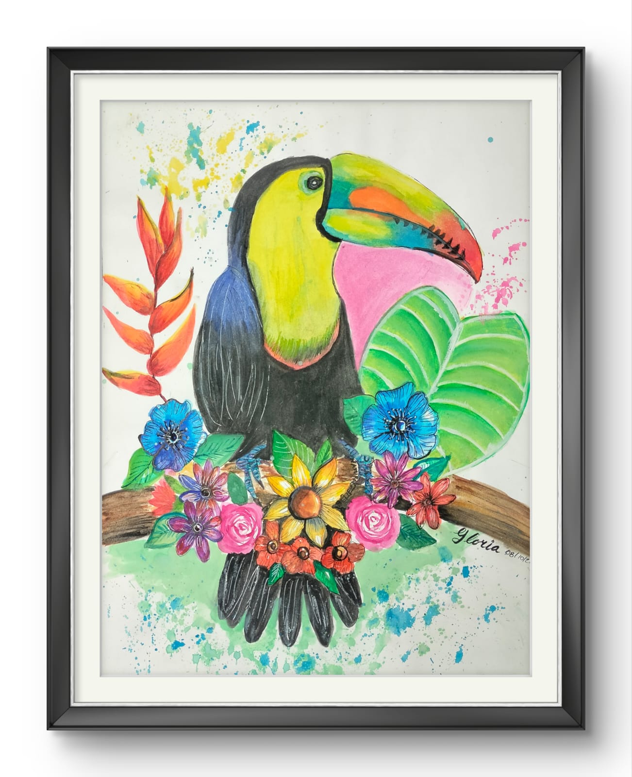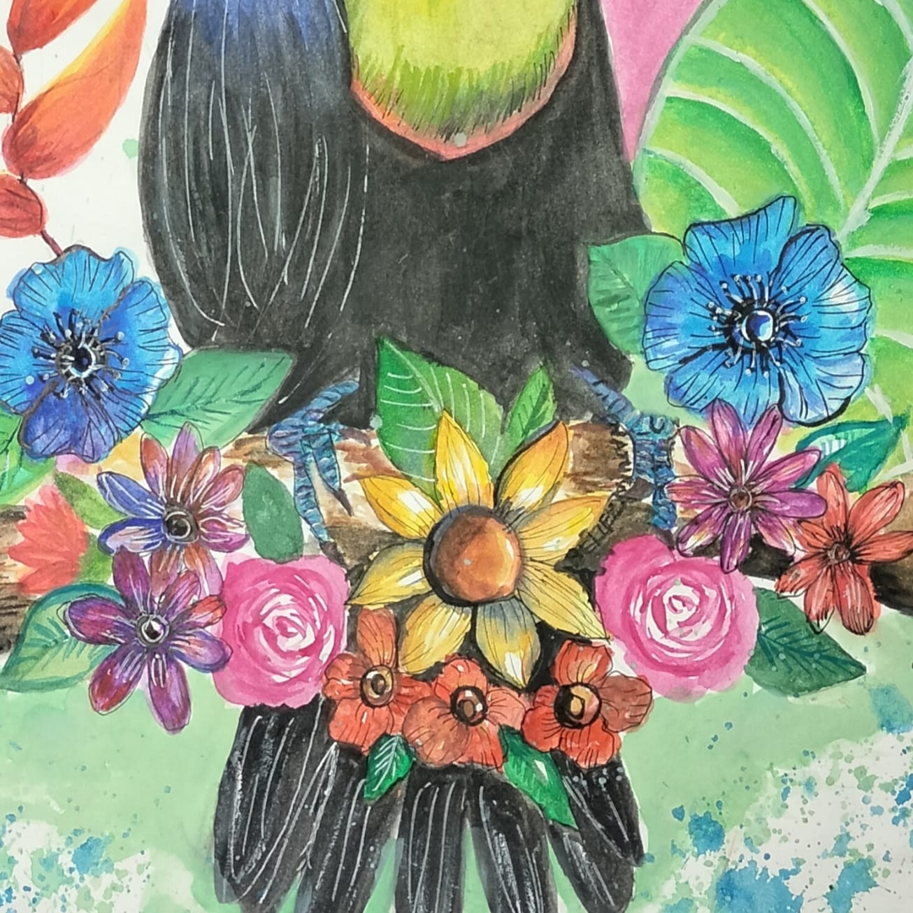 "Refugio Vital" 2022. Pintura de acuarela de Tucán sobre una rama, rodeado de flores. Estilo libre. Esta obra es una celebración visual de la fuerza interior que florece incluso en medio de la vulnerabilidad. Obra unica.