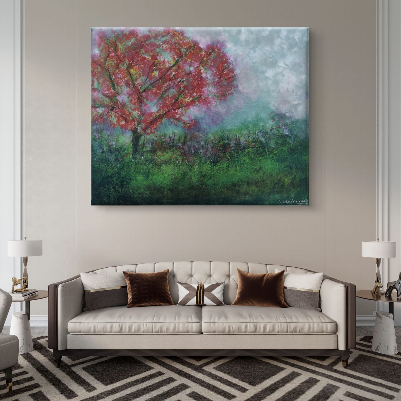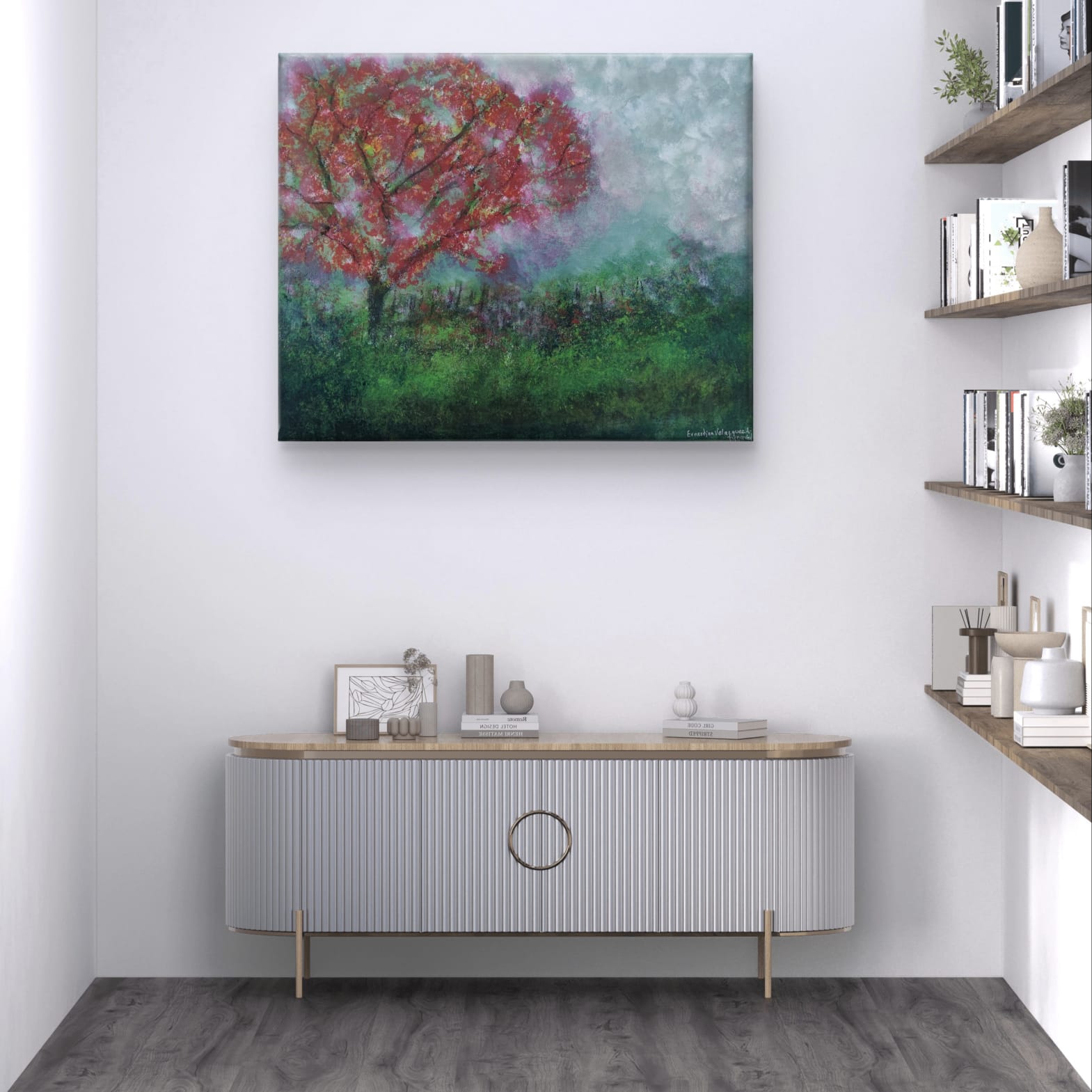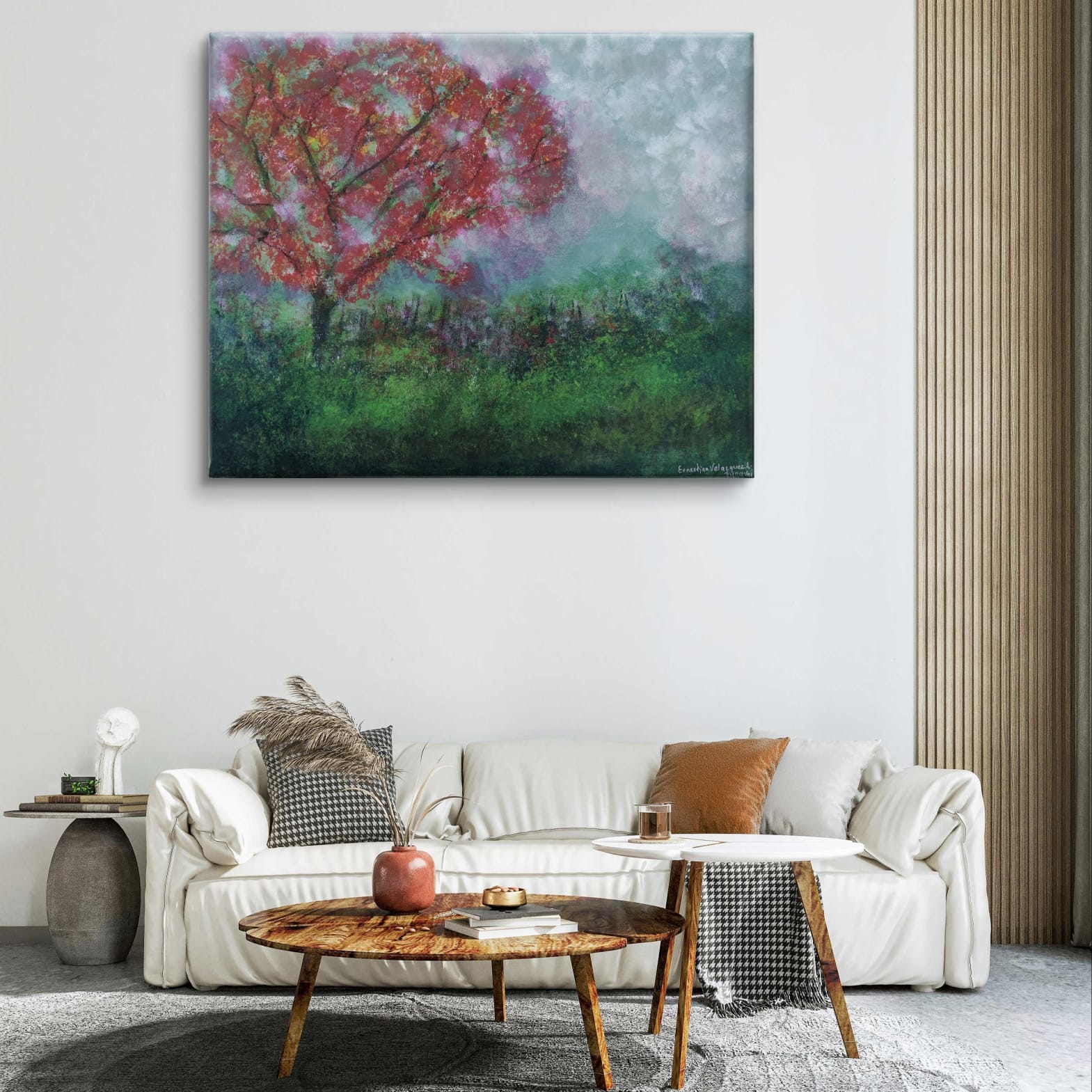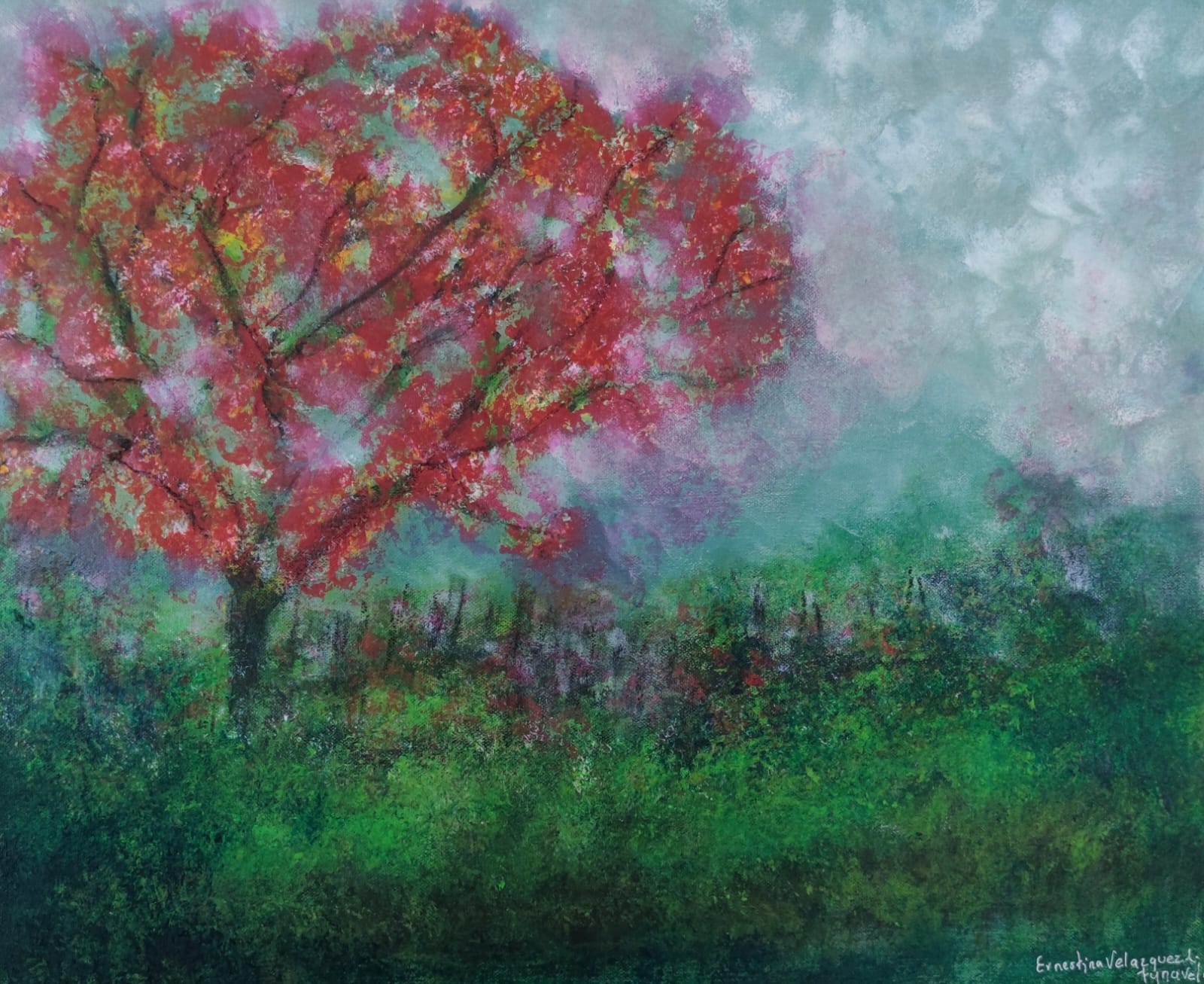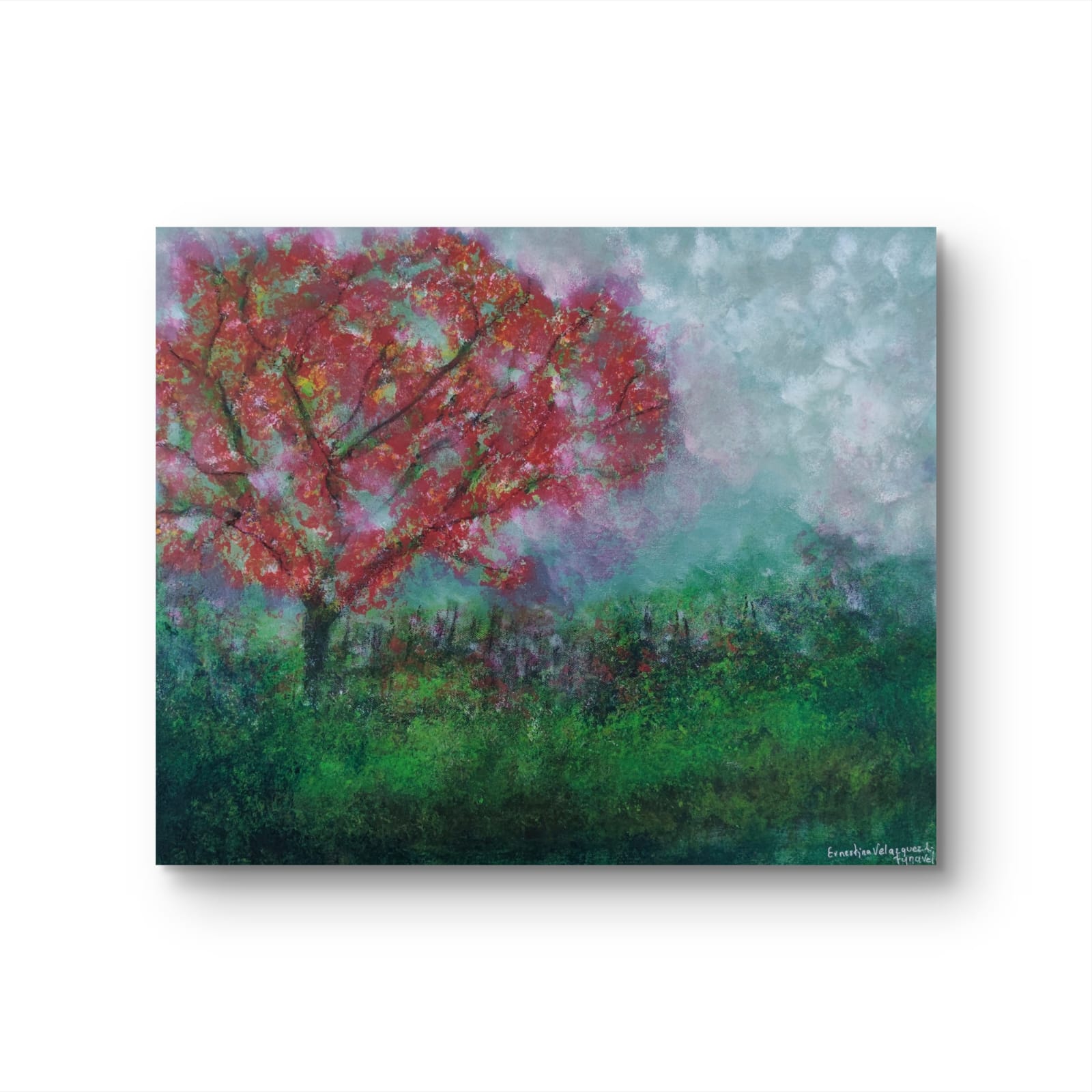 Este lienzo no es una mera representación de un paisaje, sino una invitación a experimentar la naturaleza a través de un prisma intensamente emocional. El árbol carmesí, protagonista indiscutible, parece latir con vida propia, como si sus ramas albergaran todas las pasiones contenidas en el alma del espectador. Su follaje vibrante dialoga con la atmósfera onírica del cielo turbulento y la vegetación circundante, creando una sinfonía cromática donde cada pincelada resuena con intención deliberada, que invita a perderse en el lienzo, descubriendo nuevos matices con cada contemplación.