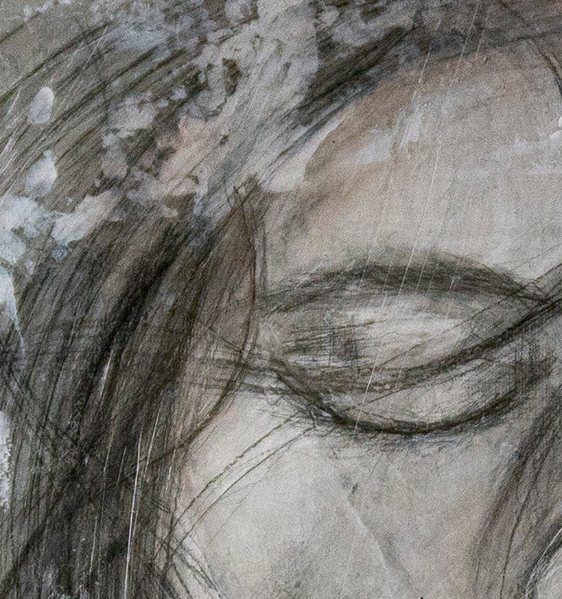 Representa el momento íntimo y poderoso en el que un personaje conecta con su centro para emerger de nuevo. Su rostro, sereno pero marcado por cicatrices insinuadas, refleja la aceptación del dolor como parte de la transformación. No hay derrota, sino una presencia silenciosa que habla d fortaleza reconstruida.
