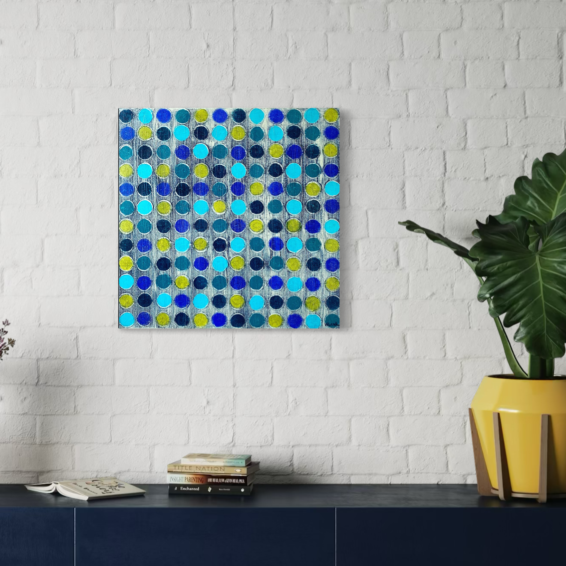 En esta obra, los tonos azules y verde limón se entrelazan en un ritmo visual que transmite calma y movimiento a la vez. Cada punto parece respirar, marcando un pulso constante que invita a detenerse y observar. La textura y las variaciones del color crean profundidad, haciendo que la superficie cobre vida. Es una pieza que equilibra la precisión geométrica con la energía vibrante del color.