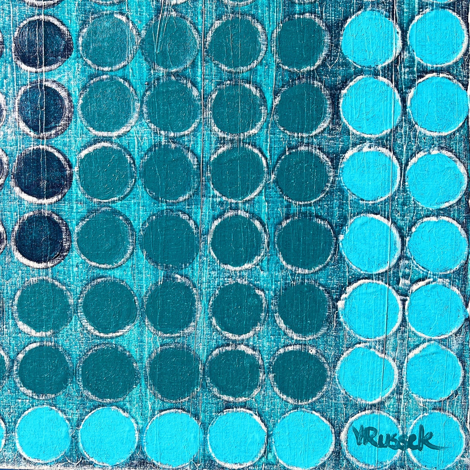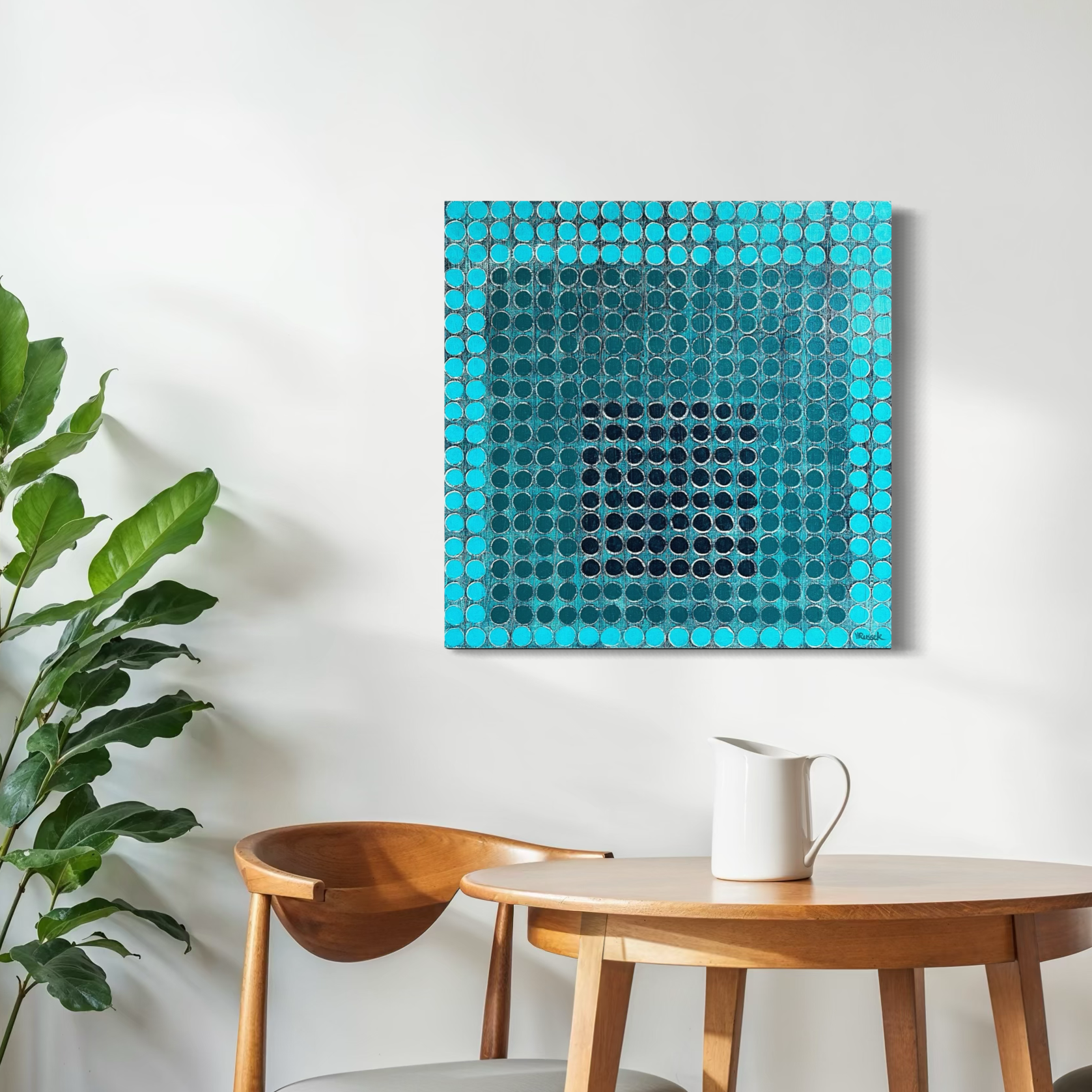 El azul turquesa y sus matices se convierten aquí en protagonistas, evocando calma, introspección y claridad. La geometría repetitiva invita al espectador a sumergirse en un espacio meditativo donde el color es el verdadero centro.