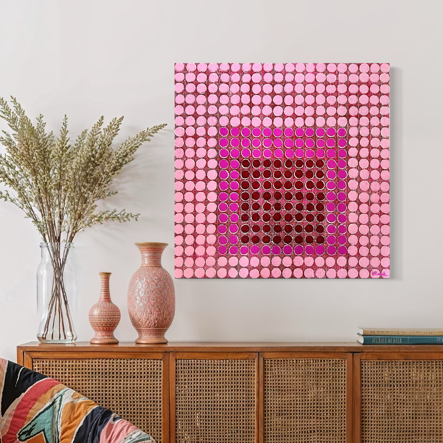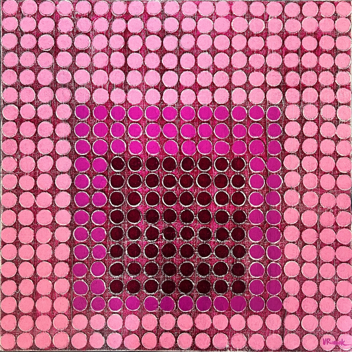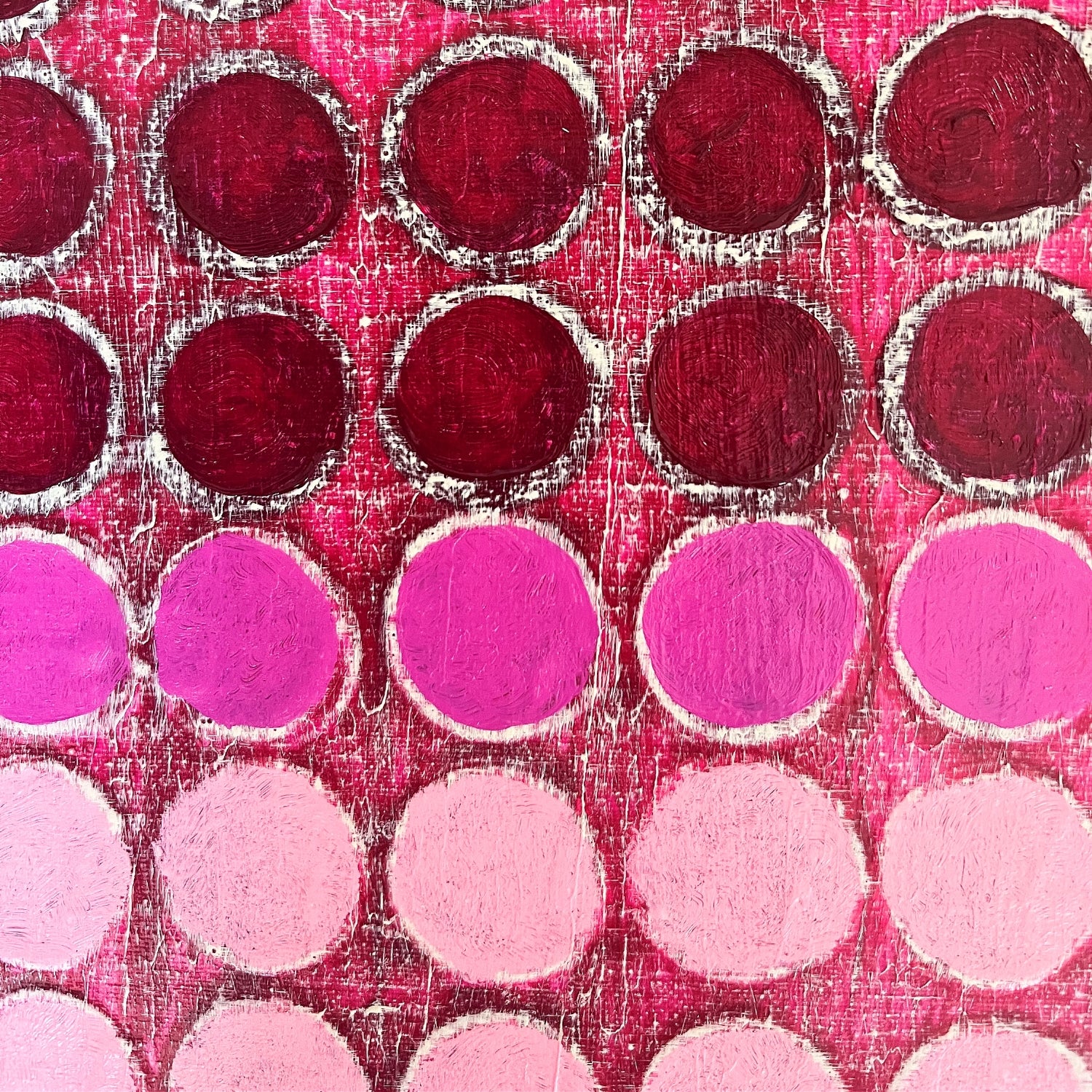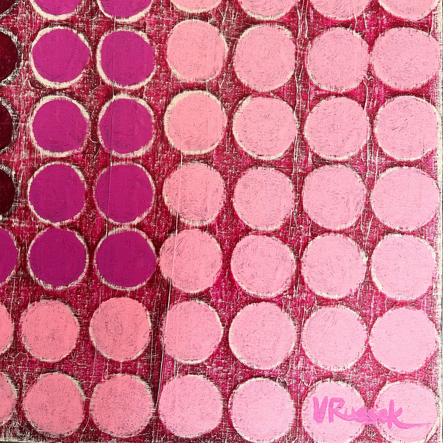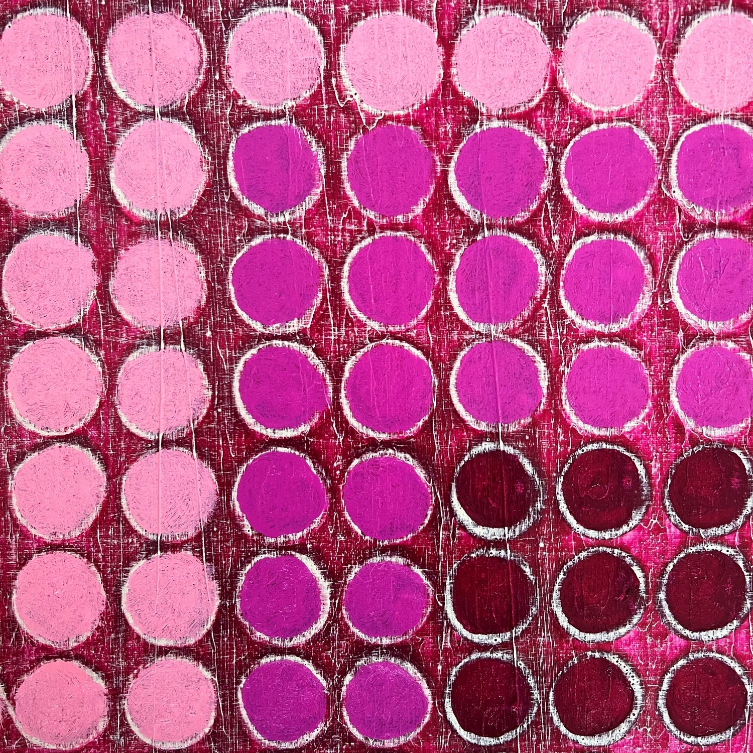 Retícula de puntos en colores rosa vibrante. Desde un rosa claro, pasando por el rosa medio hasta llegar al magenta. La obra está inspirada en la serie Homenaje al Cuadro de Josef Albers, pero muy a la manera de Verónica Russek, o sea, con bolitas, que son el sello personal de la artista. La obra tiene capas de color y textura para darle mucha profundidad.