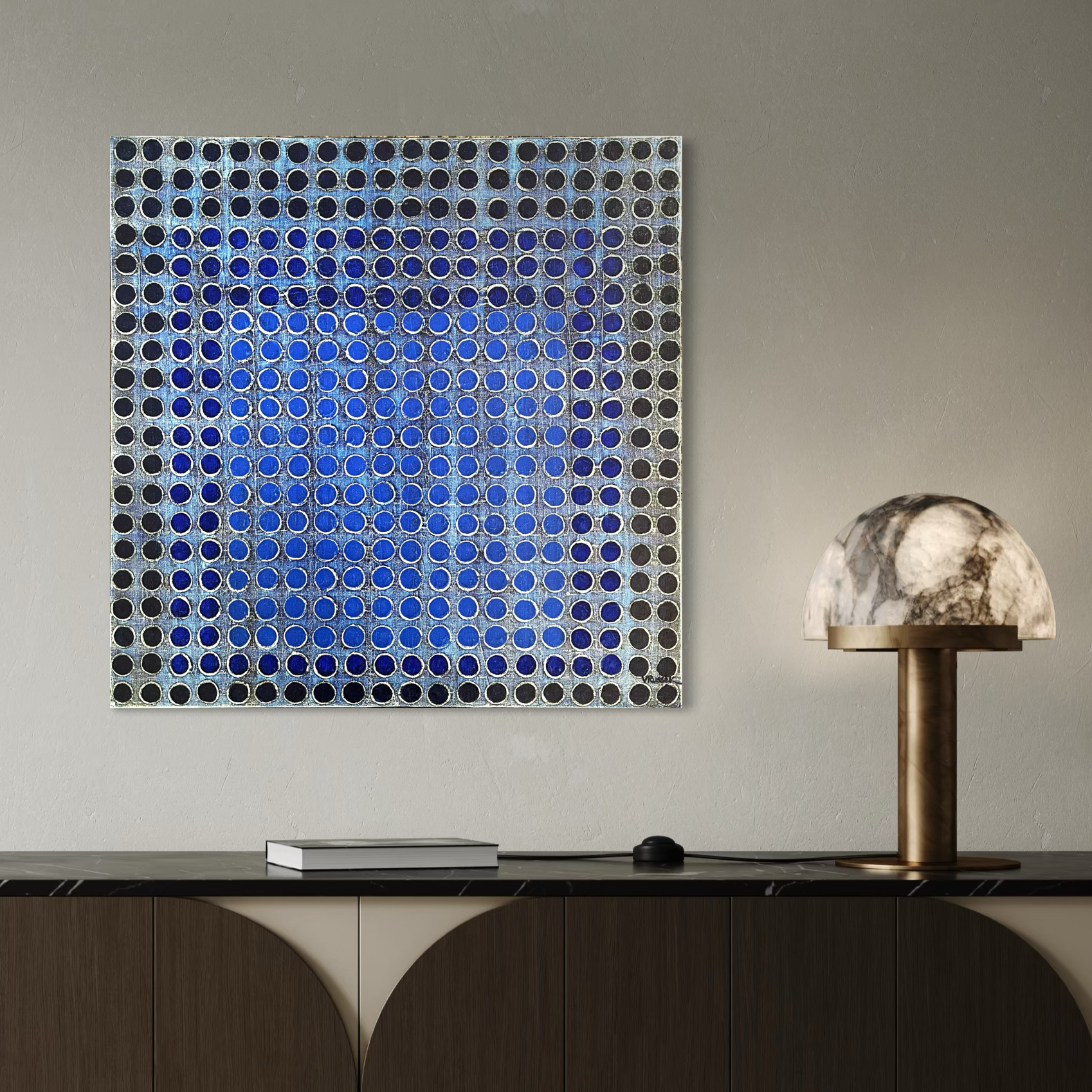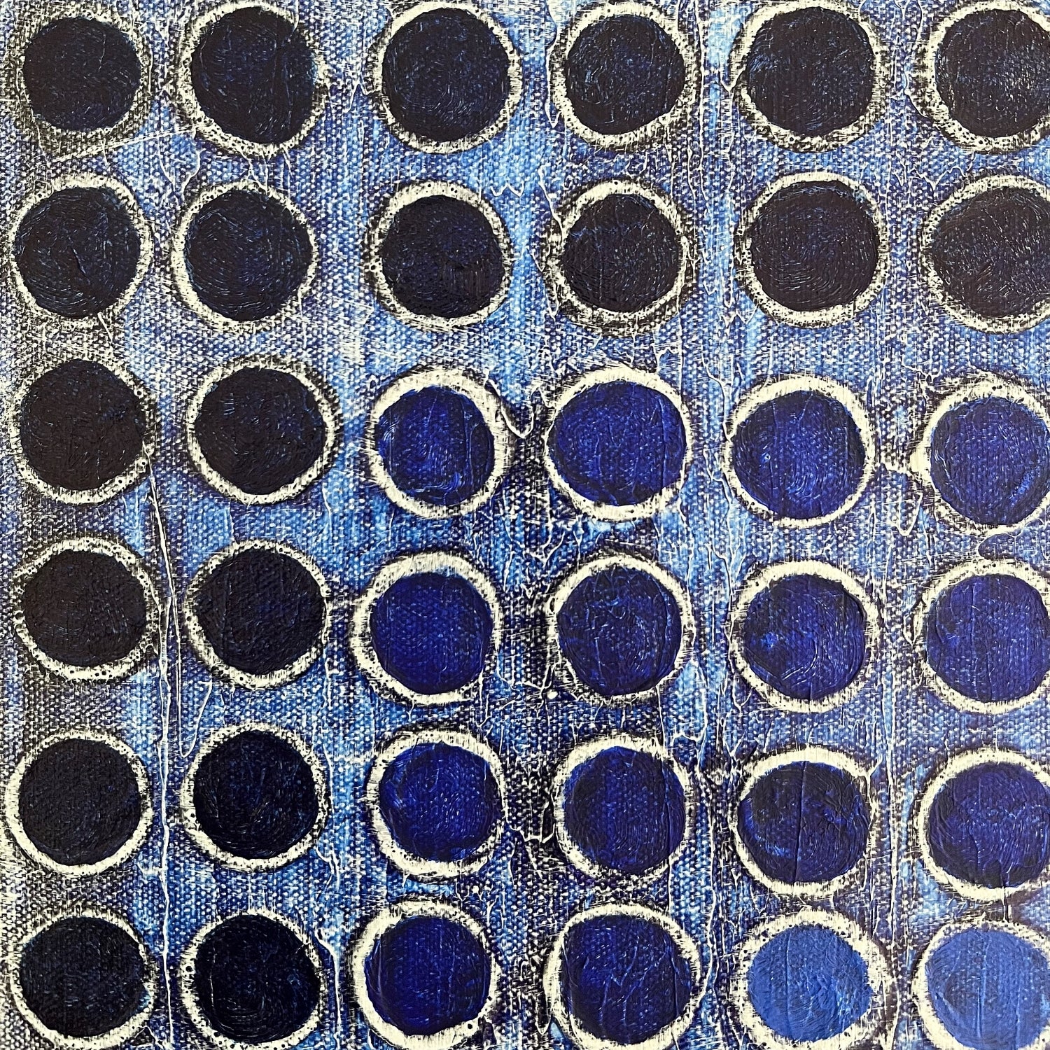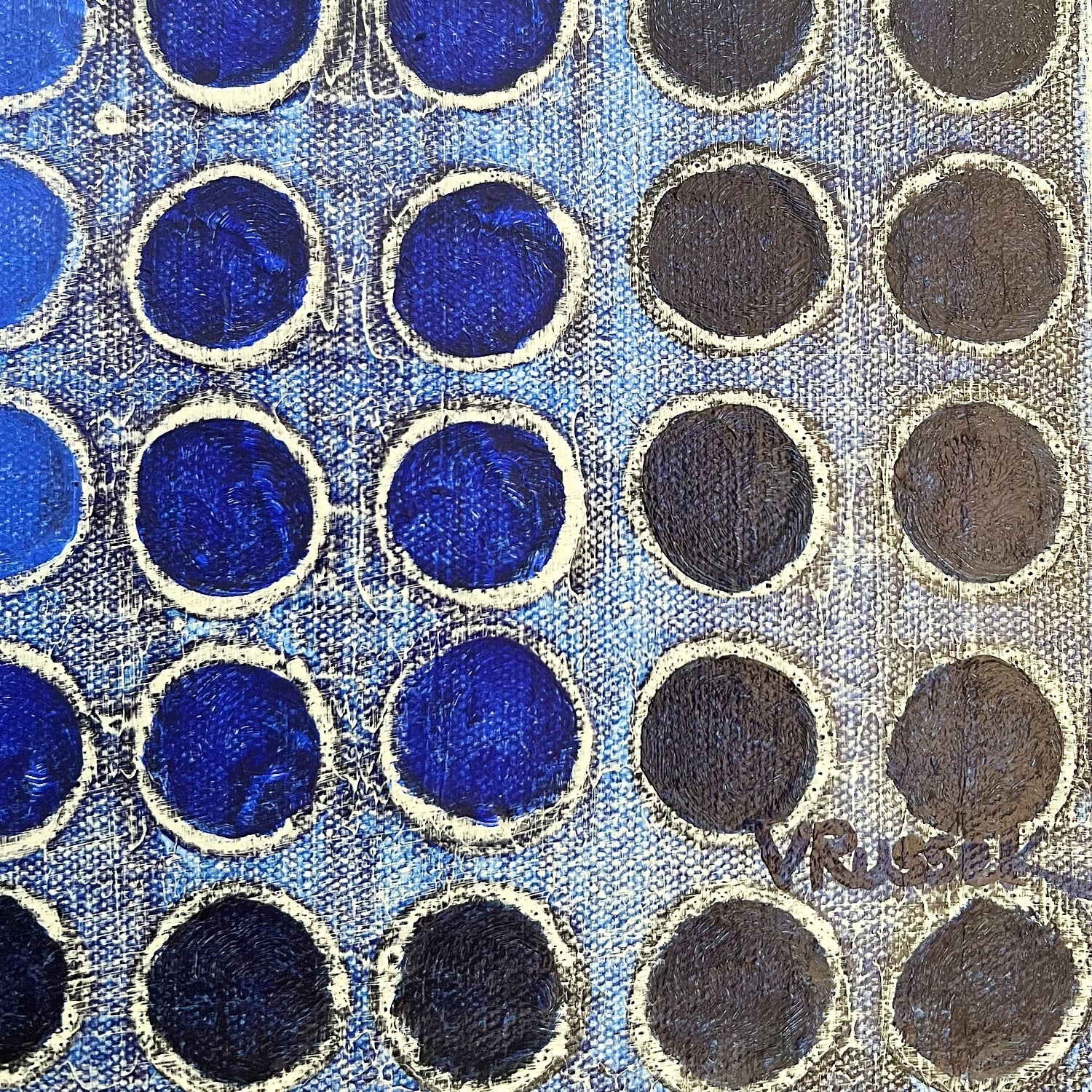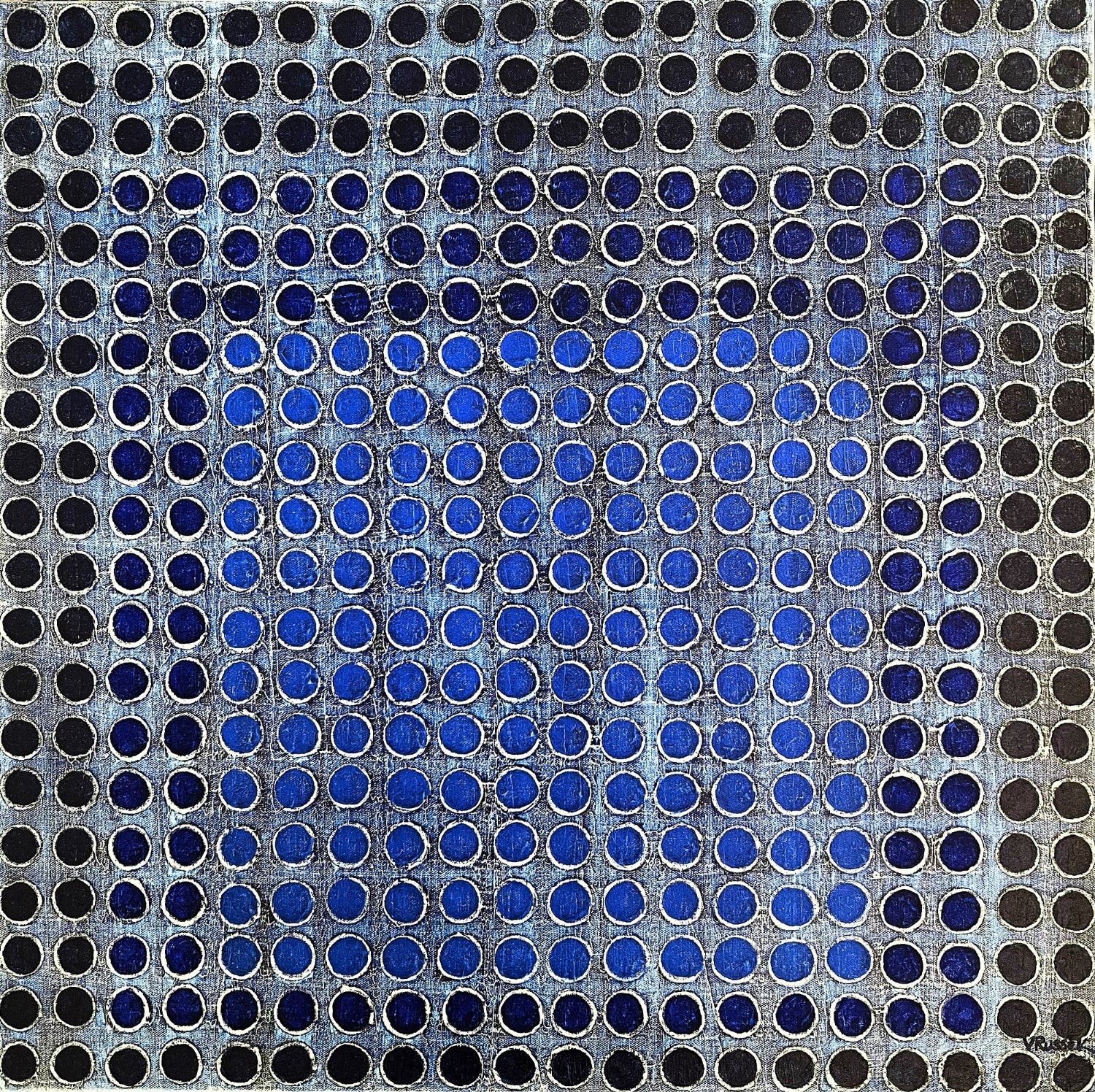 Obra en azules profundos, basada en la serie Homenaje al Cuadro de Josef Albers, pero muy a la manera de Verónica Russek. Los cuadros están hechos a base de una retícula de puntos, o bolitas, con mucha textura. Esta es una obra dinámica y moderna.
