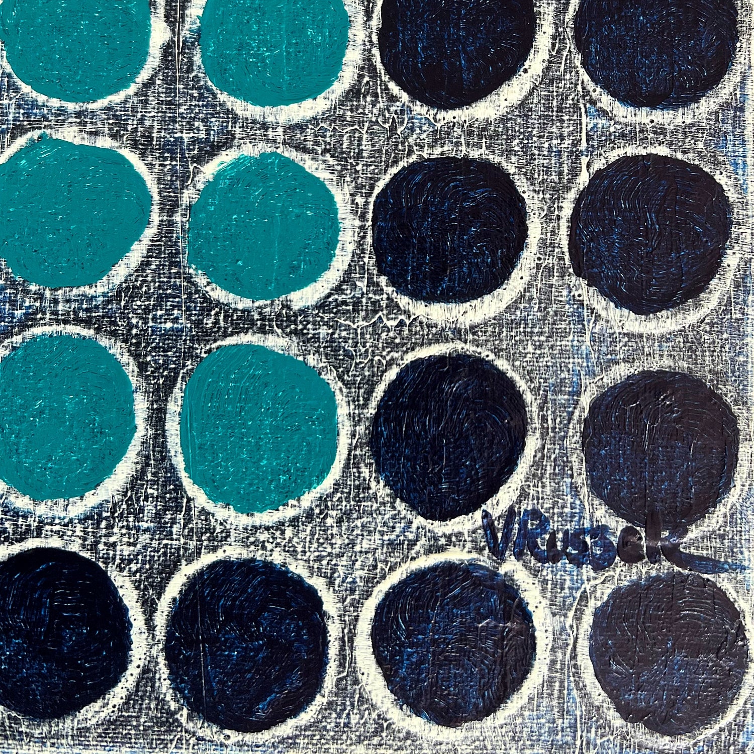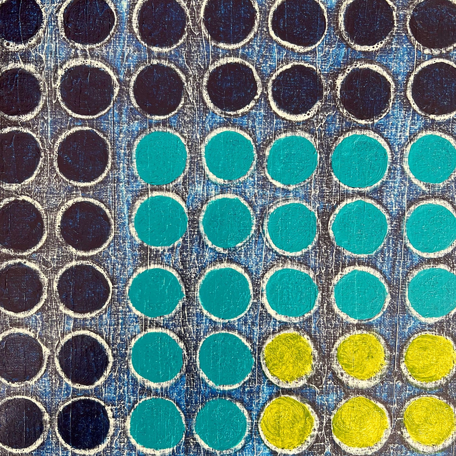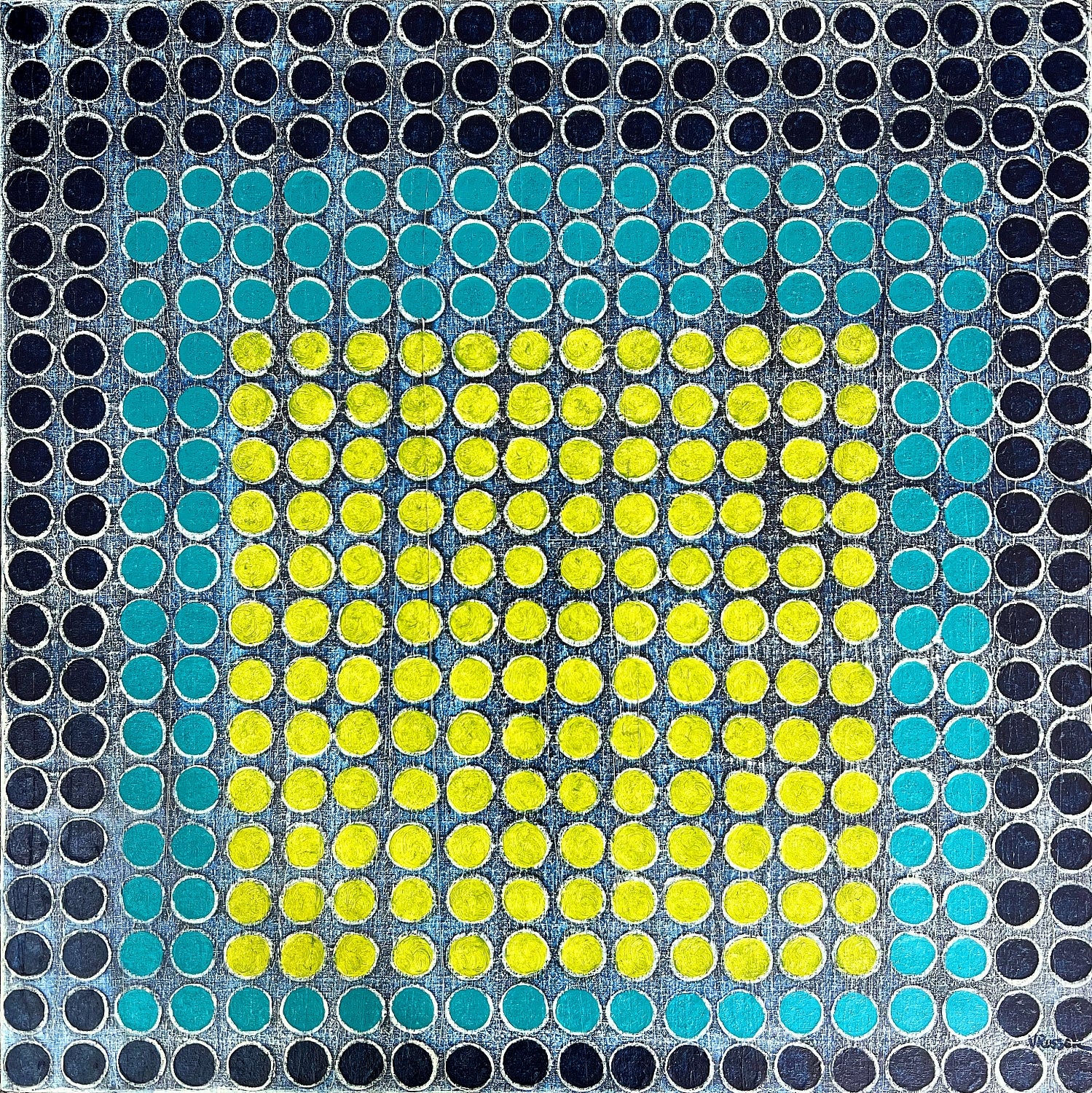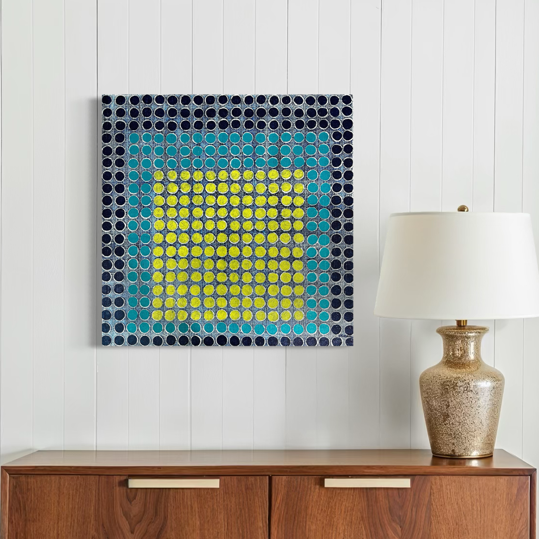 En esta obra, los puntos parecen vibrar entre el azul y el verde limón, creando un efecto de profundidad y movimiento. La retícula ordena el espacio, pero el color lo transforma: el centro resplandece, casi como si emitiera luz propia, mientras los bordes se van enfriando poco a poco. Es una pieza que juega con la energía visual, con la tensión entre el orden y la emoción del color.