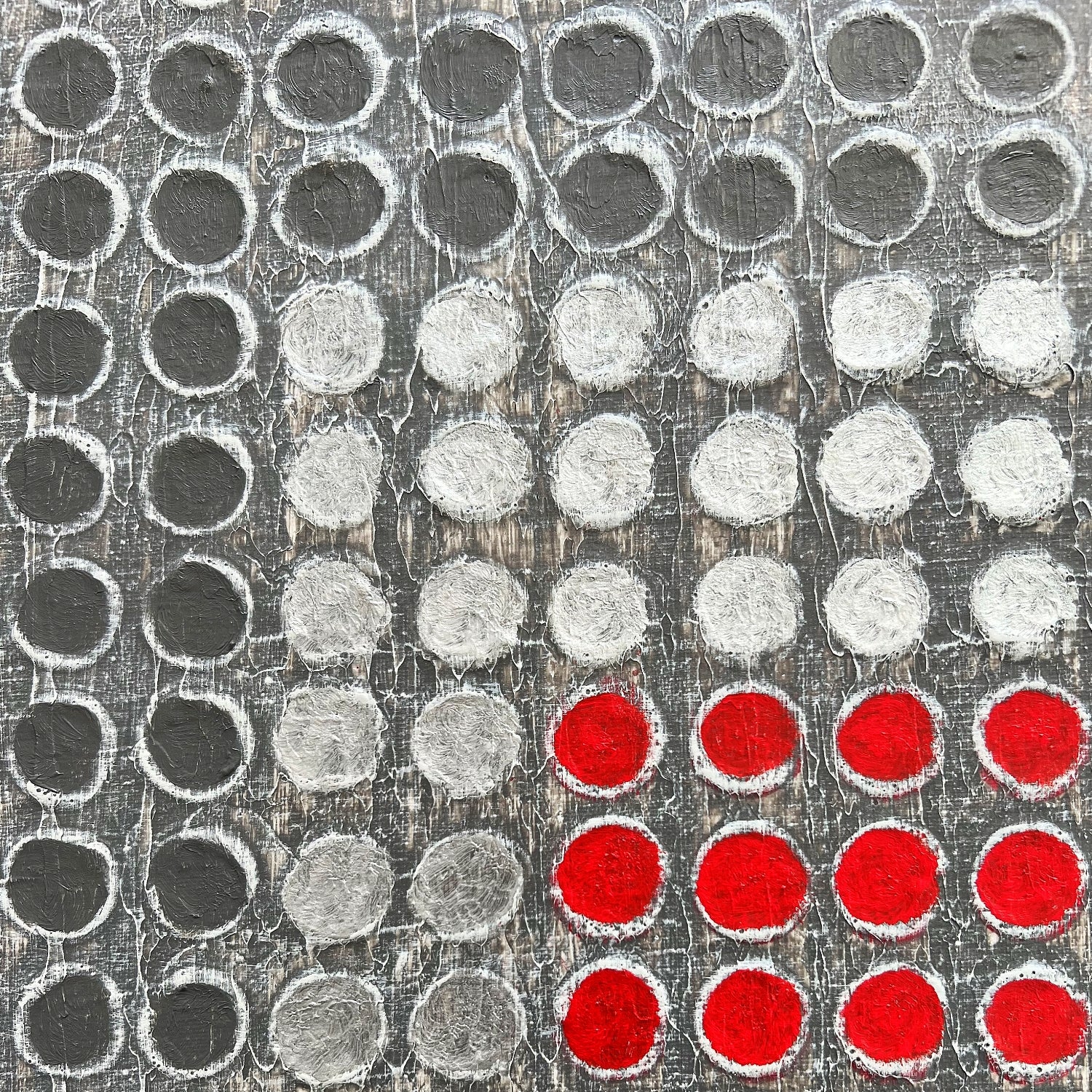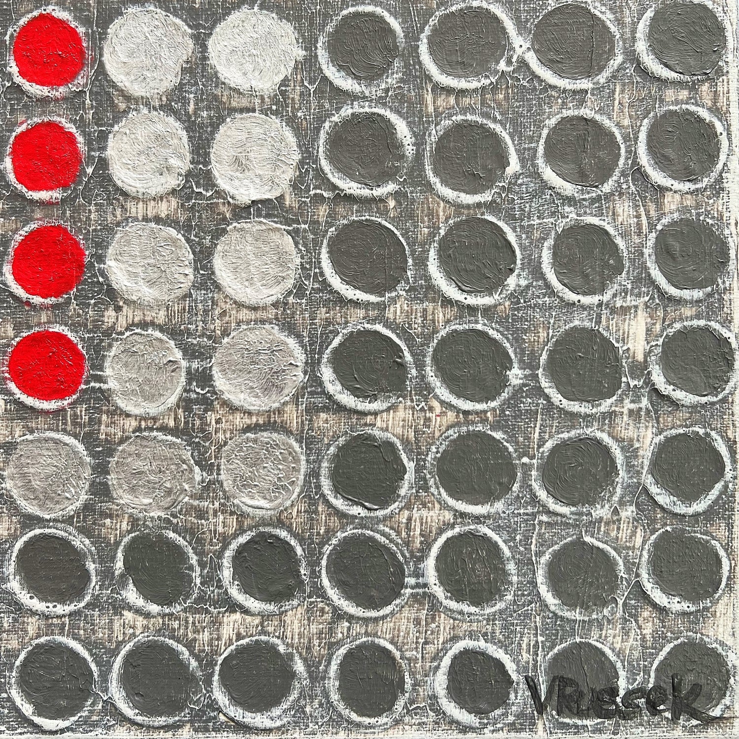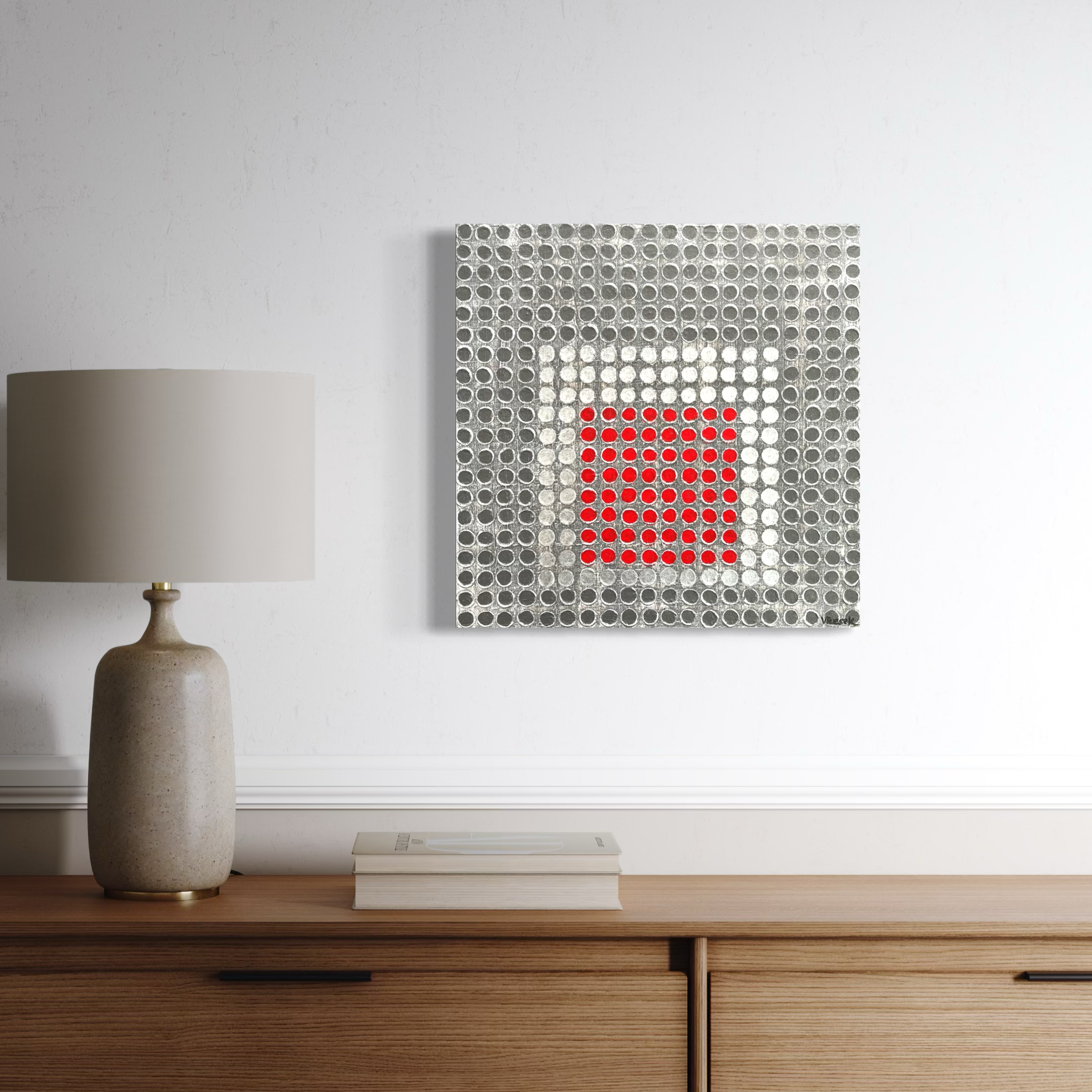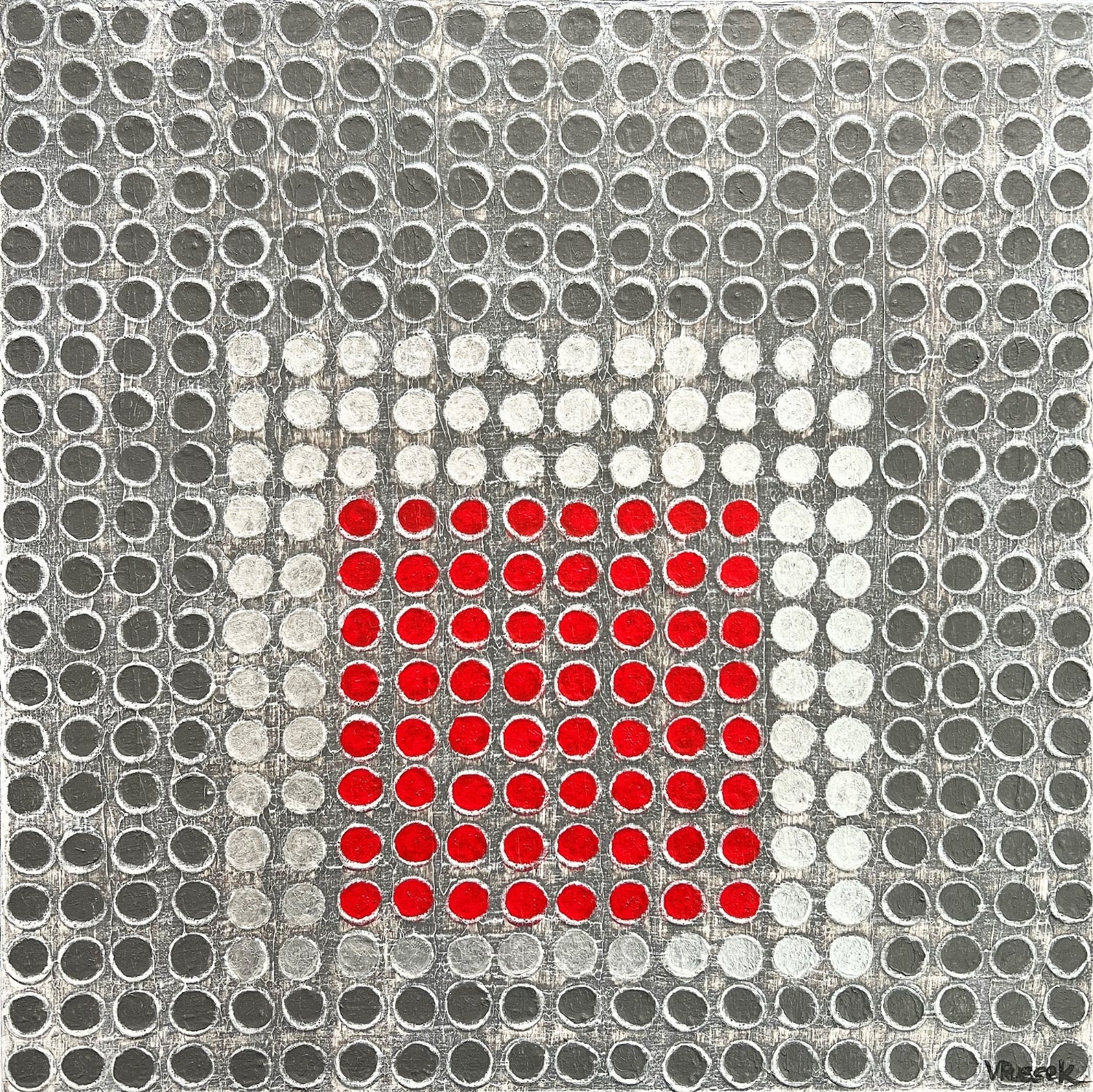 Retícula Radial 4, de la serie El Color como Centro, presenta una retícula en grises y plateados que enmarca un centro rojo vibrante. La obra explora cómo el color, al irrumpir en el corazón de la composición, se convierte en energía pura.