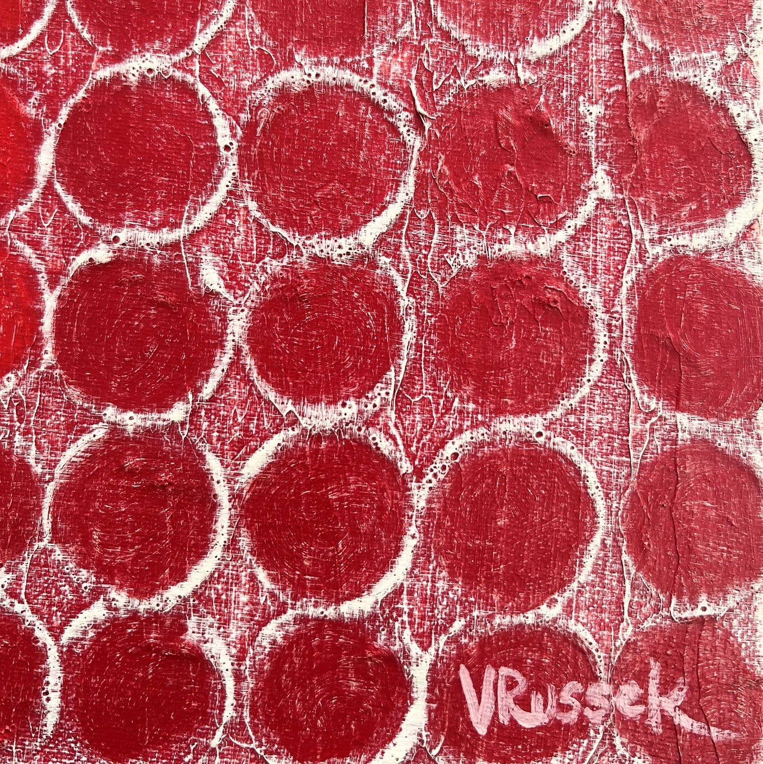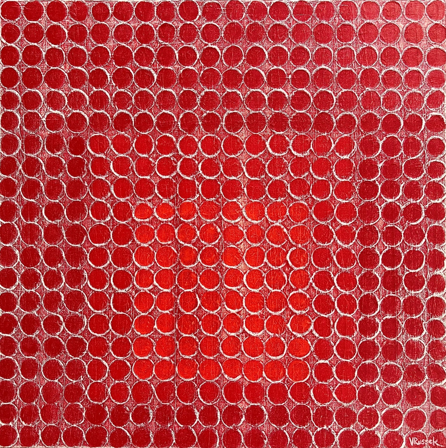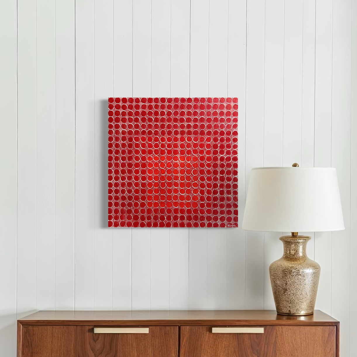 Obra al rojo vivo que es una retícula de puntos, dispuestos en cuadros de colores, haciendo alusión a la serie Homenaje al Cuadro, de Josef Albers. Esta obra es un estudio de tonalidades de Rojo Cadmio, con veladuras y capas de color para darle textura y mucha dimensión. El formato es muy versátil para colgar en cualquier espacio.