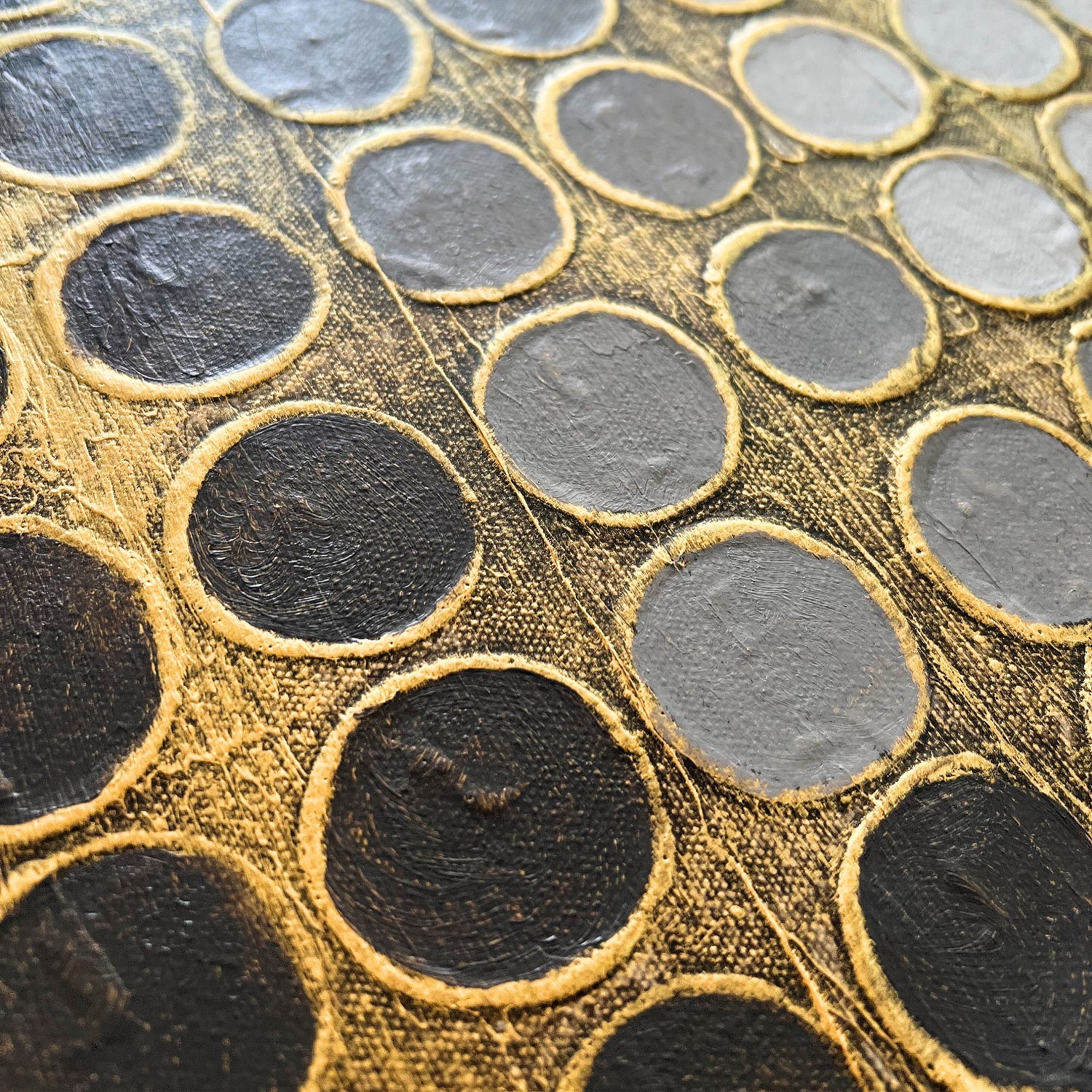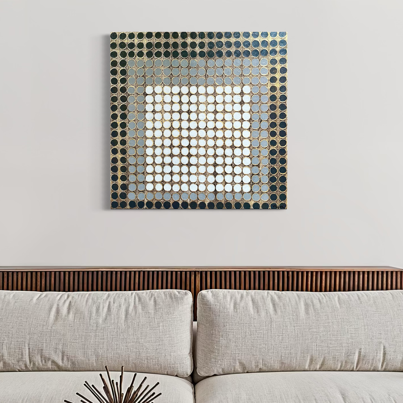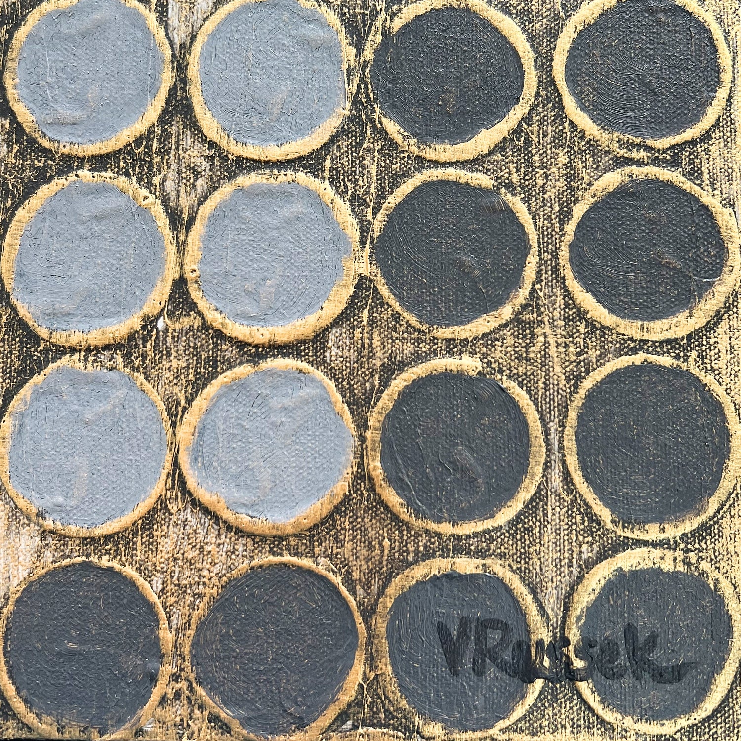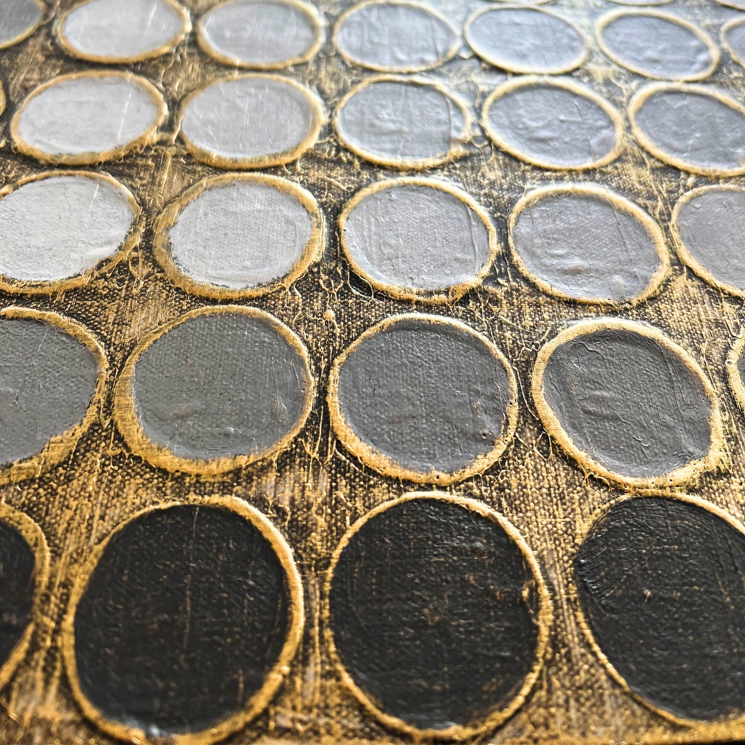 Retícula Radial 9 pertenece a la serie El color como centro. En esta obra, una gama de grises neutros crea un ritmo visual sereno y equilibrado, mientras que la textura dorada aporta calidez y luminosidad. Los círculos se organizan en una retícula que parece expandirse desde el centro, evocando movimiento y profundidad. Es una pieza que combina orden y energía, luz y sombra, con una elegancia sutil que invita a la contemplación.