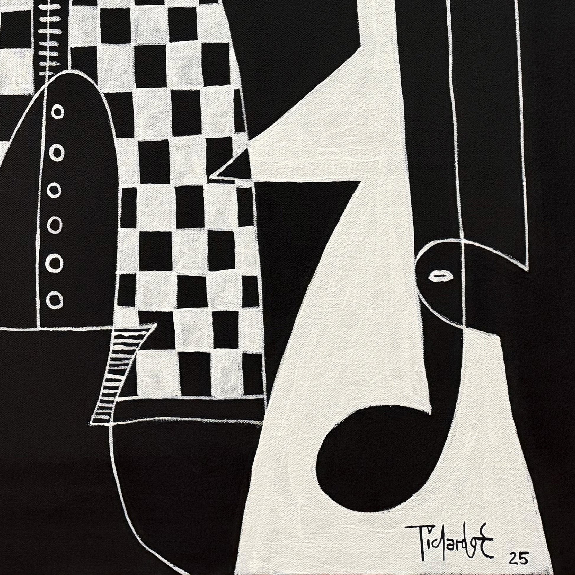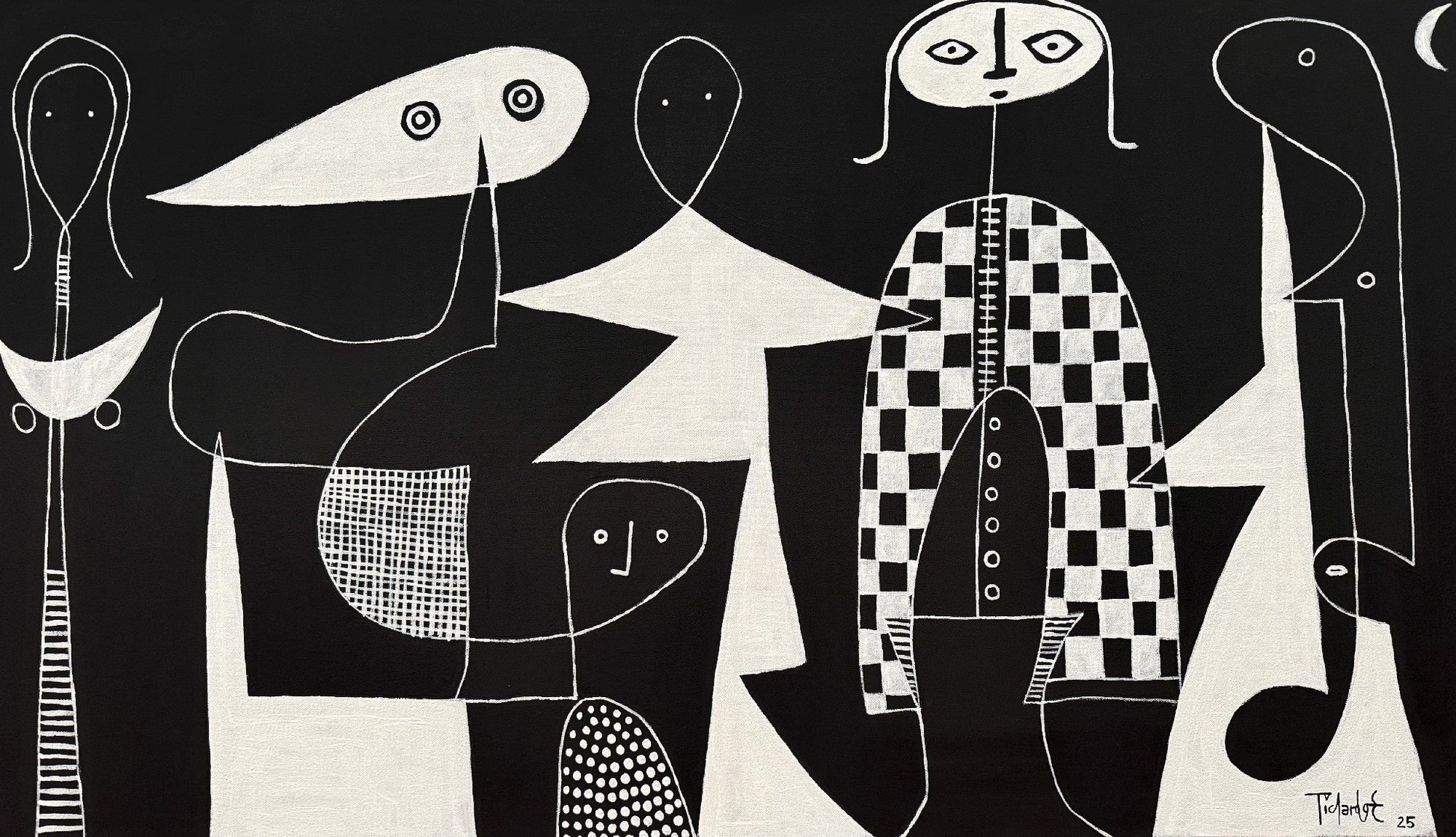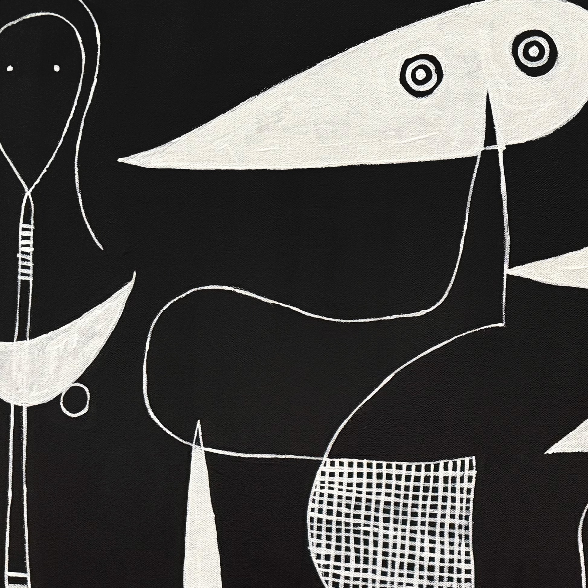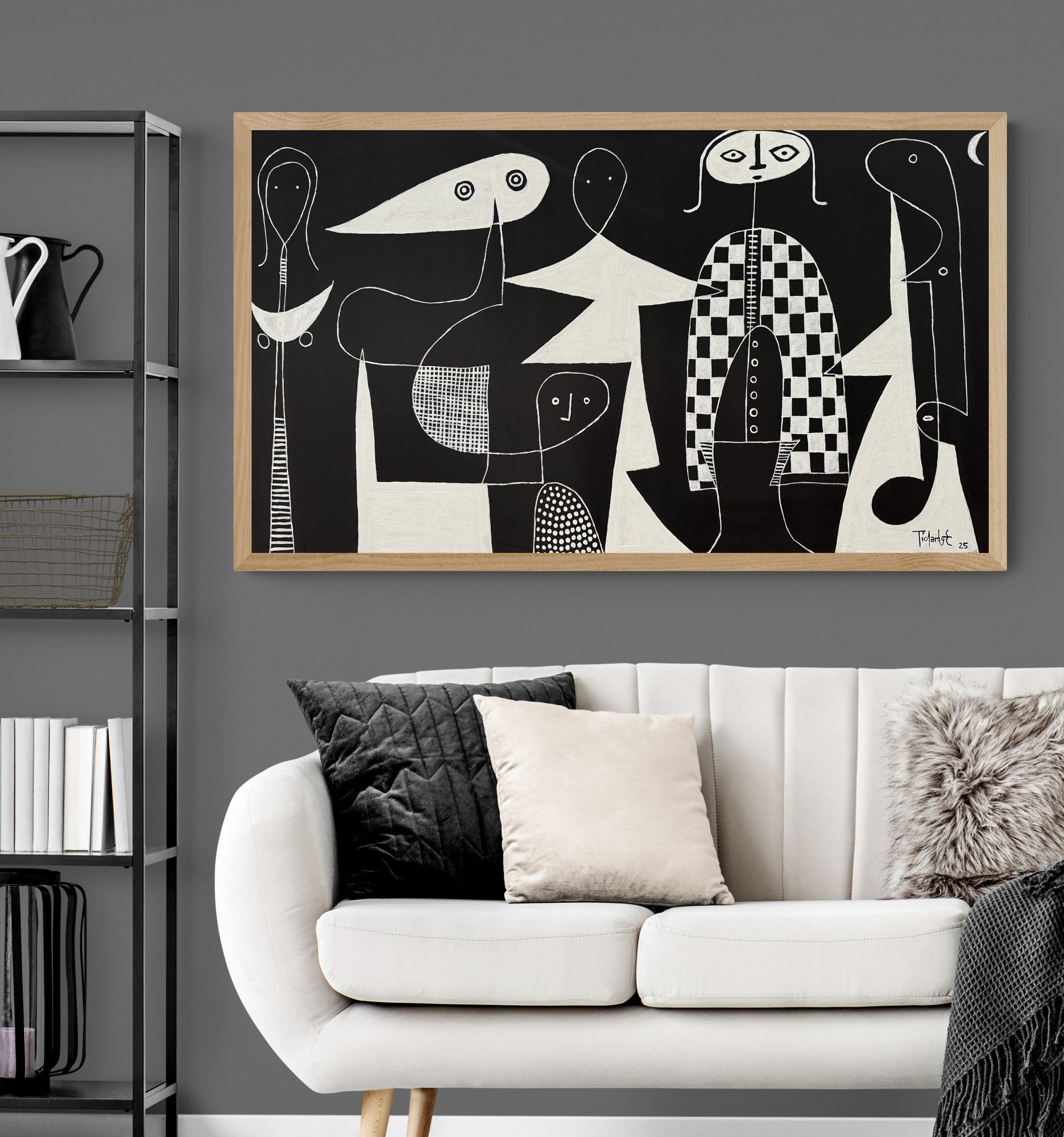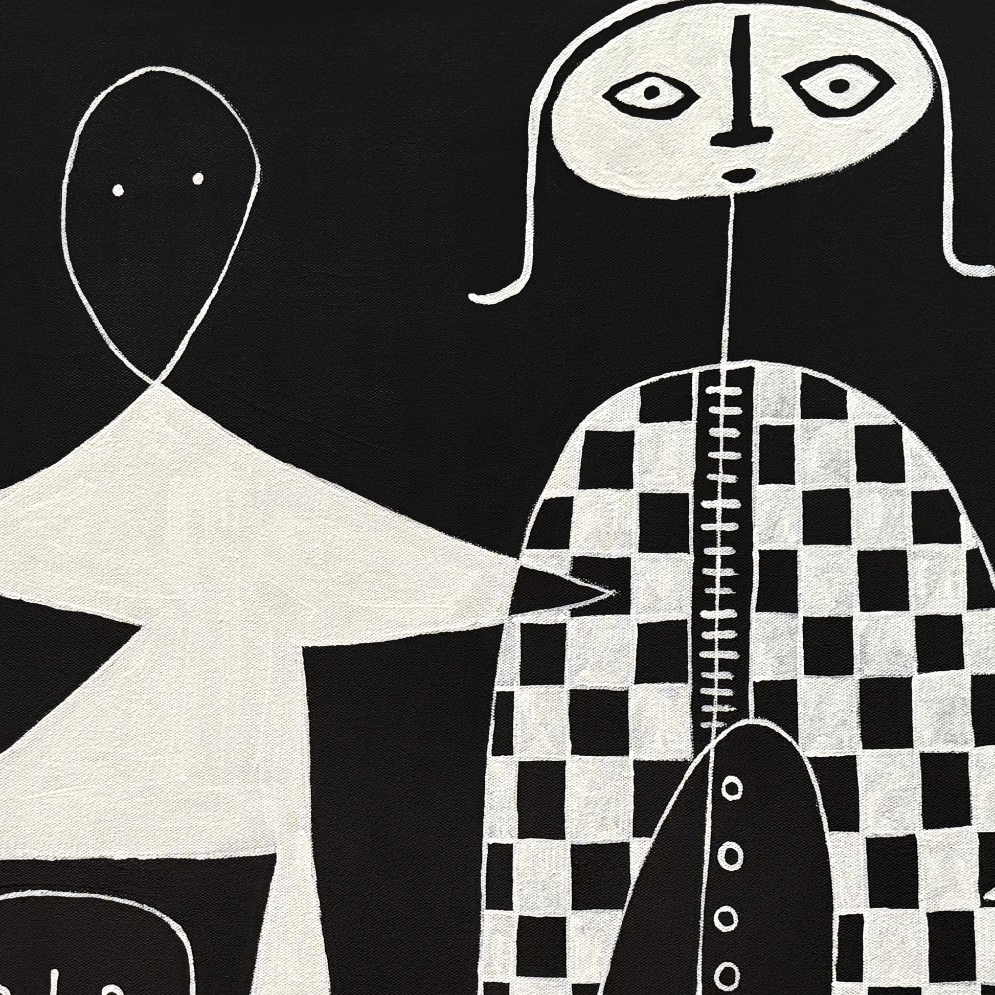 La estética monocroma otorga gran carácter a esta pieza. Predomina el contraste entre negro y blanco, lo que enfatiza el sentido gráfico del dibujo. Figuras con torsos cuadrados, cabezas ovaladas y miradas simbólicas aparecen distribuidas en equilibrio, mientras la repetición de motivos reticulares y patrones de tablero aporta textura visual a la composición. El formato horizontal potencia la lectura narrativa y propone un ritmo visual que conecta cada figura con la siguiente en un diálogo misterioso.