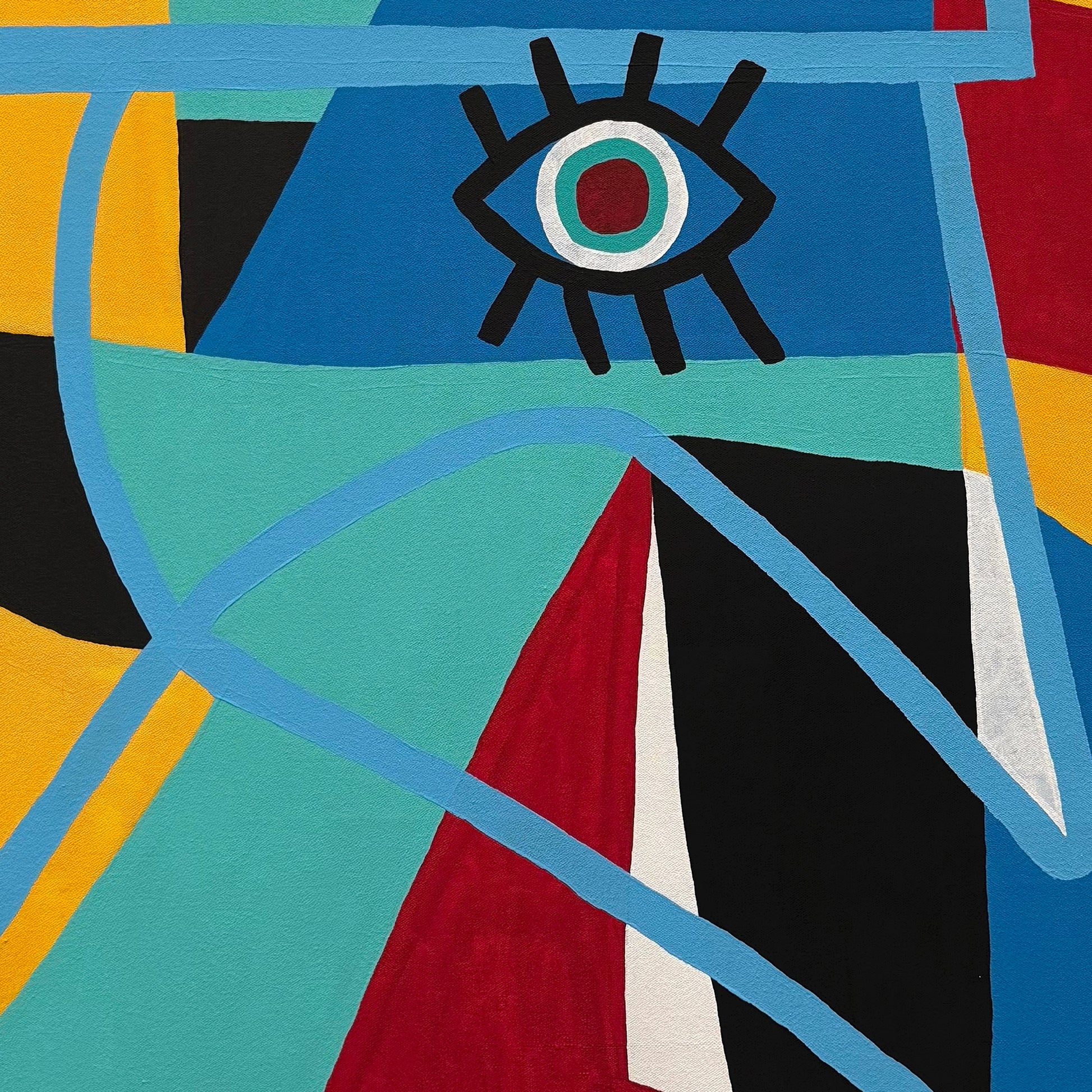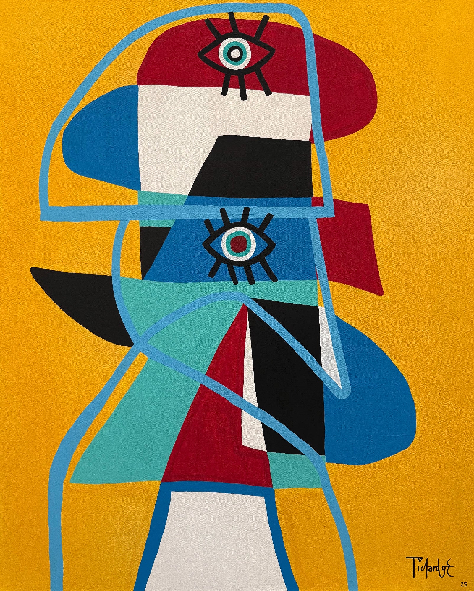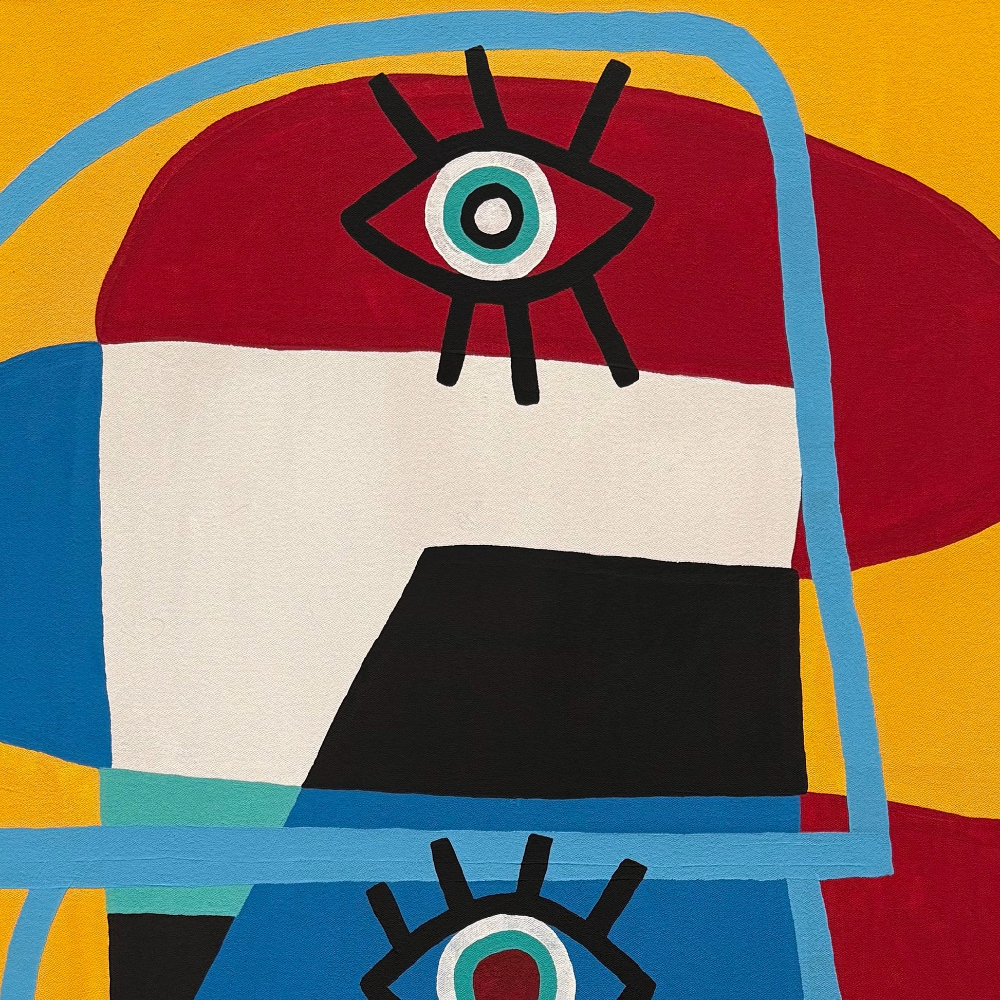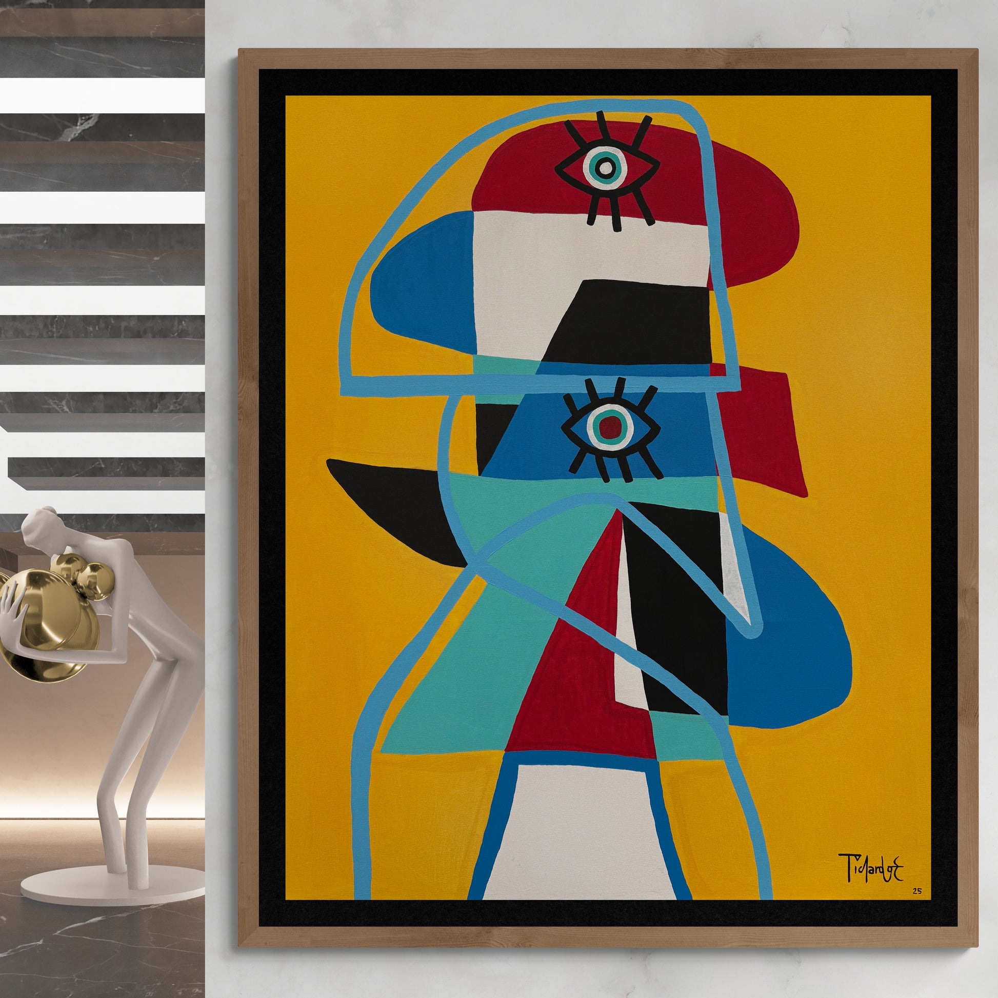 La obra se organiza mediante planos geométricos superpuestos y líneas curvas que crean contornos definidos. El contraste entre el amarillo intenso del fondo y los colores planos de las figuras genera profundidad y dinamismo sin recurrir a sombras. Los ojos centrales se convierten en un punto de atención que guía la mirada del espectador y añade simbolismo a la composición. Cada línea y color parece responder a un ritmo interno que combina equilibrio y energía visual.