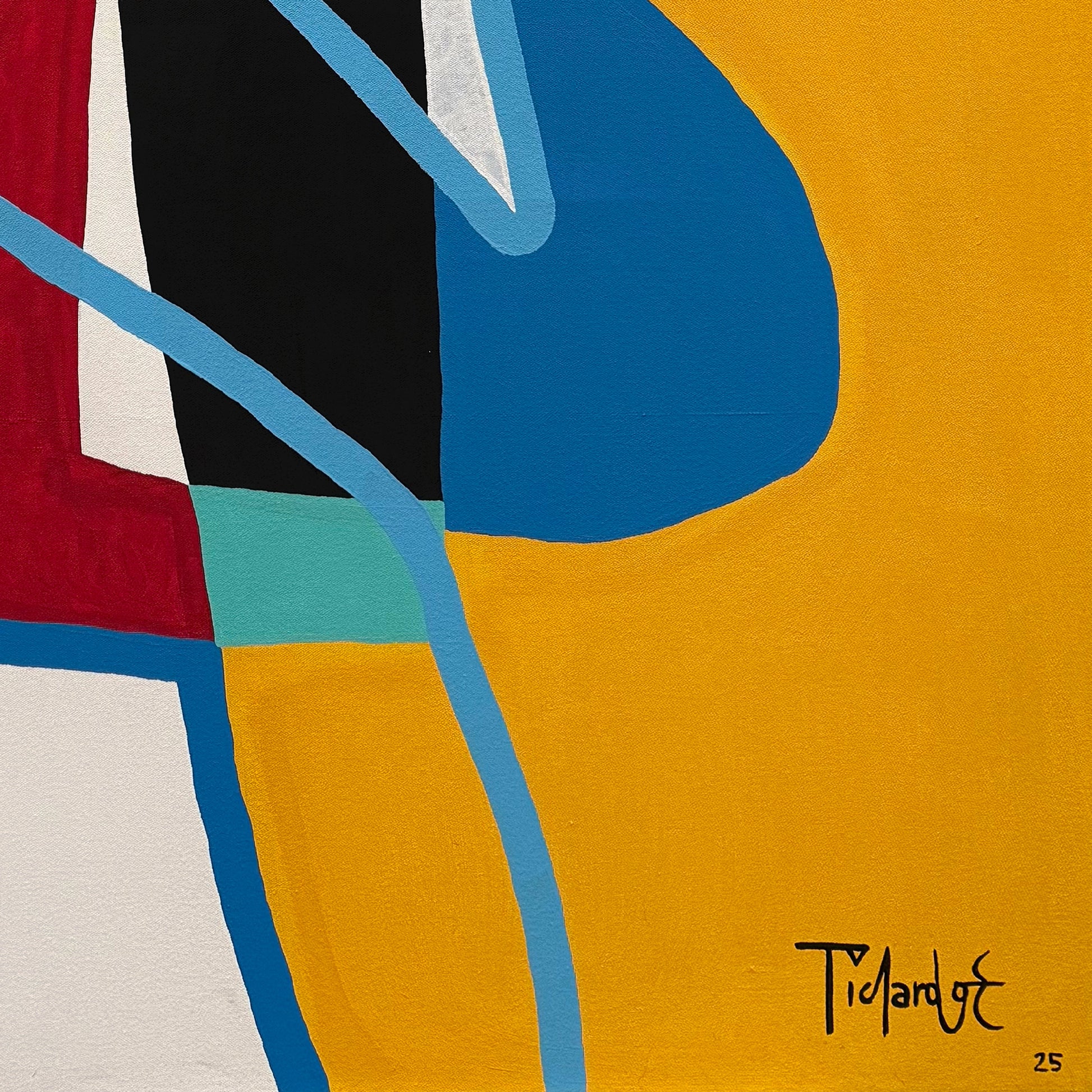 El Retrato en fondo amarillo del artista Enrique Pichardo es una pintura en acrílico sobre tela de 122 × 152 cm que cautiva por su intensidad y síntesis formal. Un fondo amarillo brillante sirve de escenario para figuras geométricas en rojo, azul, negro, blanco y turquesa. Dos ojos delineados en negro ocupan el centro de la composición, generando un equilibrio entre la abstracción y la carga expresiva de la pieza. El trazo del artista es seguro y fluido, transmitiendo una sensación de espontaneidad y vitalidad que caracteriza su estilo.