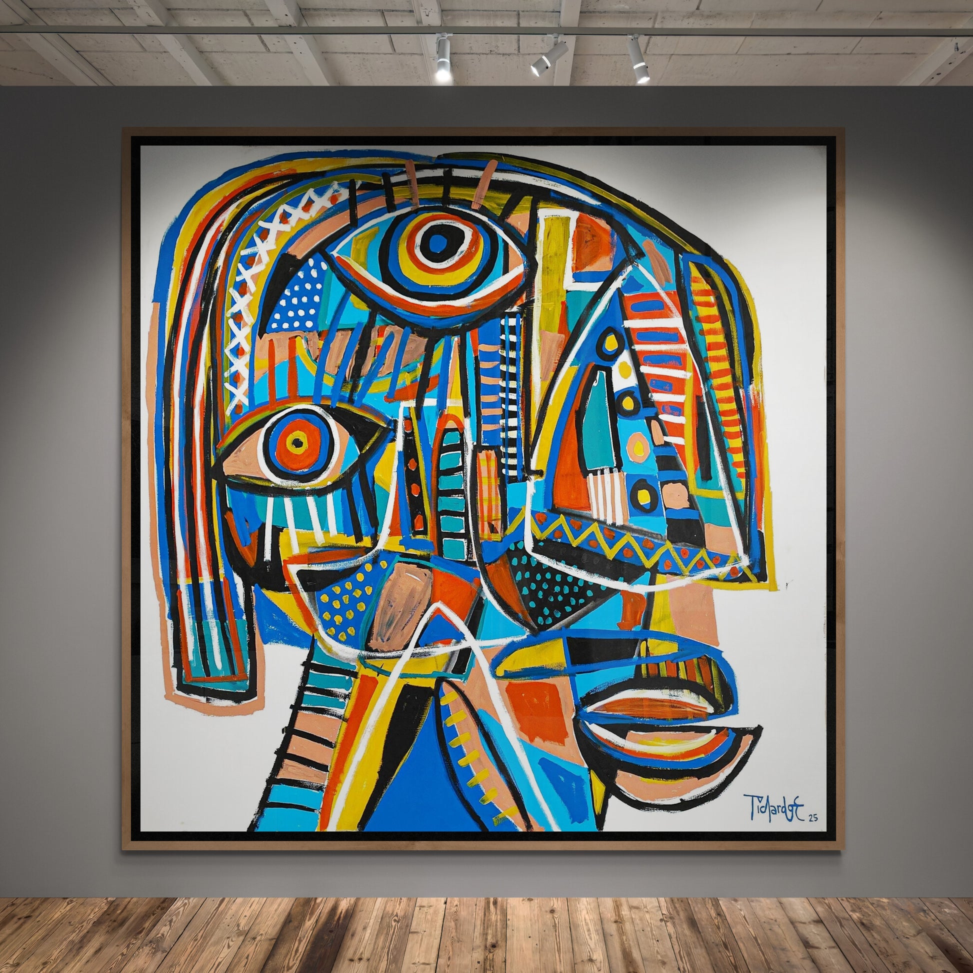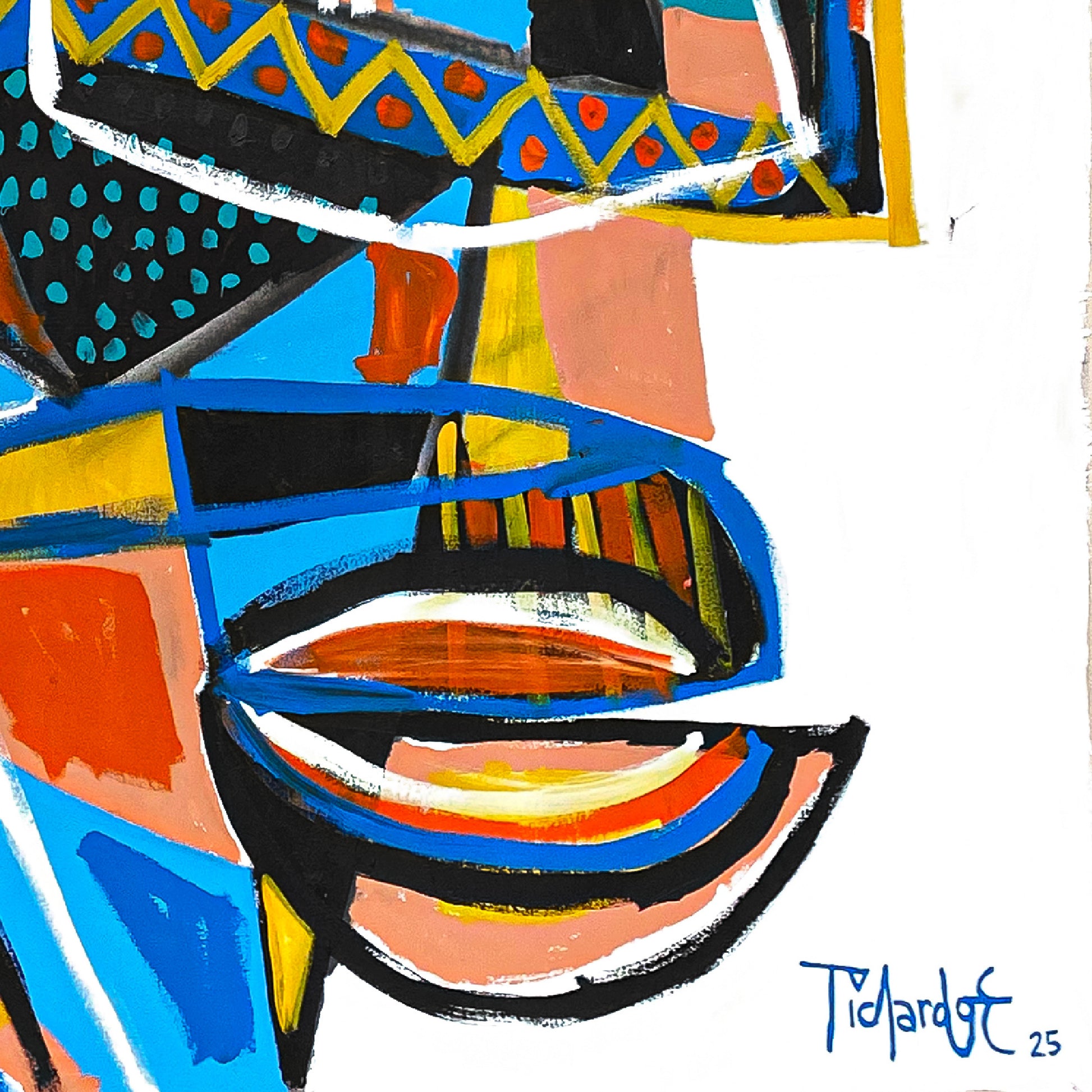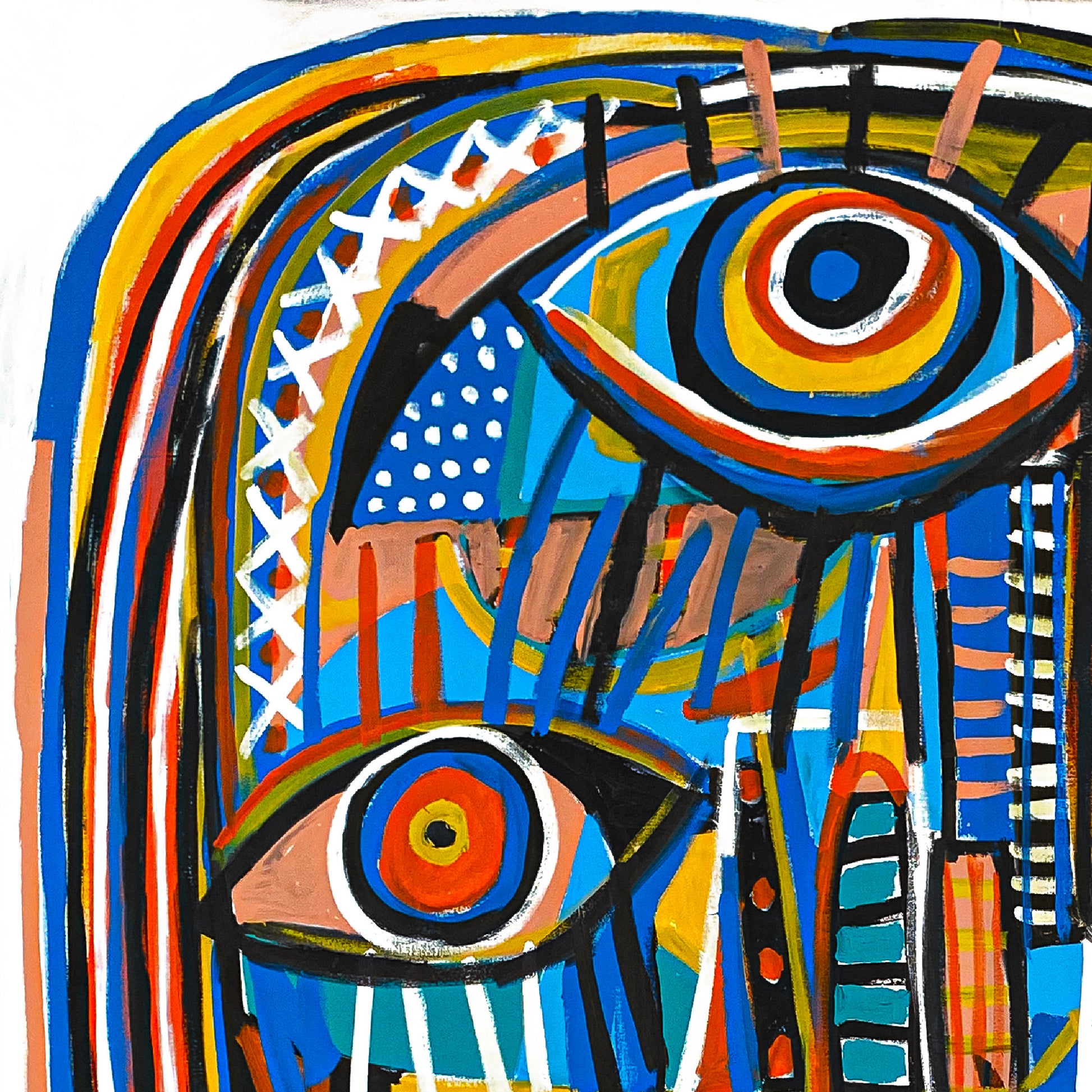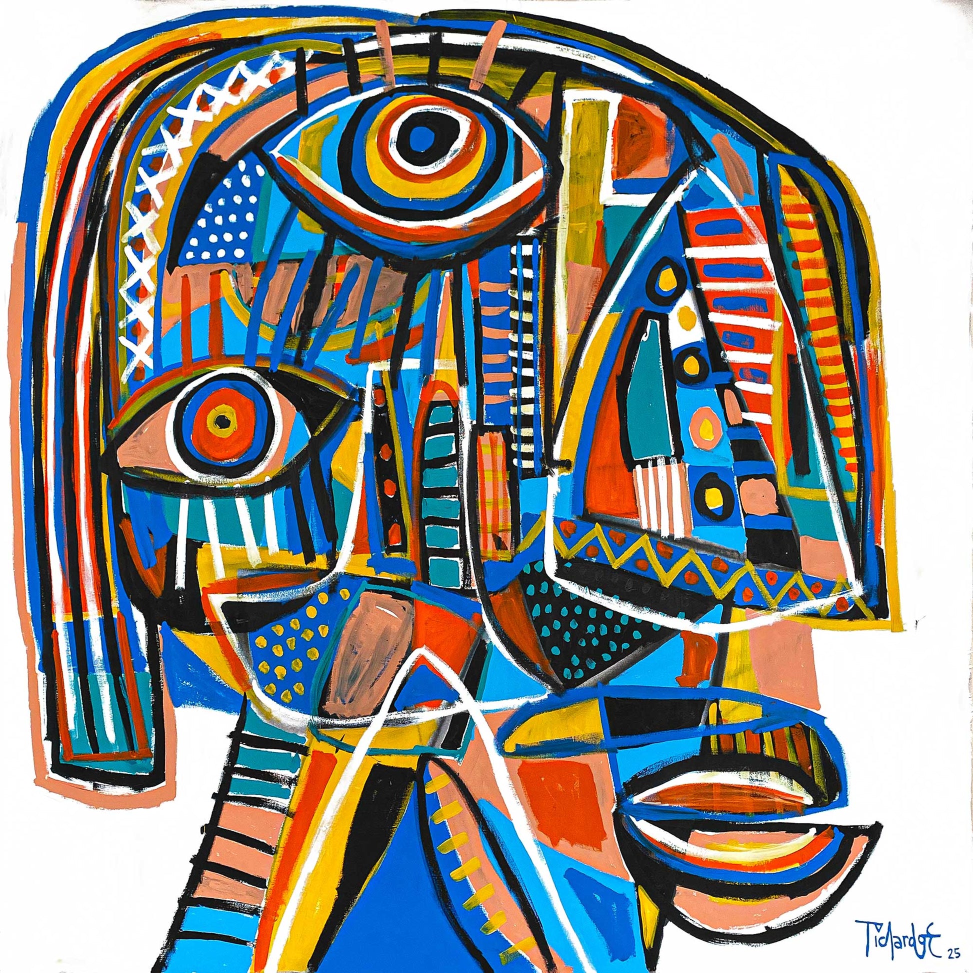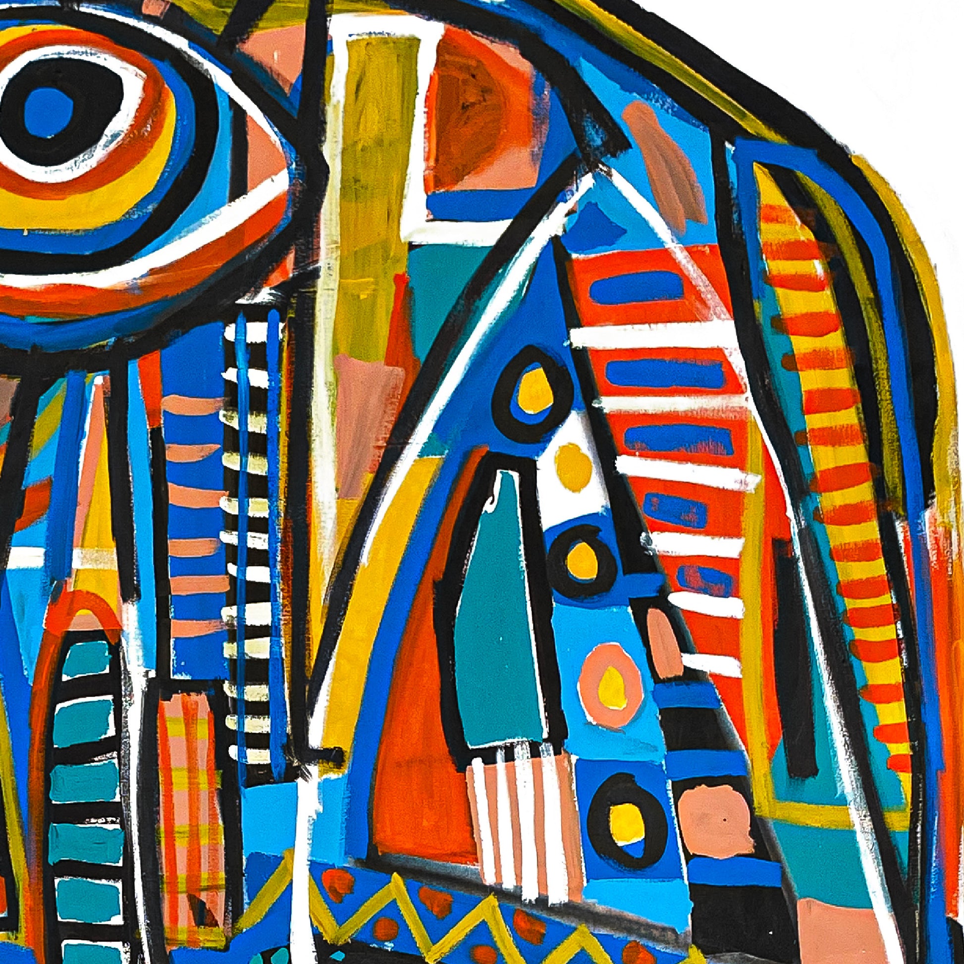 La estructura de la obra ofrece un retrato no convencional, combinando formas reconocibles con trazos abstractos. Además, su lenguaje pictórico integra símbolos de inspiración precolonial, lo que genera un juego visual lleno de matices. A través de su trazo espontáneo, el artista logra conectar con una fuerza creativa libre de formalismos rígidos.