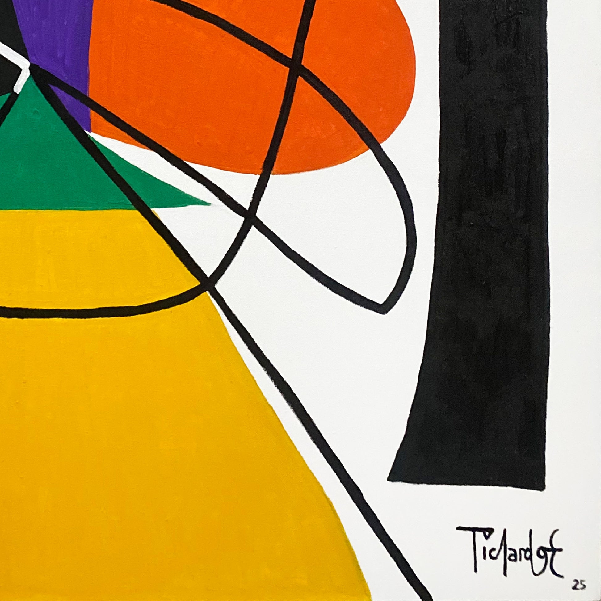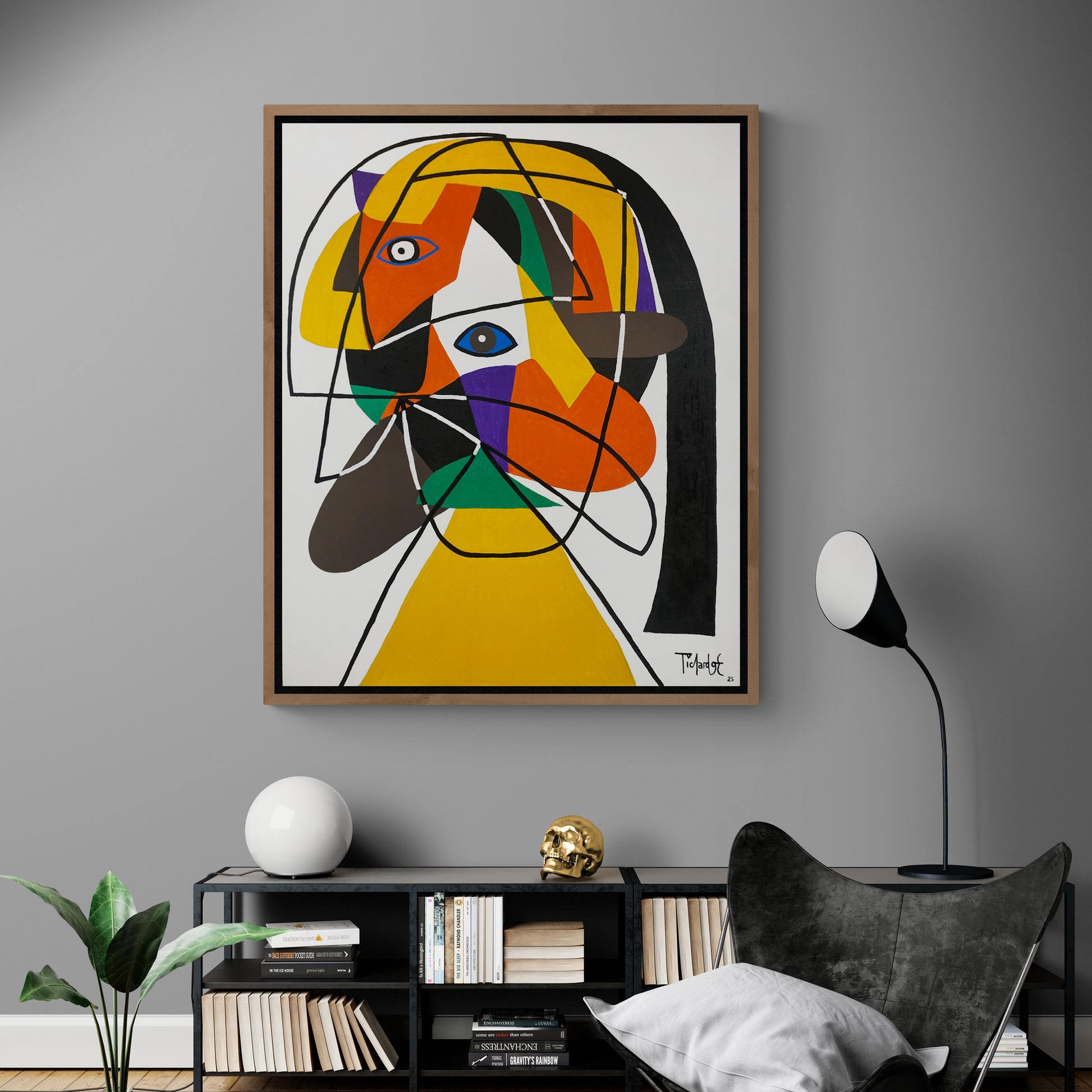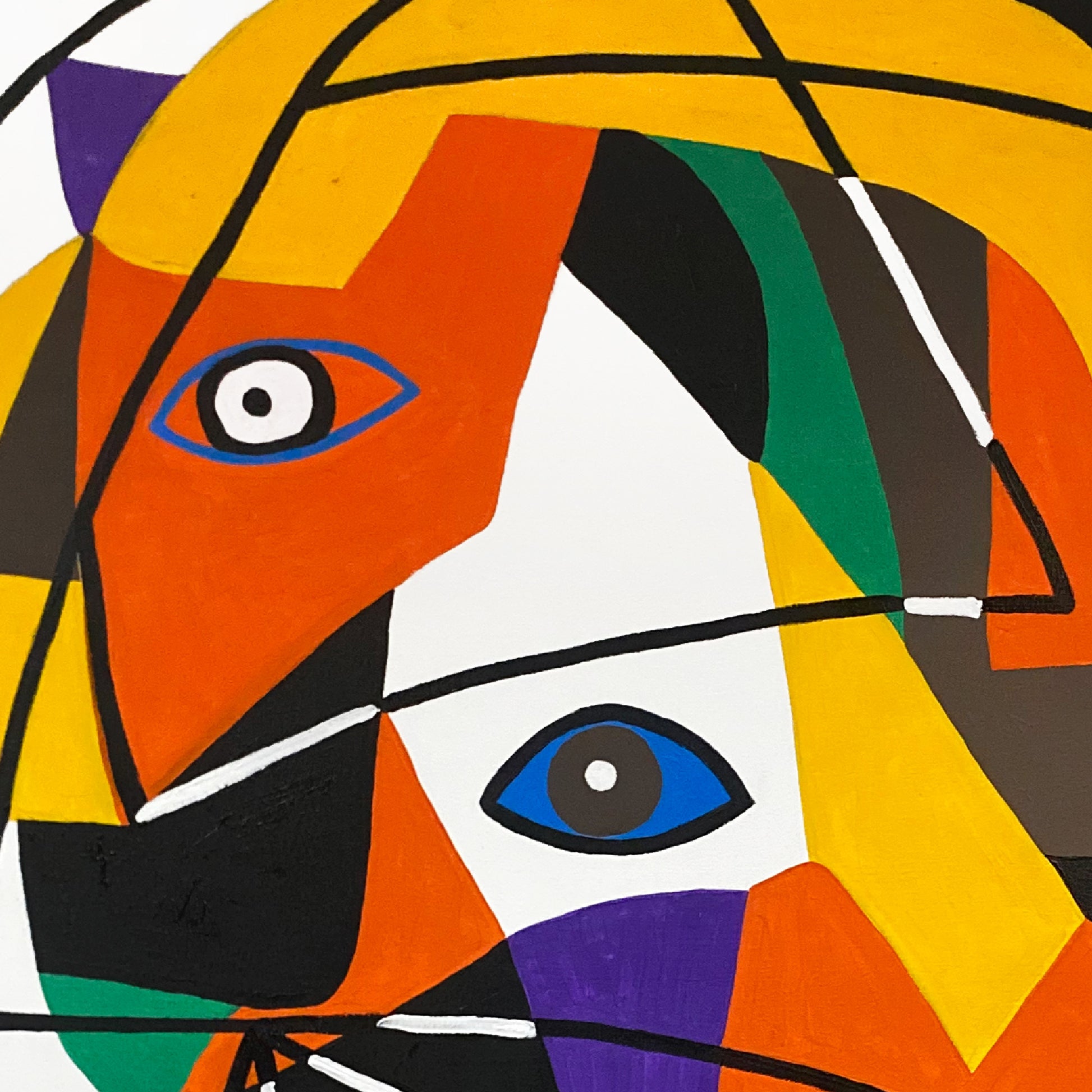 En Retrato en fondo blanco pieza de Enrique Pichardo, el lienzo se convierte en un campo de experimentación donde la abstracción figurativa sustituye al realismo tradicional. Esta obra de 122 × 152 cm, realizada en acrílico sobre tela, forma parte de la serie de retratos del artista y despliega un lenguaje visual que evoca tanto las máscaras mexicanas como la estética artesanal reinterpretada en clave contemporánea. Superposición de formas, contraste de planos y una paleta dominada por blancos y negros con acentos cálidos en naranja y violeta generan una atmósfera cargada de energía lúdica.