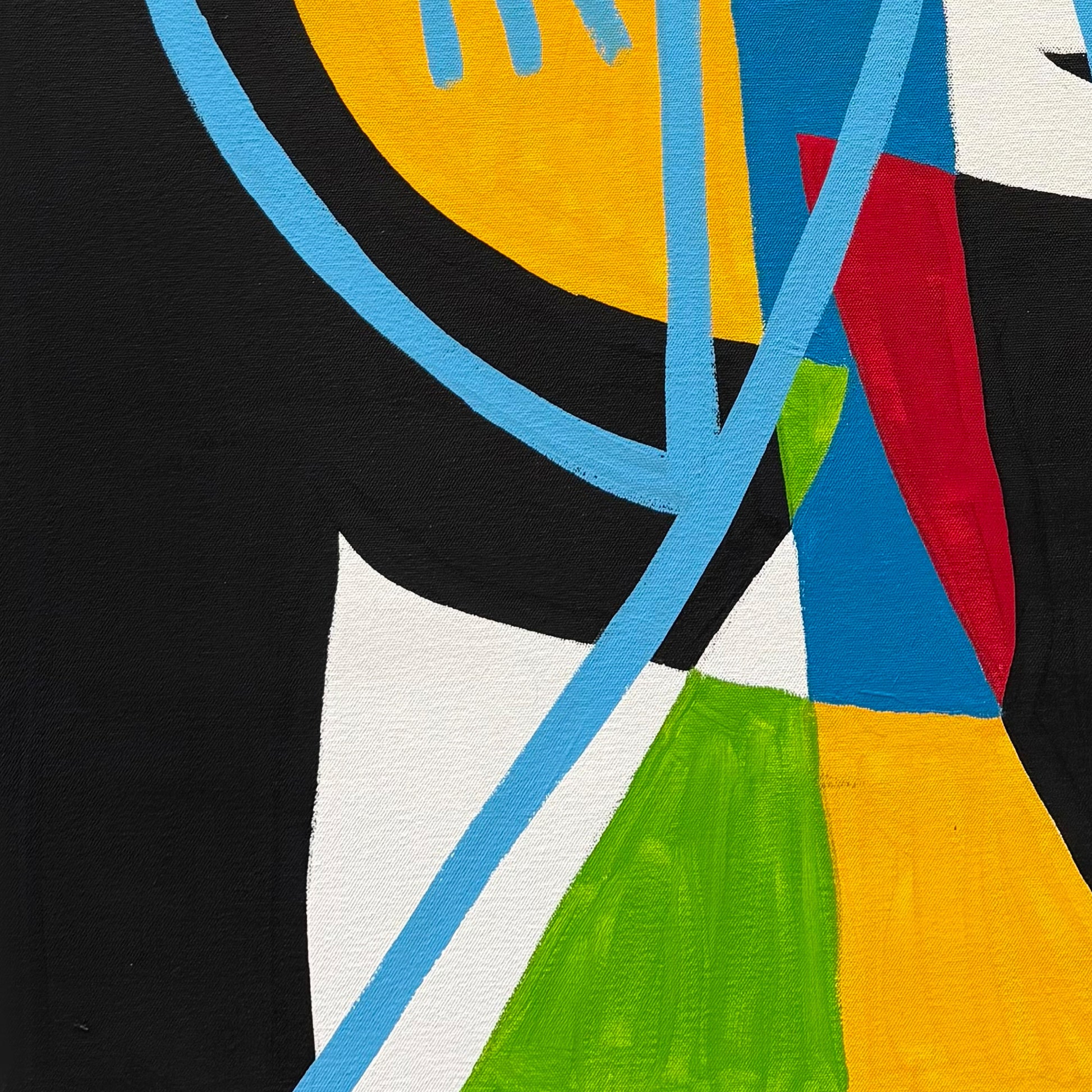 La obra Retrato en fondo negro del artista Enrique Pichardo (75 x 100 cm, acrílico sobre tela) representa un ejemplo magistral del arte contemporáneo mexicano. Sobre un fondo negro profundo, destacan figuras geométricas en rojo, amarillo, verde y azul, delineadas por trazos vibrantes en azul turquesa. El rostro fragmentado adquiere un carácter enérgico y lúdico, donde cada línea transmite frescura y movimiento, alcanzando un equilibrio entre la sencillez de las formas y la intensidad cromática.