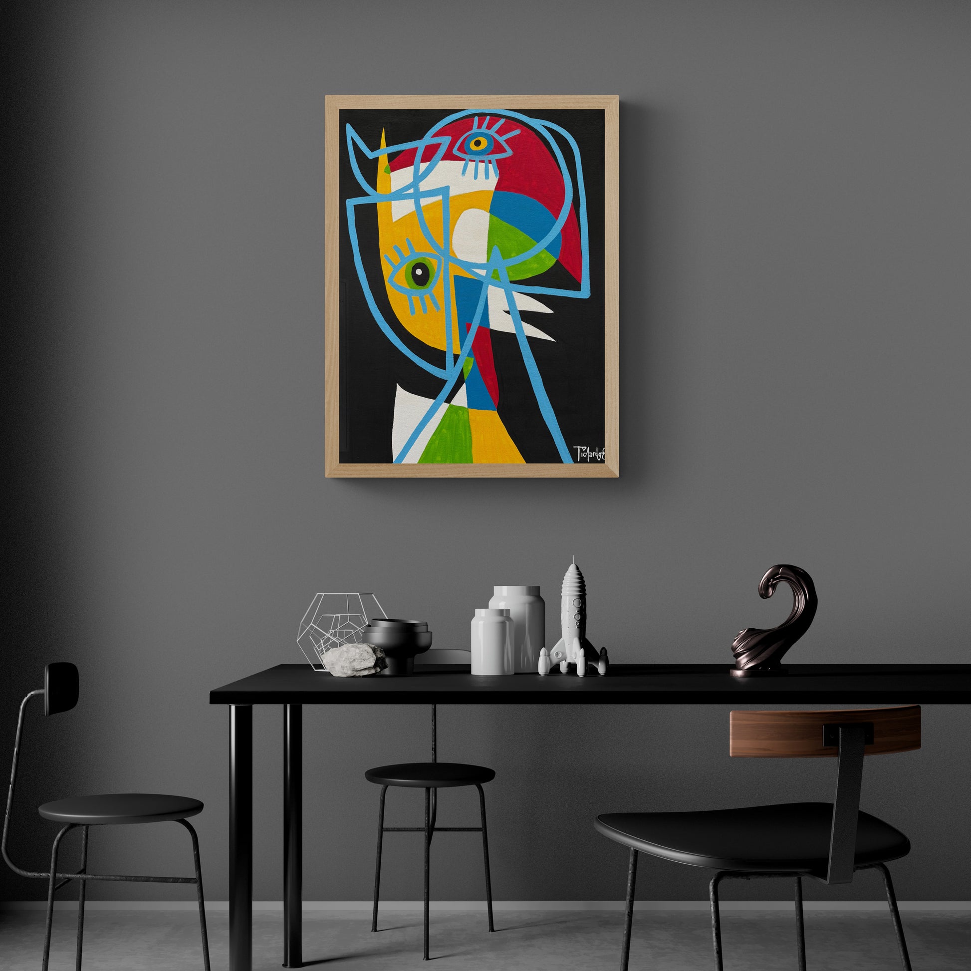 La obra se organiza a partir de planos geométricos que se superponen con libertad. Dos ojos, delineados en azul con trazos firmes, dominan la composición y sugieren una mirada múltiple y fragmentada. La tensión entre los bloques de color y el fondo oscuro genera un efecto de profundidad y dramatismo. Este lenguaje simbólico conecta más con la emoción y el juego que con la representación literal, evocando la energía de Pablo Picasso en su etapa cubista y la intensidad cromática de Joan Miró.