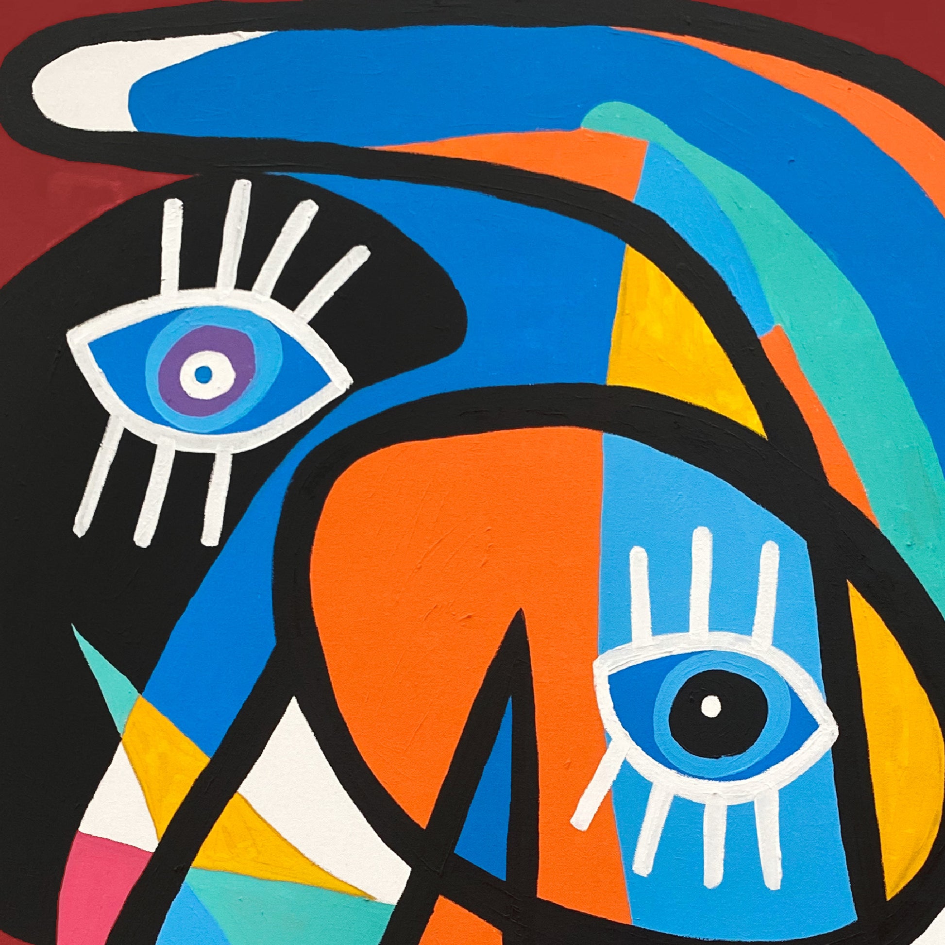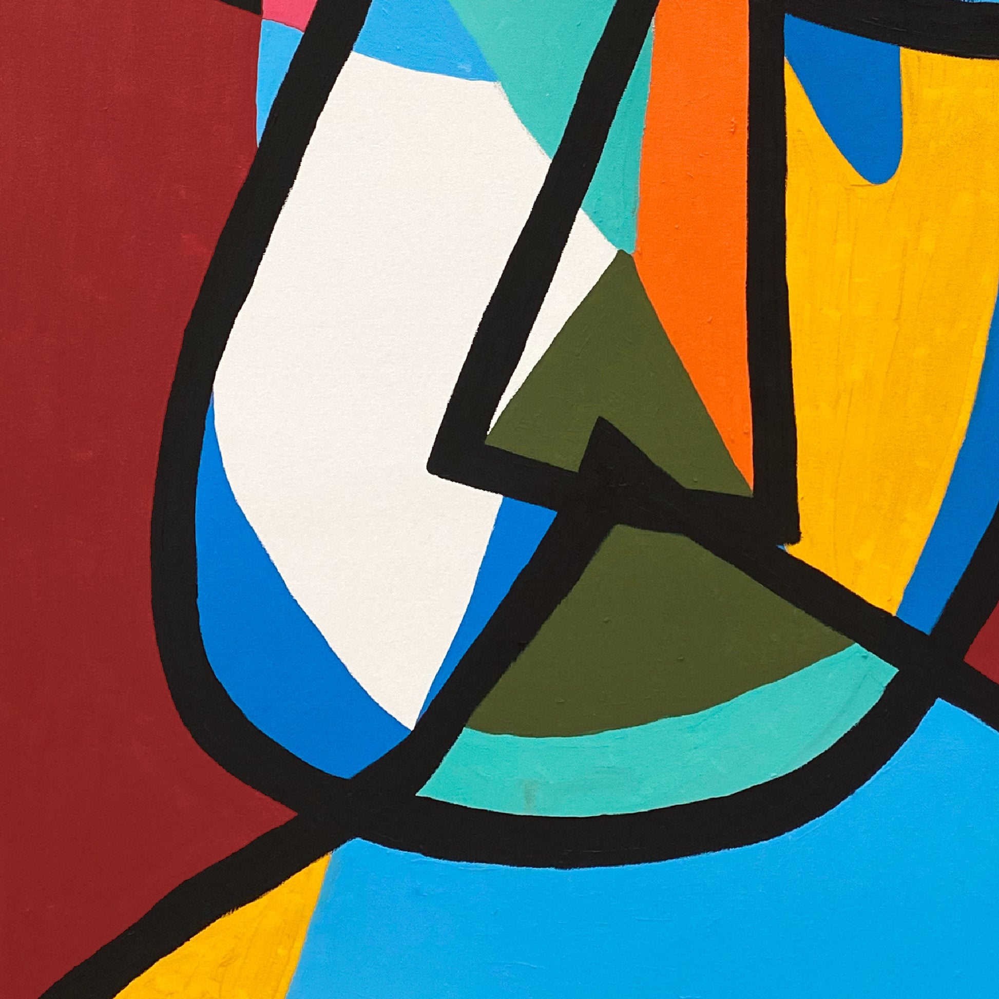 Retrato en fondo rojo pieza de Enrique Pichardo es una obra de 122 × 152 cm, realizada en acrílico sobre tela, que forma parte de una serie de retratos donde la abstracción figurativa se entrelaza con la herencia de las máscaras tradicionales mexicanas. El fondo rojo, intenso y dominante, establece el tono emocional, mientras figuras superpuestas y simplificadas transmiten un lenguaje más simbólico que realista.