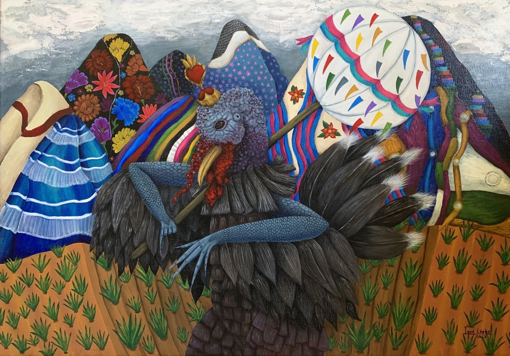 Los cerros al fondo de esta obra representan las diversas regiones de Oaxaca y sus trajes emblemáticos. Al frente nuestro personaje principal “El Rey Guaje”, pues en todas las fiestas importantes este animalito (el guajolote) es el protagonista de la gastronomía.