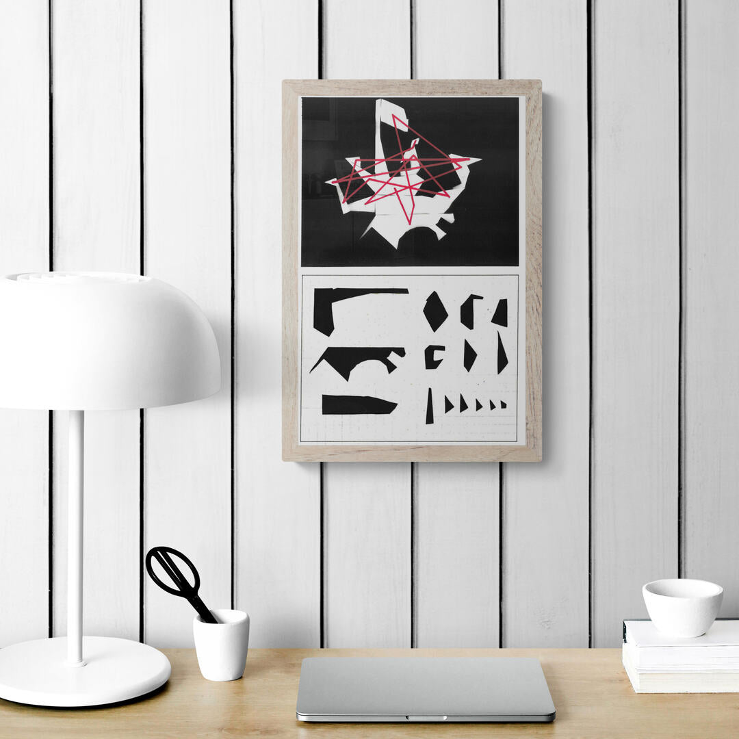 Después, partiendo de este orden, los fragmentos fueron unidos en las composiciones mediante una línea roja que seguía el criterio de clasificación previa. Esto dio como resultado un tipo imprevisto de visualidad en las composiciones iniciales.