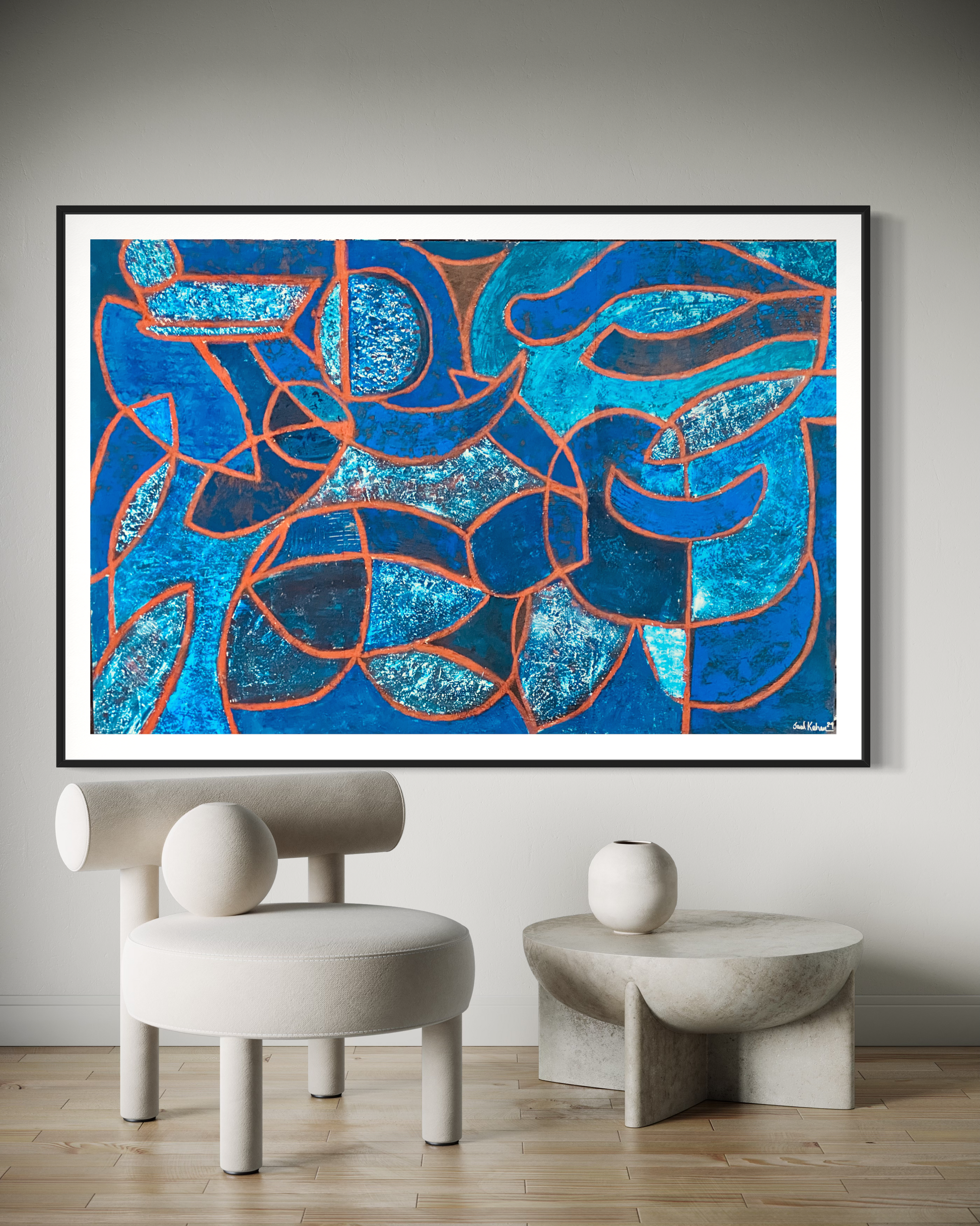 Abstracto en amalgama de azules y terracota en técnica de acrílicos engrosados y texturizados. VENDIDO/ SOLD