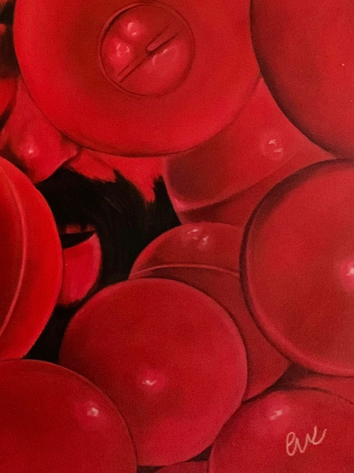 He centrado toda la composición en el rojo, utilizándolo como un lenguaje universal de intensidad. No son círculos; son elementos de presión. Para mí, representan el ruido constante, las obsesiones, las metas inalcanzables, o el simple torrente sanguíneo de una emoción fuerte. El rojo es vida, pero aquí es una vida que casi asfixia.