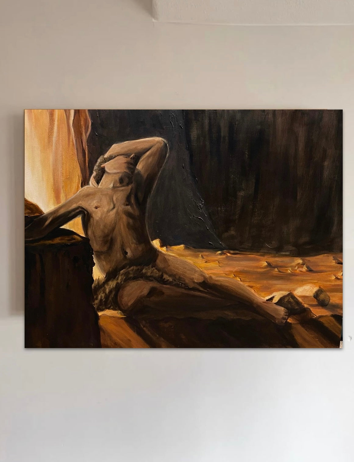Para esta obra hice una investigación sobre el Romanticismo; lo que fue, lo que significa y porqué me llama tanto la atención lo dramático que es. Hice un "collage" en donde junte el paisaje de una pintura y el desnudo de otra. Mi intriga de las alegorías que existen sobre las cuevas y mi fascinación por pintar anatomía humana se juntaron con el desafío técnico de juntar dos imágenes con escalas, colores y tonalidades totalmente distintas.