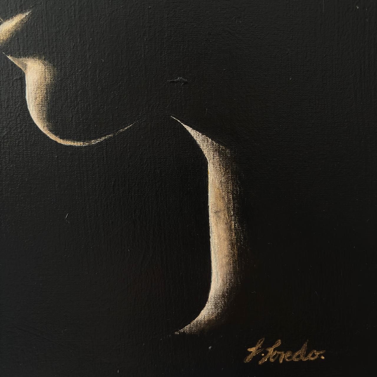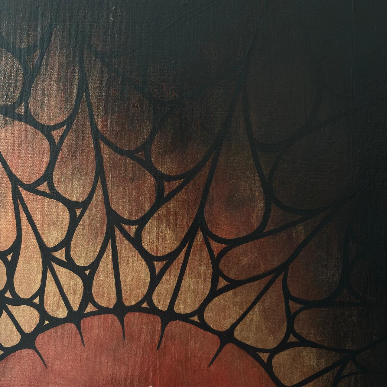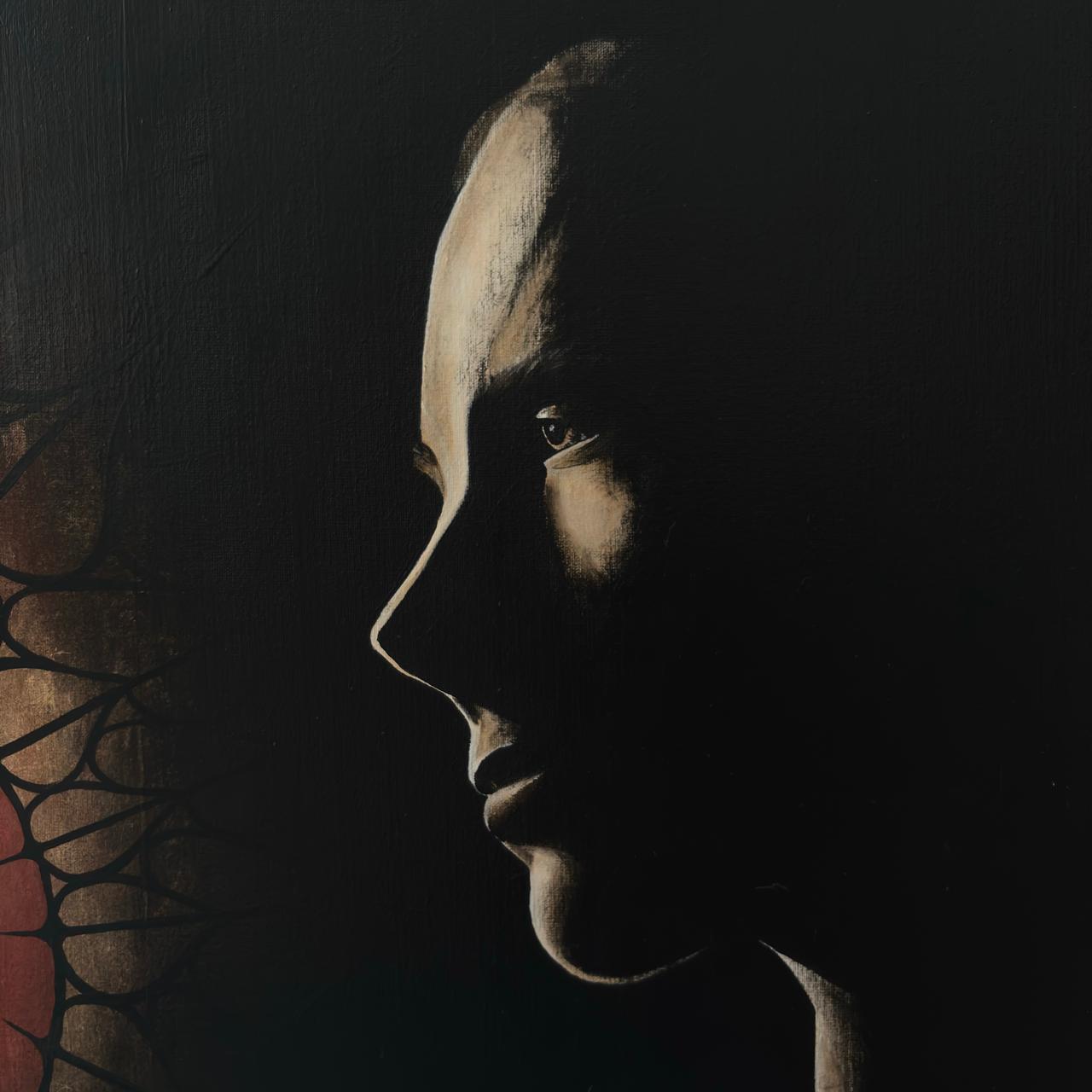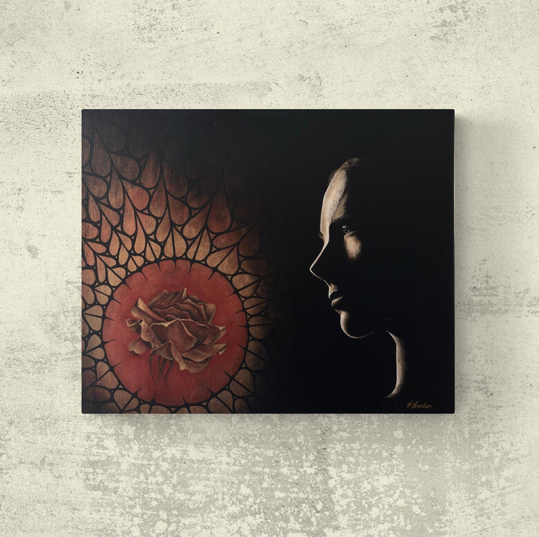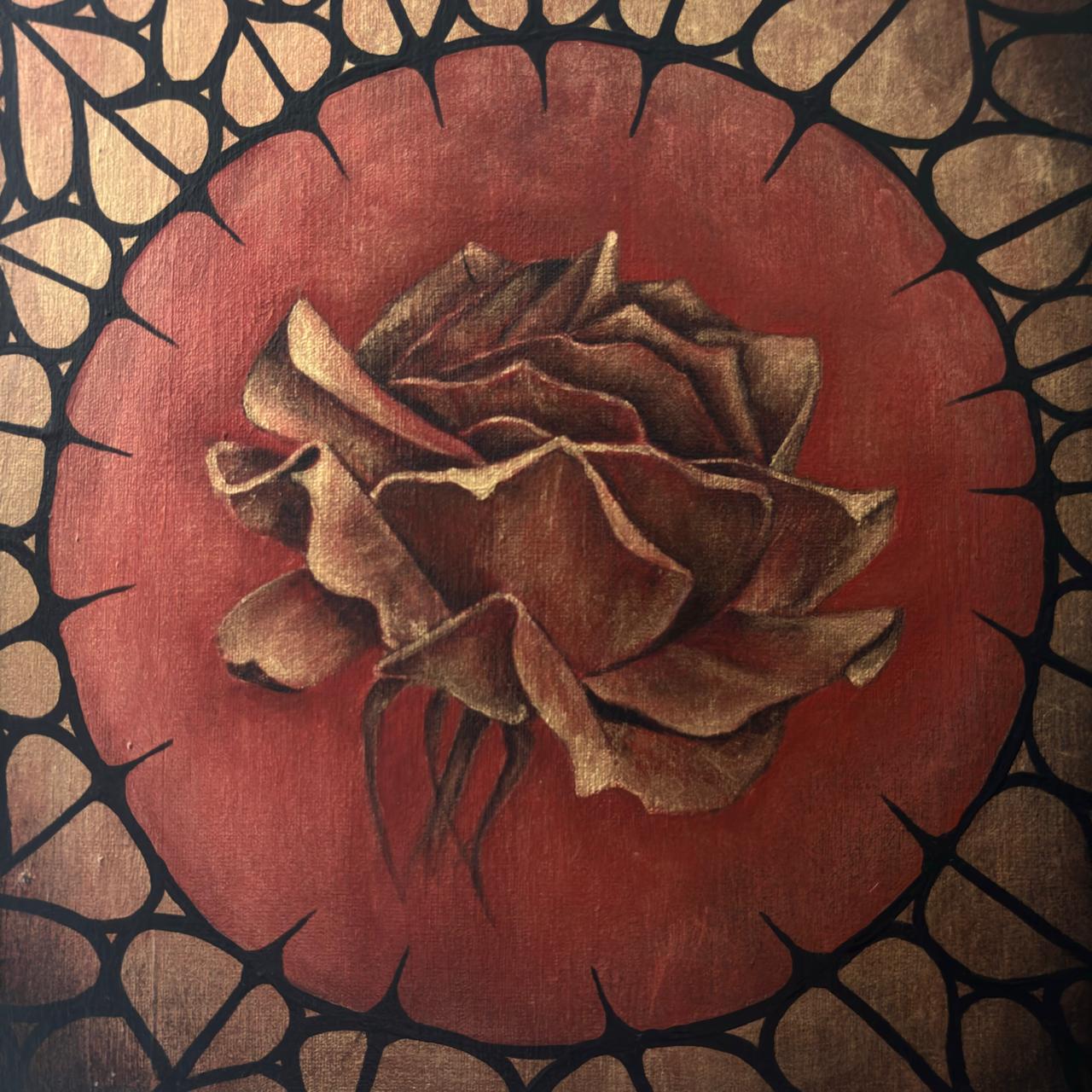 Refleja el momento íntimo de introspección, el espacio personal en el que nos retiramos a estar con nosotros mismos. El personaje mira una rosa dorada que ilumina el espacio y a ella misma. La rosa está envuelta en un círculo rojo del que fluyen redes que conectan al infinito. Obra del año 2019, pertenece a una serie de trabajos en donde mayormente utilicé pintura en color negro y dorado.