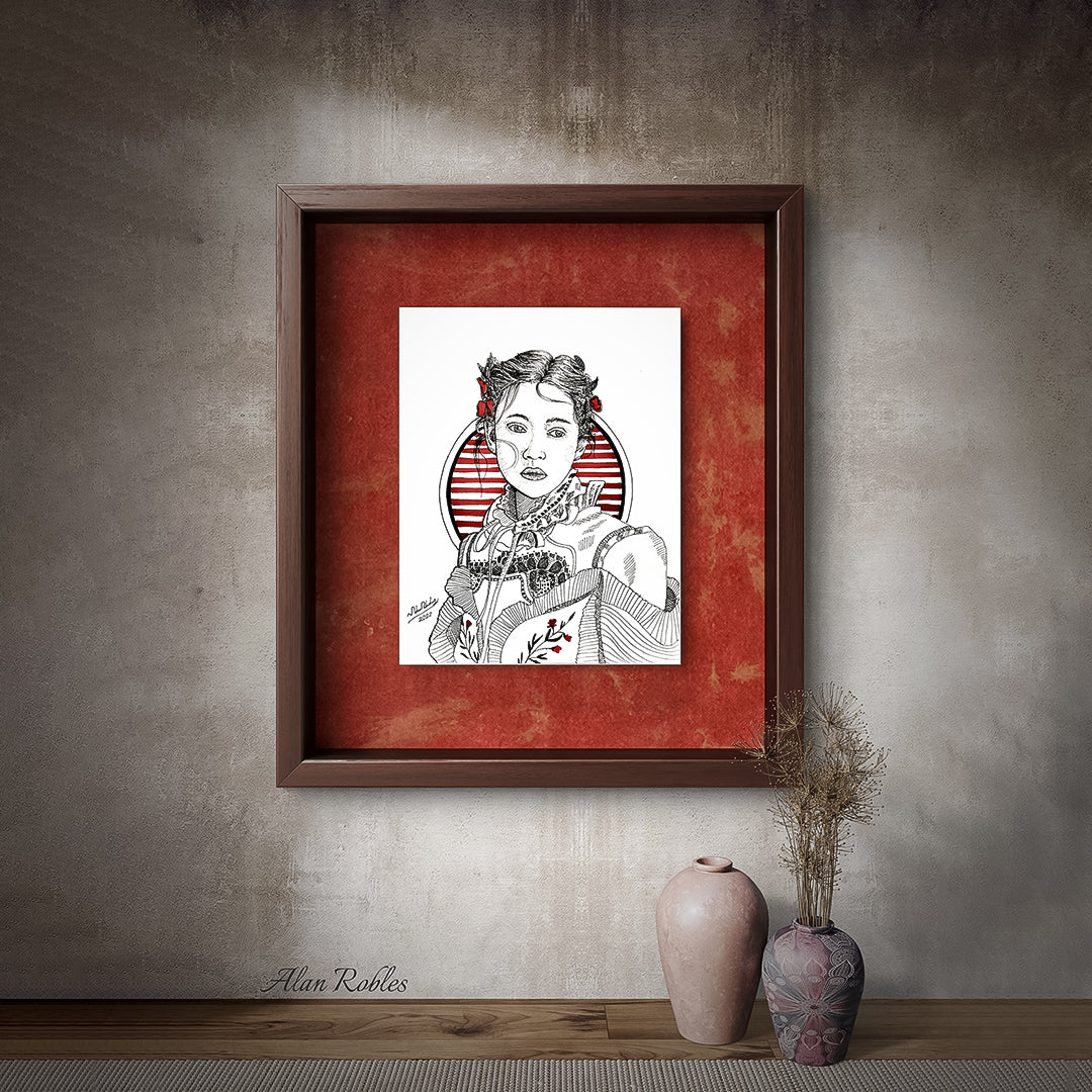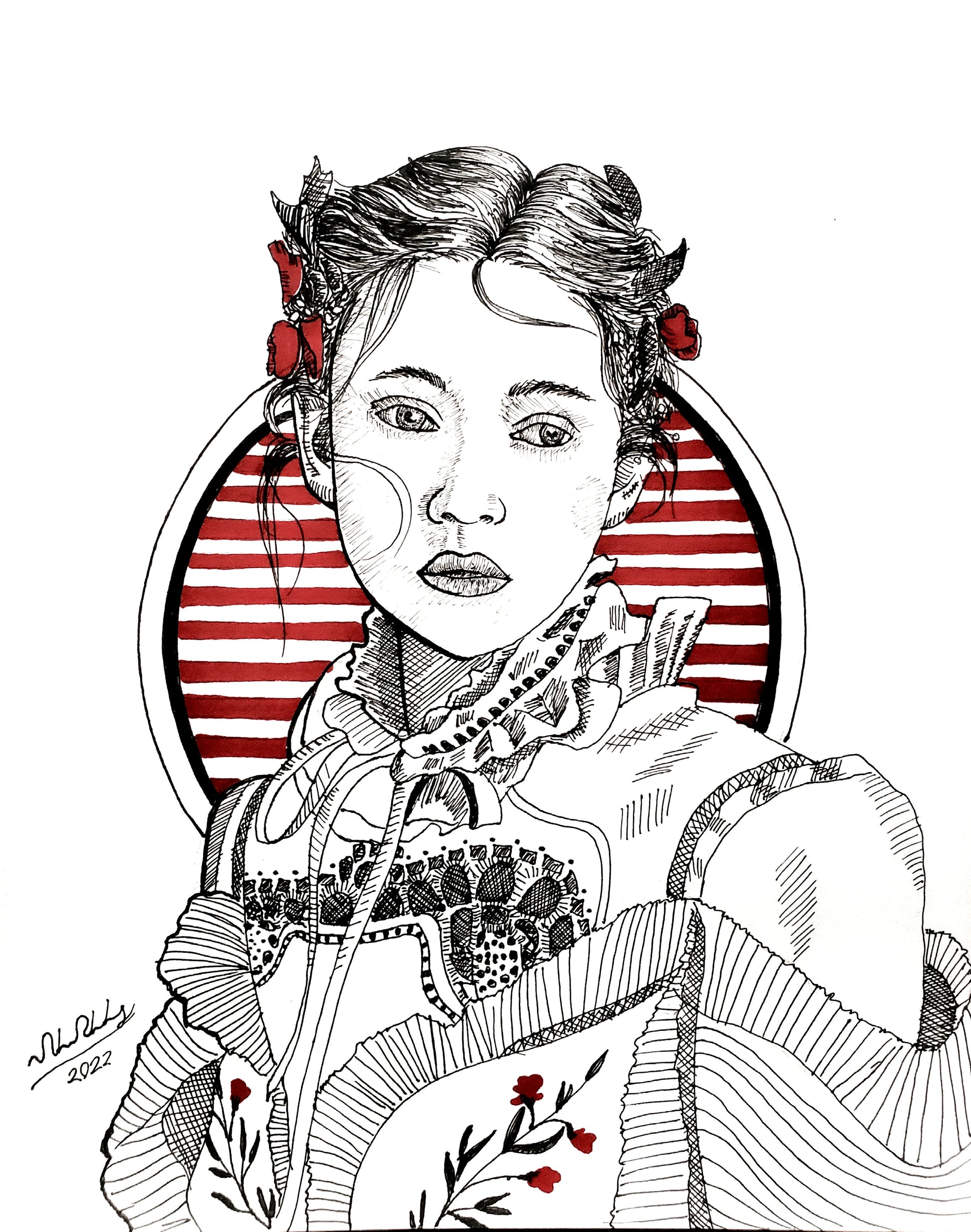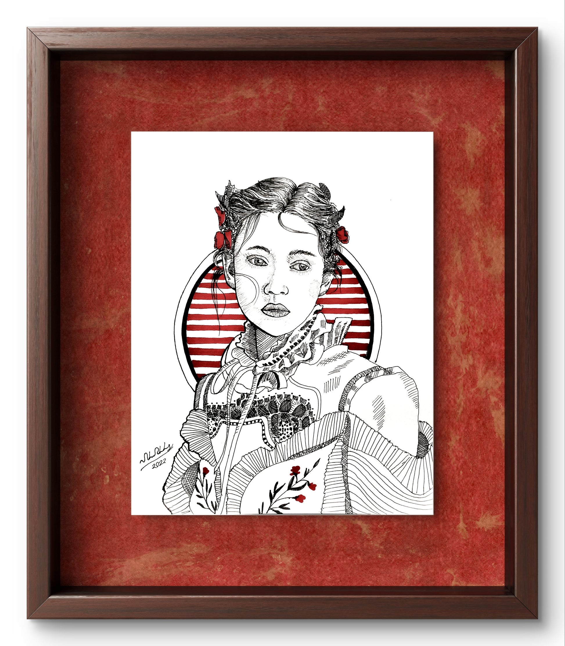Esta obra representa la soledad aún cuando se posee belleza y opulencia. Su mirada disociada, distante, parece perdida en un mundo interior. El entorno ornamental que la rodea no logra ocultar el vacío emocional que habita en ella. Así, el dibujo reflexiona sobre el aislamiento silencioso que puede esconderse tras una apariencia impecable.