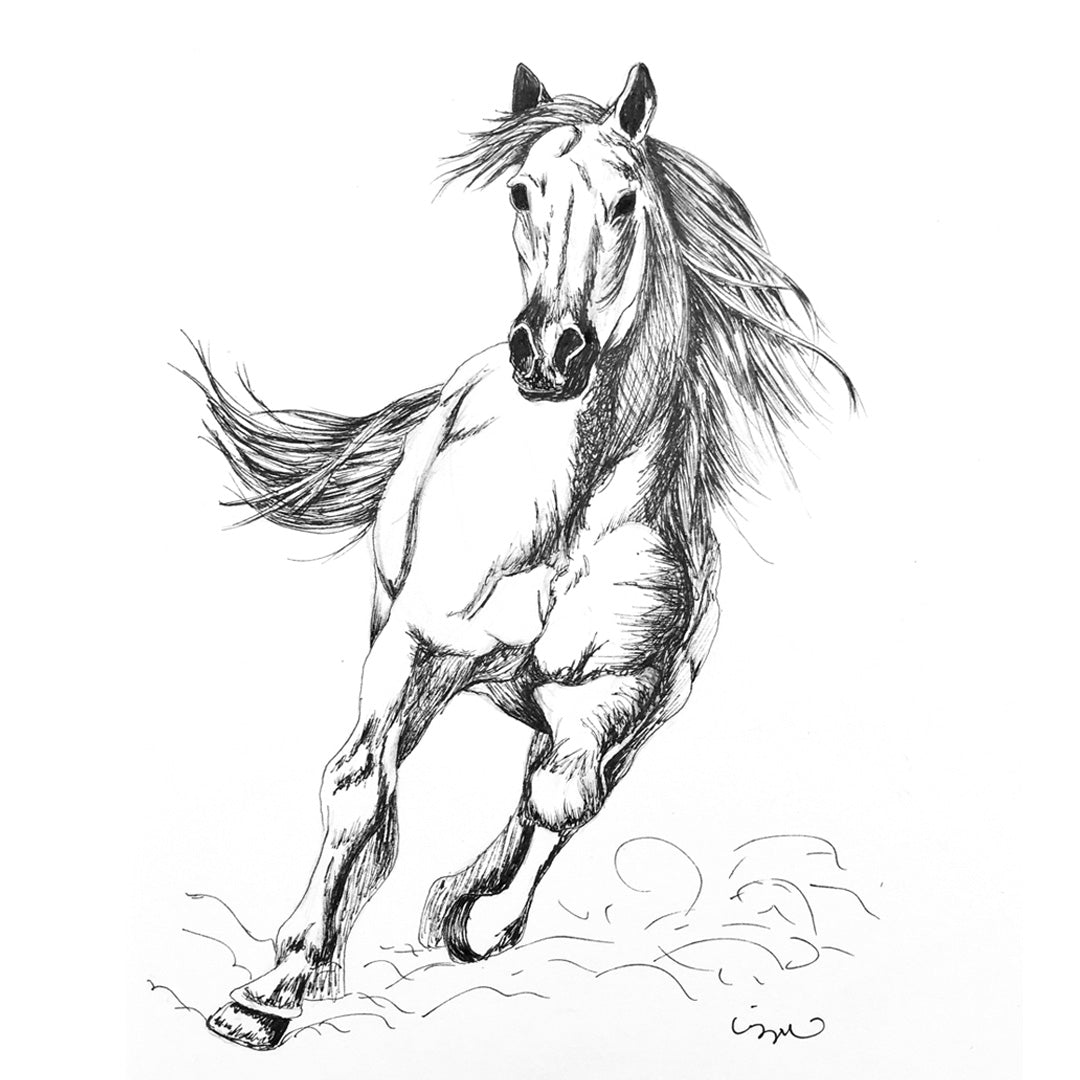 Ilustración de caballo corriendo en estilo realista. Realizada con la técnica de scribble o garabatos, con estilógrafos sobre papel. Listo para enmarcar.