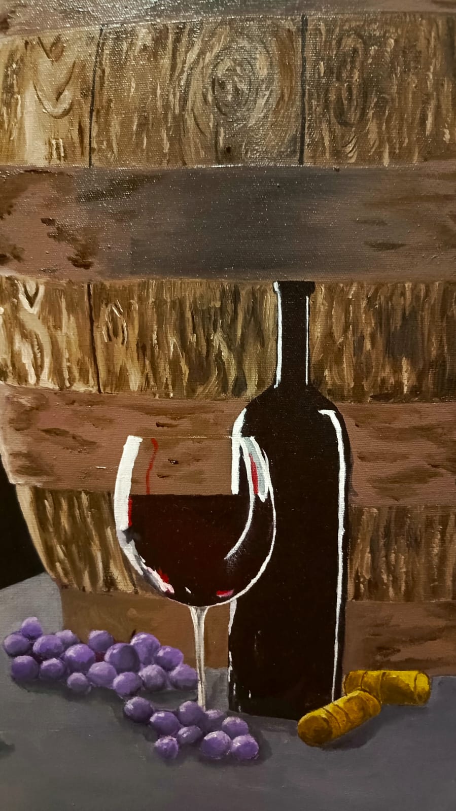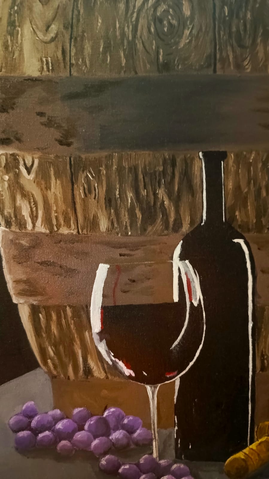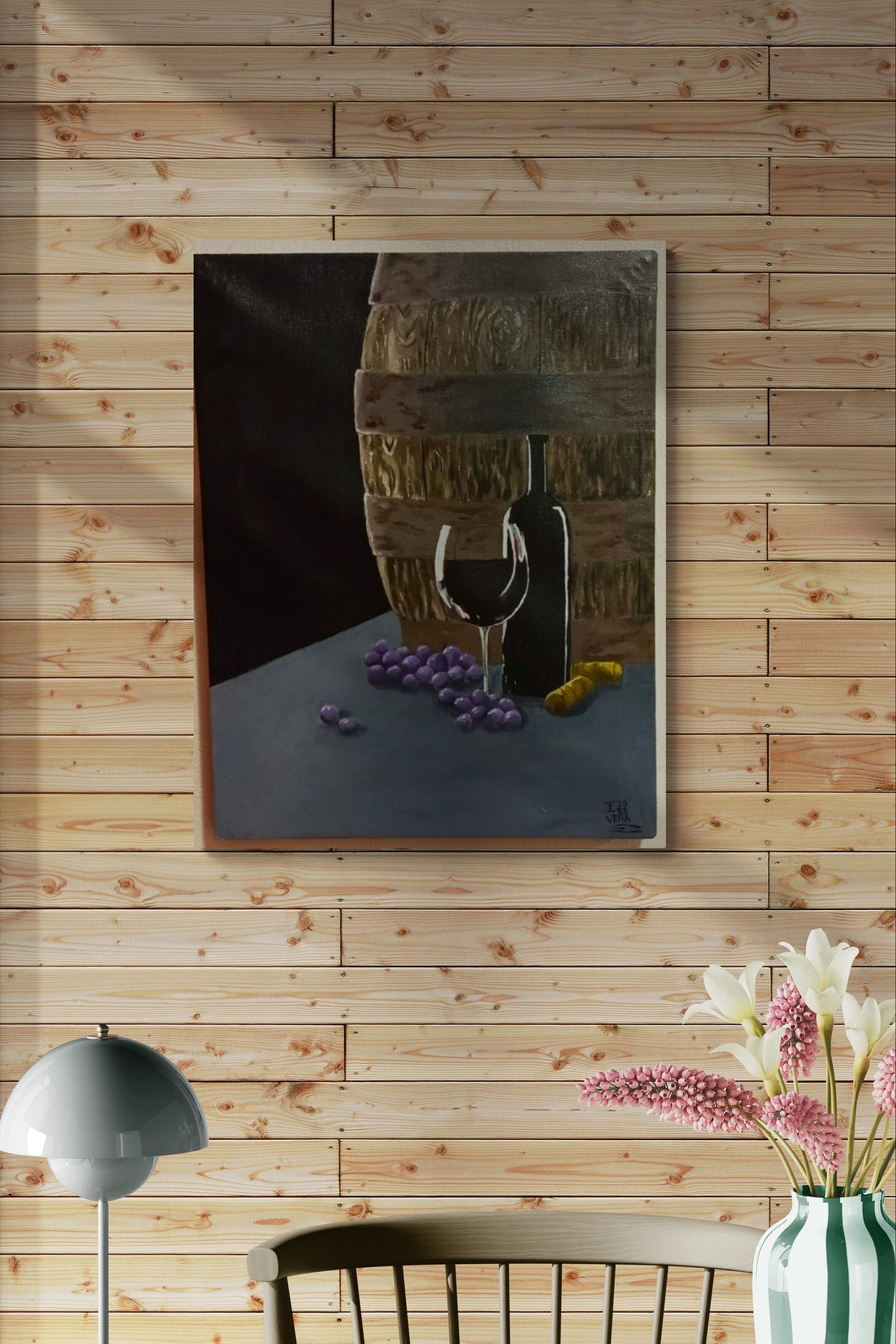 Esta evocadora pintura al óleo captura la esencia del vino en su forma más pura y tradicional. Con una composición cuidadosamente equilibrada, la obra presenta una barrica de madera envejecida, símbolo del paso del tiempo y del proceso artesanal del vino. En primer plano, una copa parcialmente llena refleja sutilmente la botella y el entorno, añadiendo profundidad y realismo a la escena. Las uvas dispersas sobre la mesa y el corcho colocado casualmente transmiten una sensación de historia detenida en el instante.