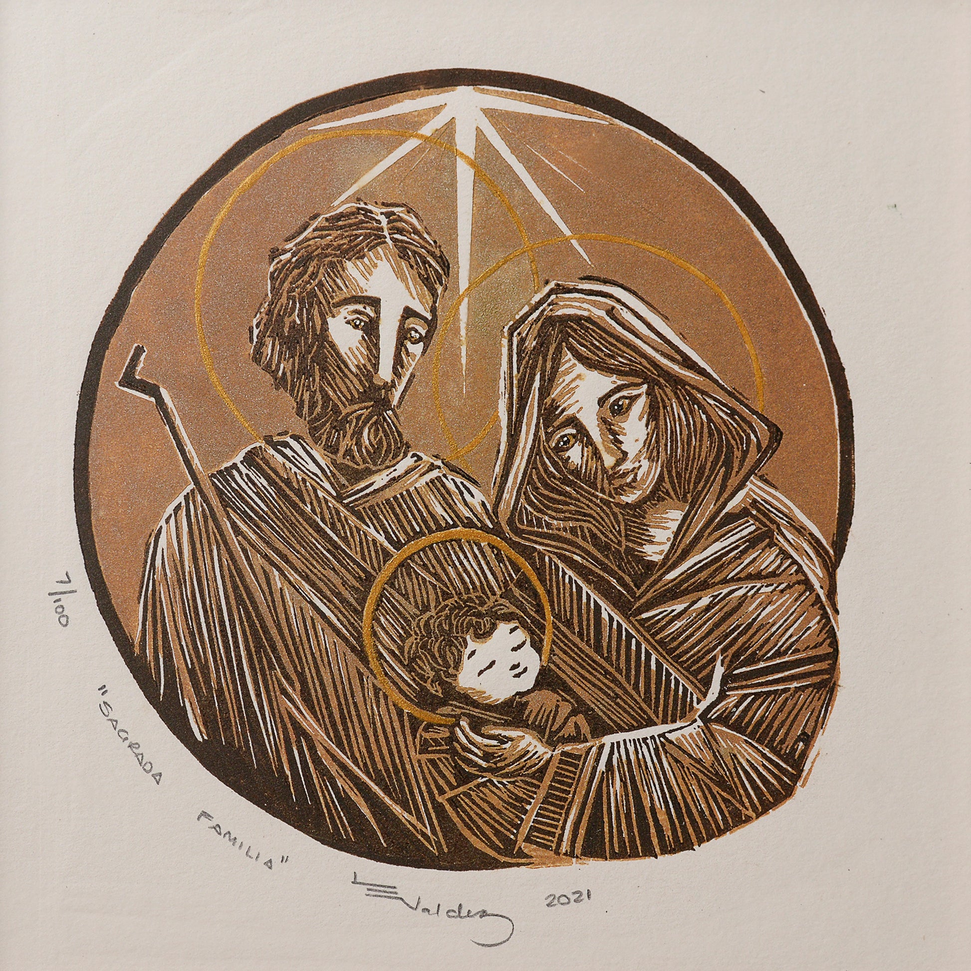 Linograbado a dos placas, tintas café-oro-sepia, impreso sobre papel Fabriano Única de 250 gsm.