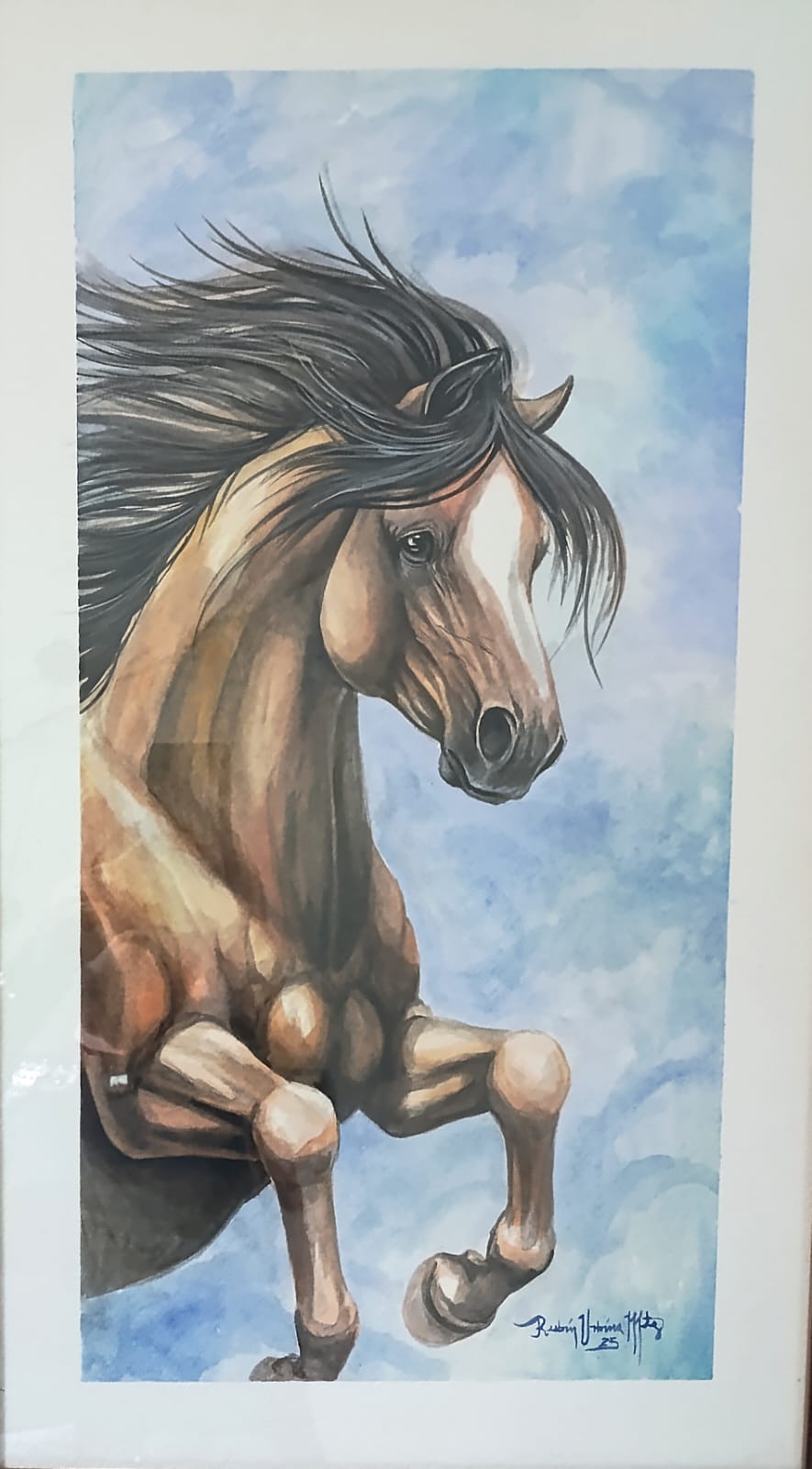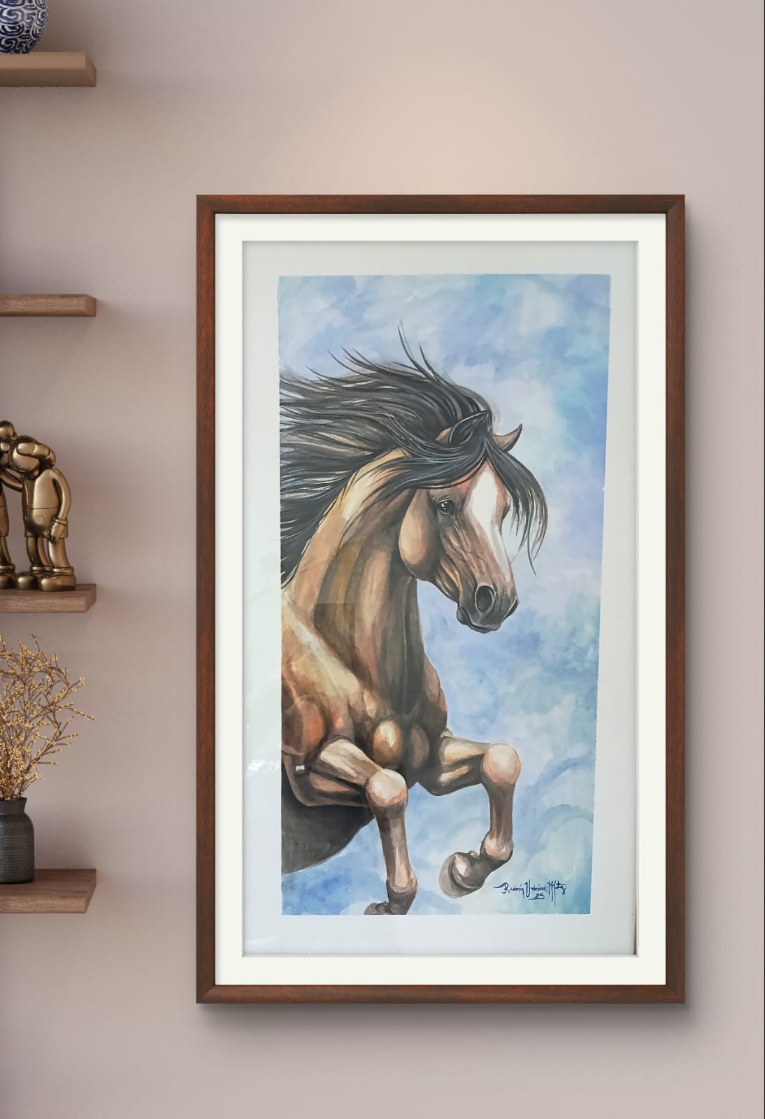 Caballo bayo saltando hacie el cielo, con las crines al aire, se aprecia la majestuosidad de este hermoso animal en toda su expresión, sobre un fondo azul cielo que nos remonta a la libertad.