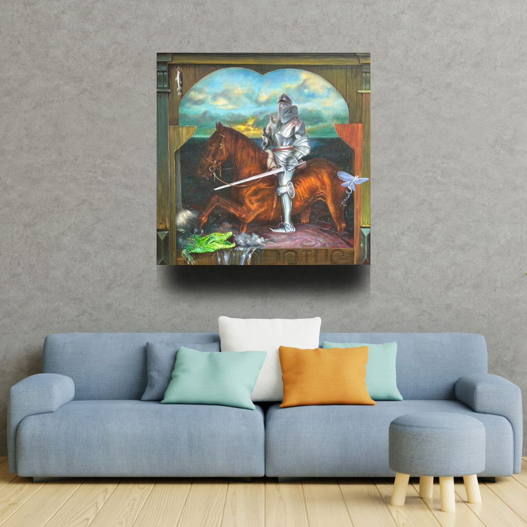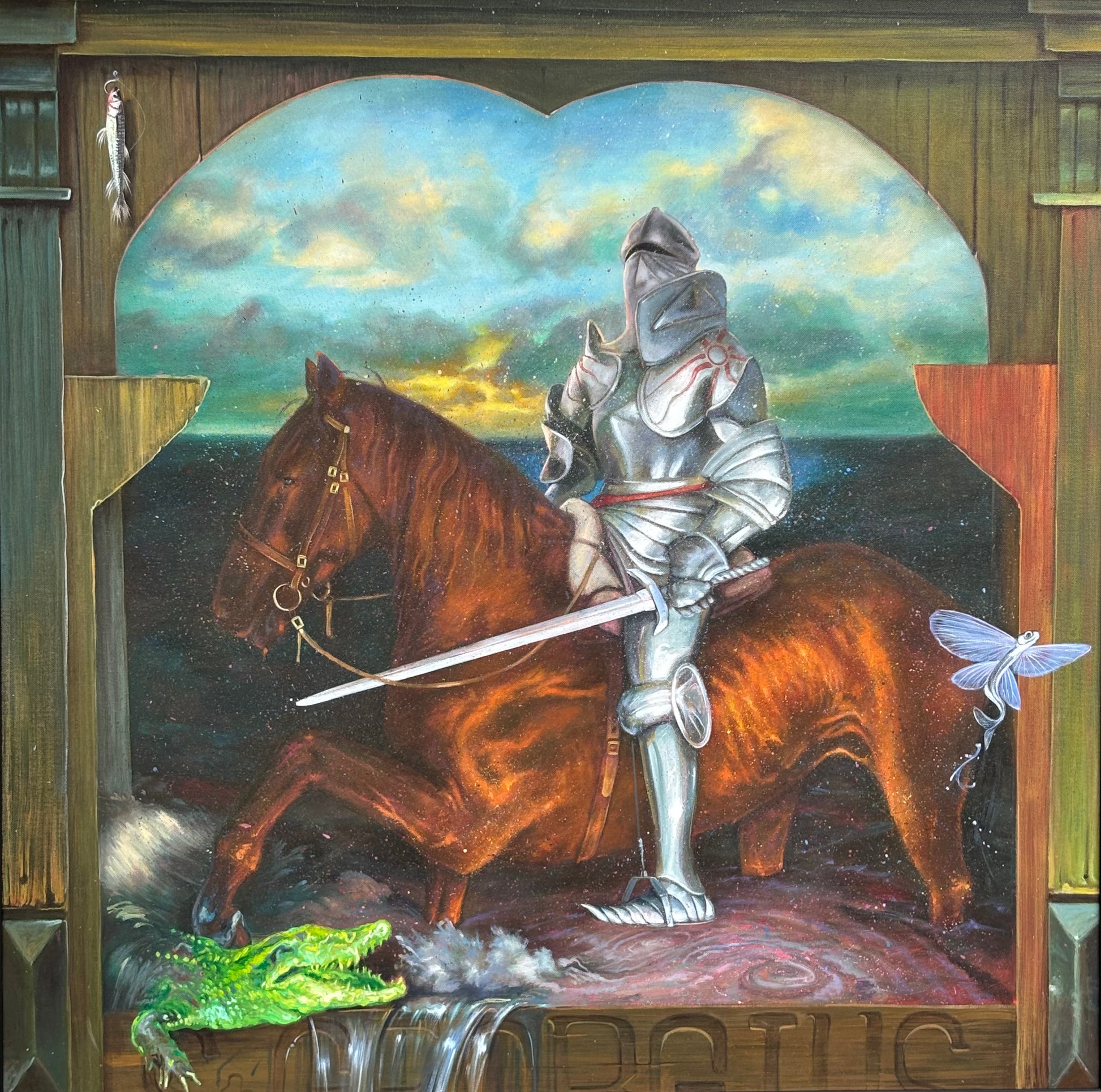 “En esta pintura, San Jorge, guerrero de la luz, se alza sobre un corcel de fuego, desafiando al Leviatán que aguarda entre sombras. El amanecer irrumpe como un presagio de victoria, atrapado en un instante eterno donde la espada brilla con la promesa del renacer. Un portal místico enmarca la escena: el límite entre el miedo y la esperanza, entre la furia del Leviatán y la nobleza del caballero. Aquí, el arte captura el duelo mítico que define el alma humana.”