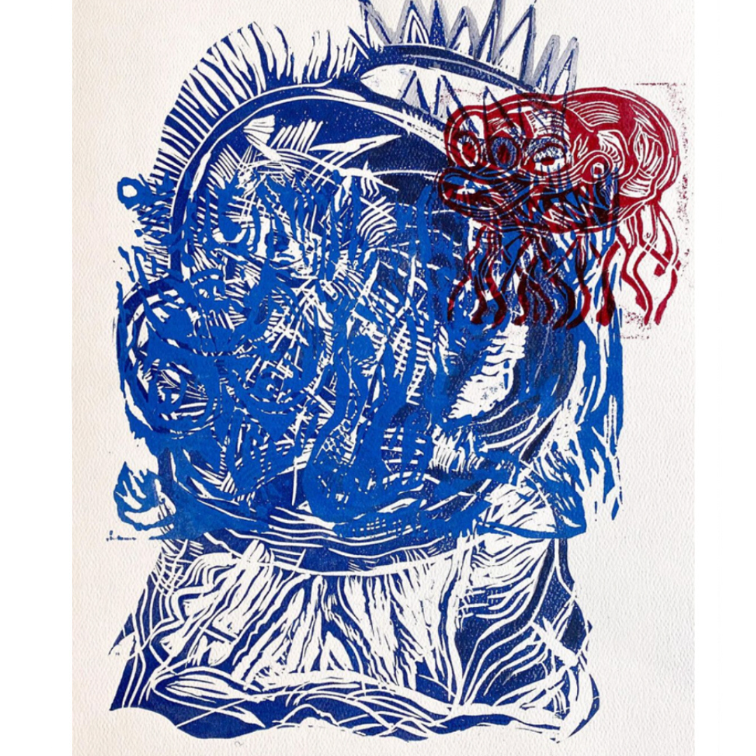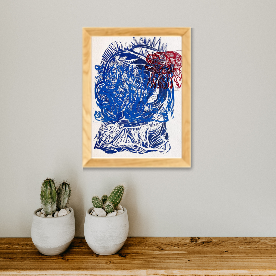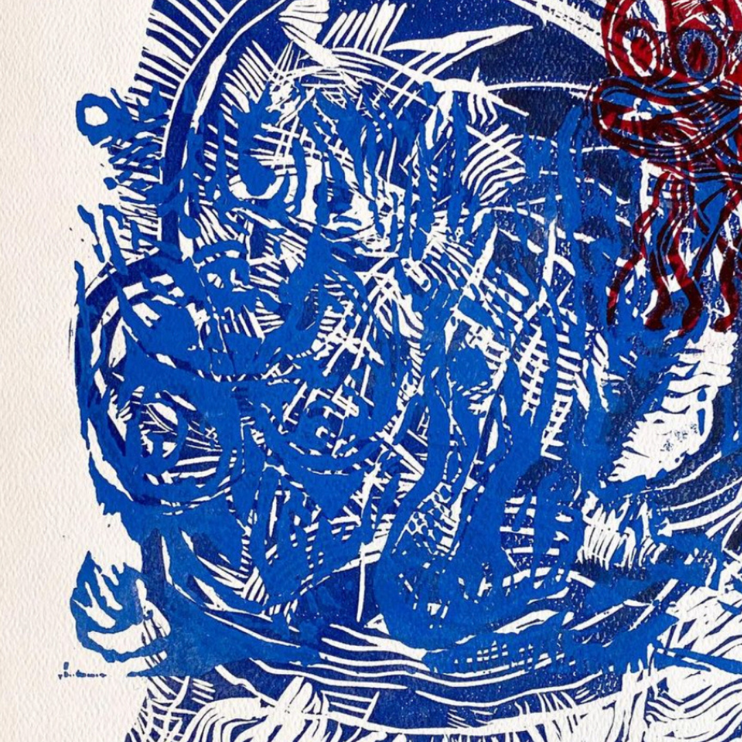 A través de una combinación de xilografía y linóleo sobre papel algodón Stonehenge de 220 gr, se crea una composición cargada de texturas y contrastes, que invita al espectador a reflexionar sobre las capas simbólicas y espirituales que conforman las cosmovisiones mesoamericanas. La obra, como parte de la serie, propone una resignificación contemporánea de estas raíces culturales, conectando el pasado con el presente en un diálogo visual único.