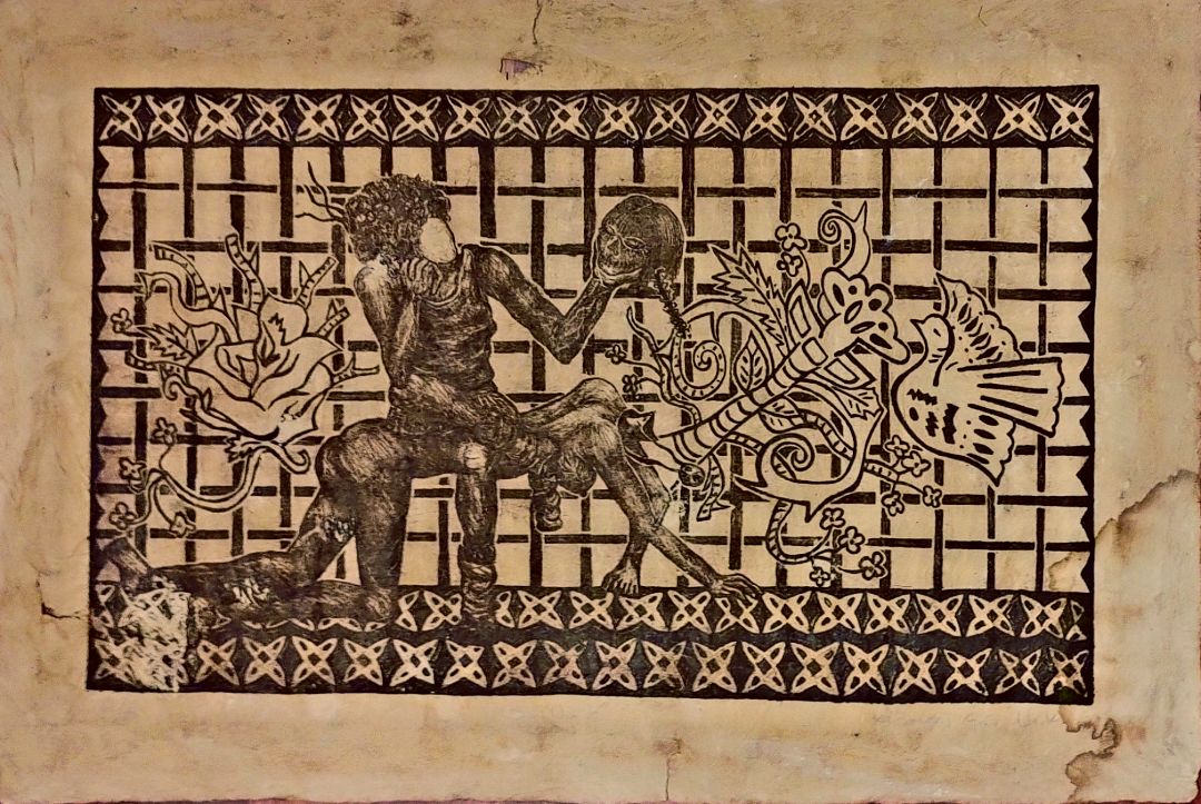 Primera impresión litográfica realizada en el 2011 en modalidad experimental impresa en papel amate para simular un pergamino en el que se reprenta una imagen Splatstick figurativa que alude al papel picado originario de México.