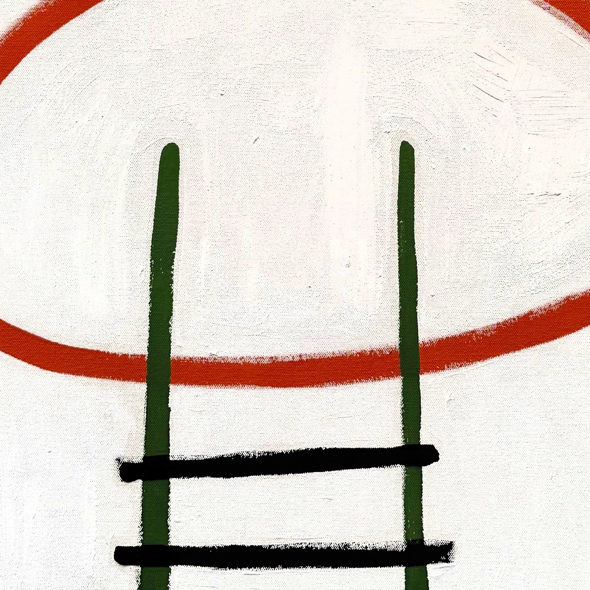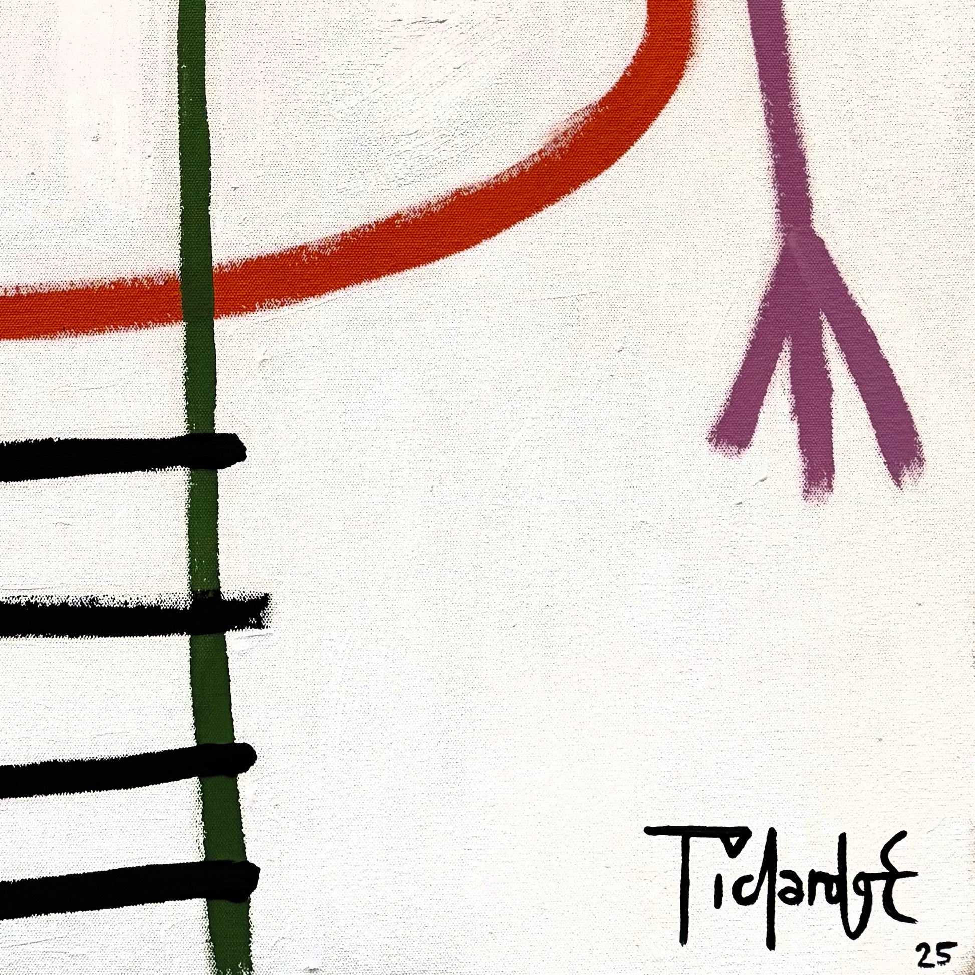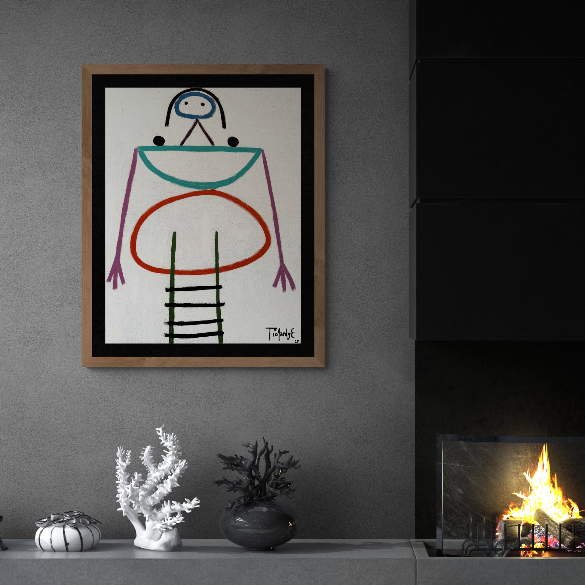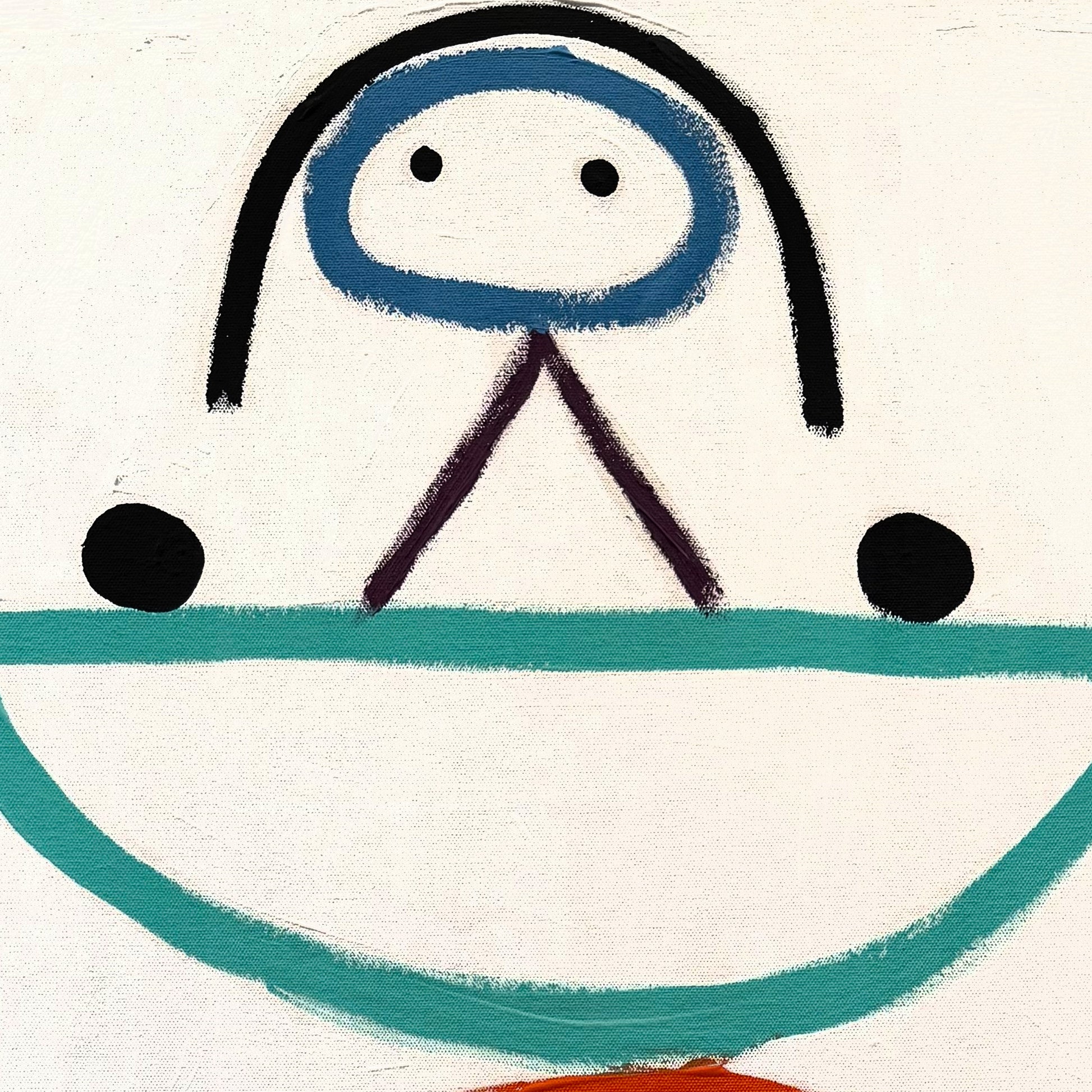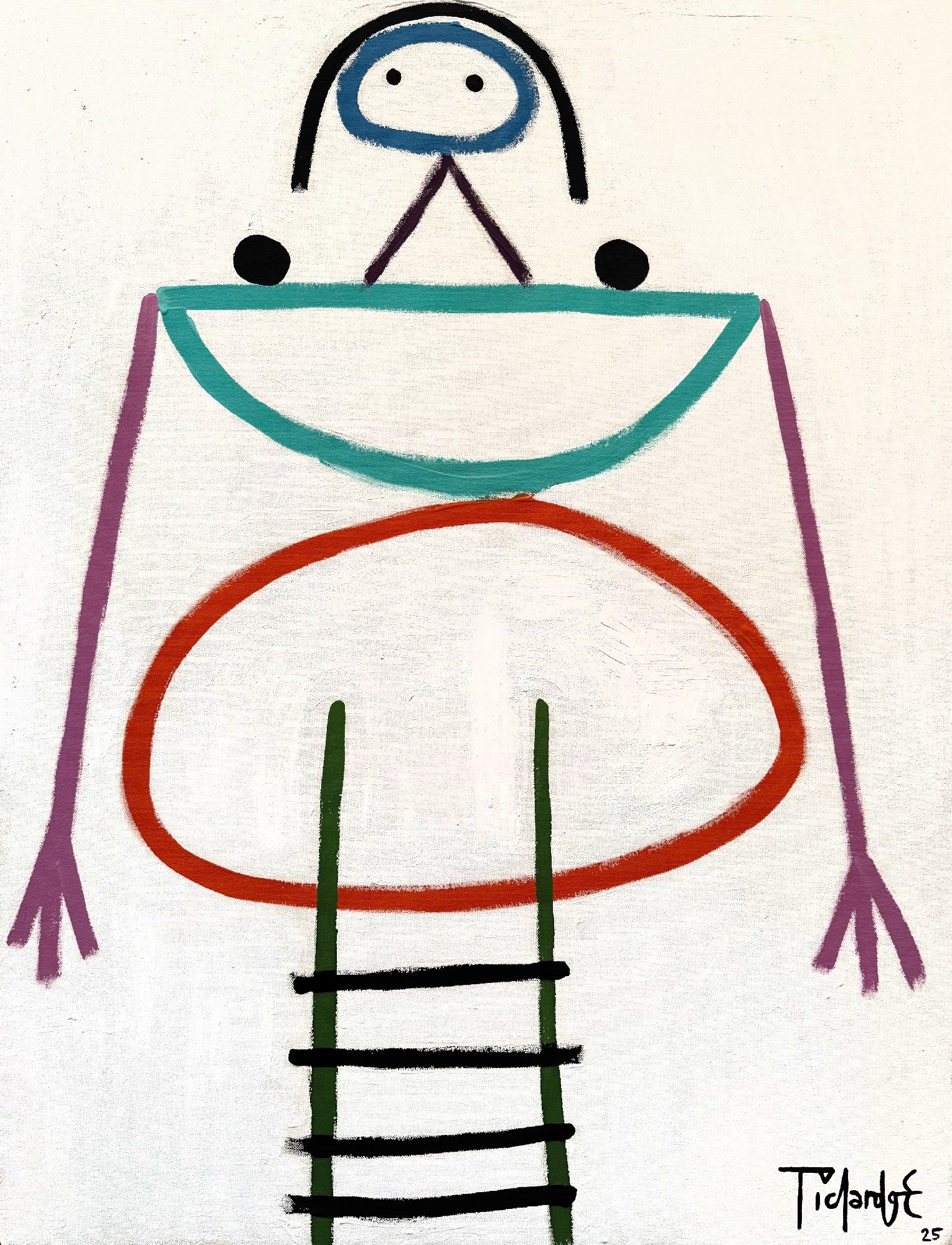 El fondo blanco resalta la pureza y el orden de la composición, mientras que las líneas negras definen el contorno y otorgan ritmo a la figura. Trazos en verde, turquesa, rojo y púrpura crean un cuerpo abstracto compuesto por triángulos, óvalos y círculos, acompañado de brazos abiertos y un rostro mínimo pero expresivo. Esta reducción formal genera un lenguaje directo que recuerda tanto a la fuerza del arte primitivo como a la claridad del arte moderno.