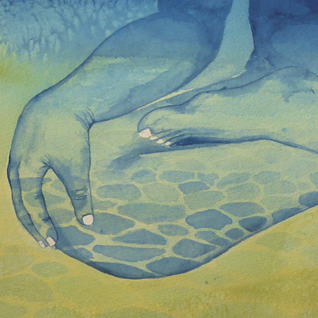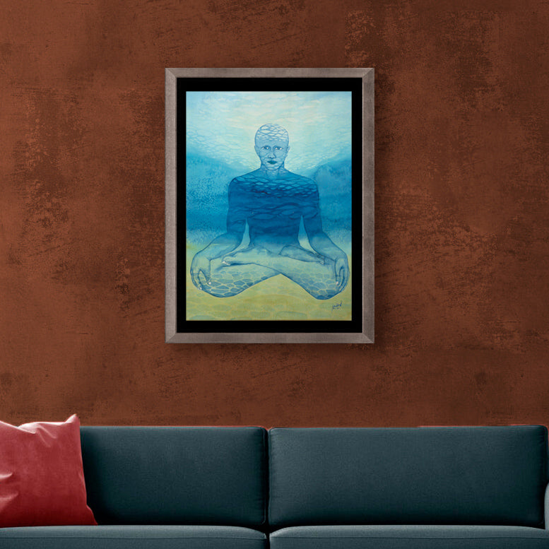 En la obra vemos una composición muy minimalista, el personaje principal al fondo de un estanque mimetizándoce con las aguas cristalinas, hace referencia al dejarse fluir con la misma tranquilidad de las corrientes que lo rodean, el personaje principal en una posición muy cómoda y meditativa, encontrando su paz interior.
