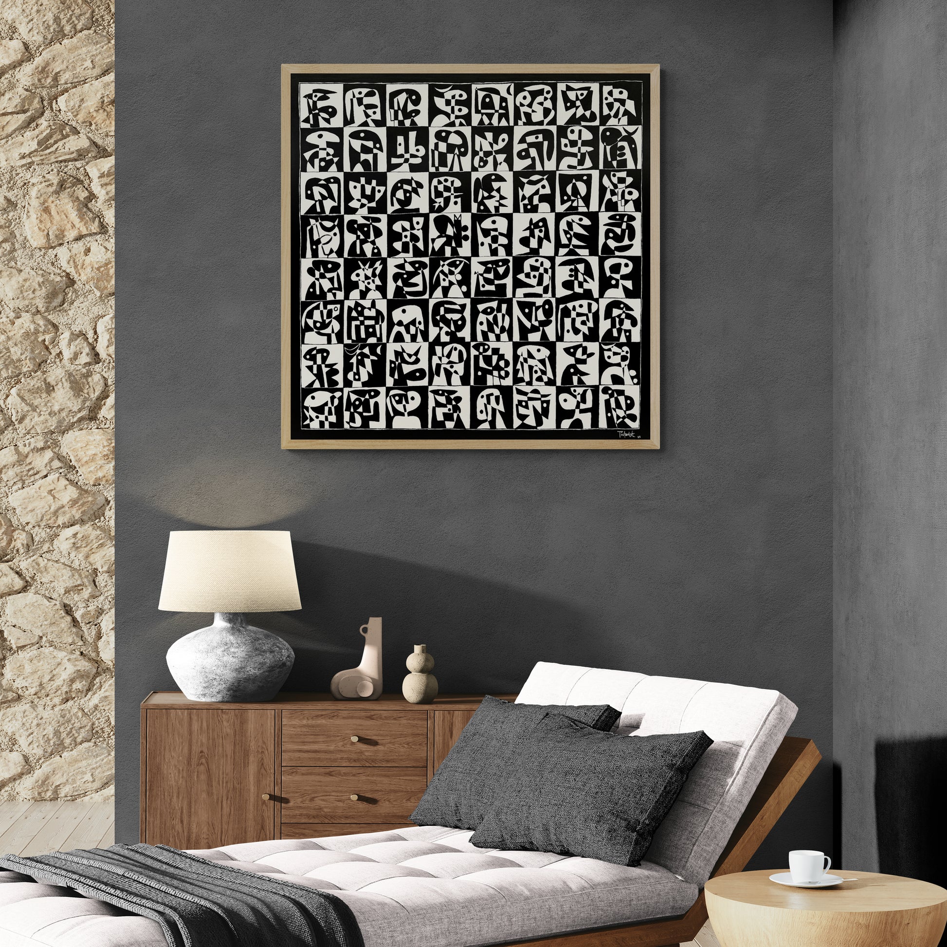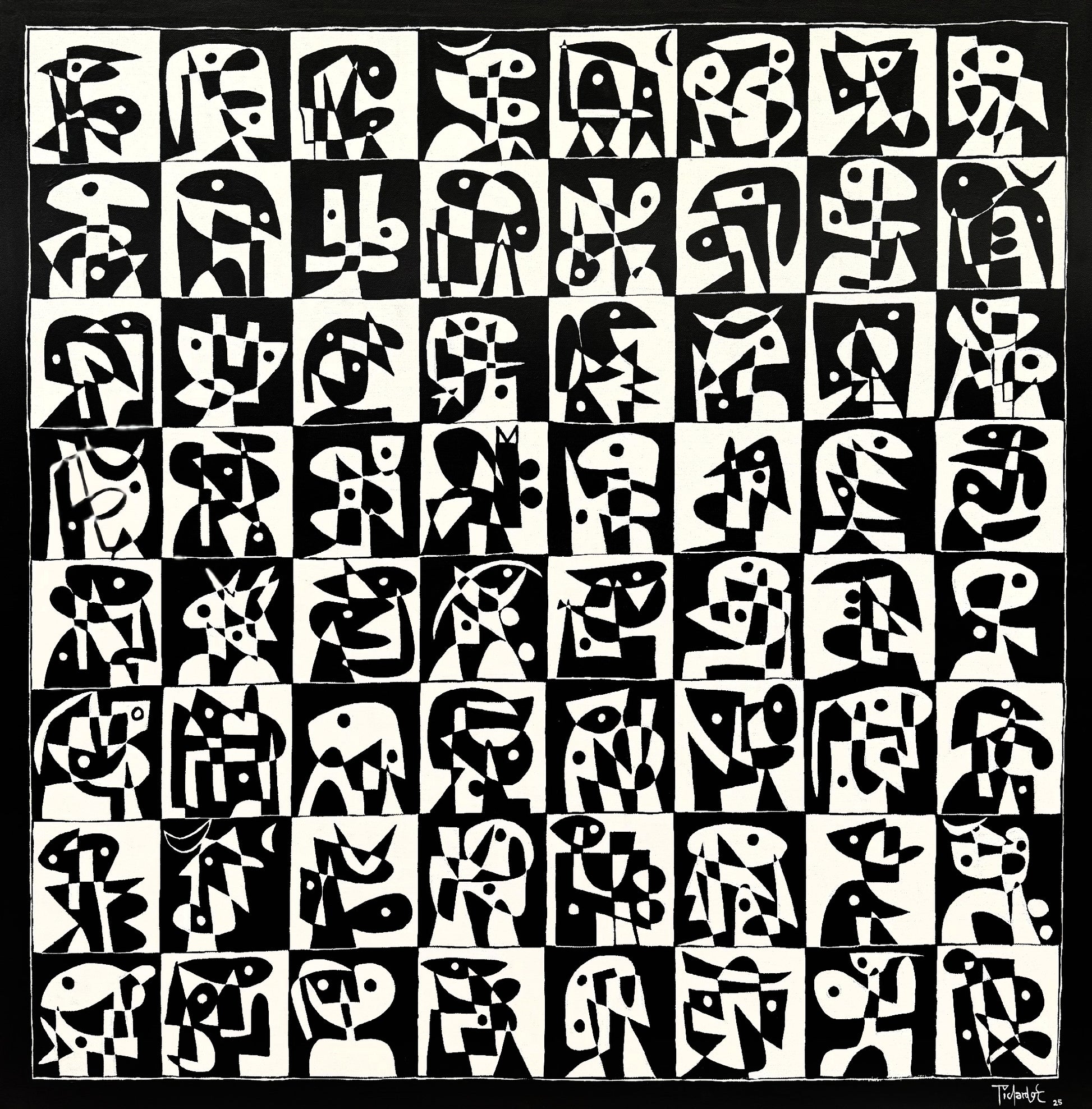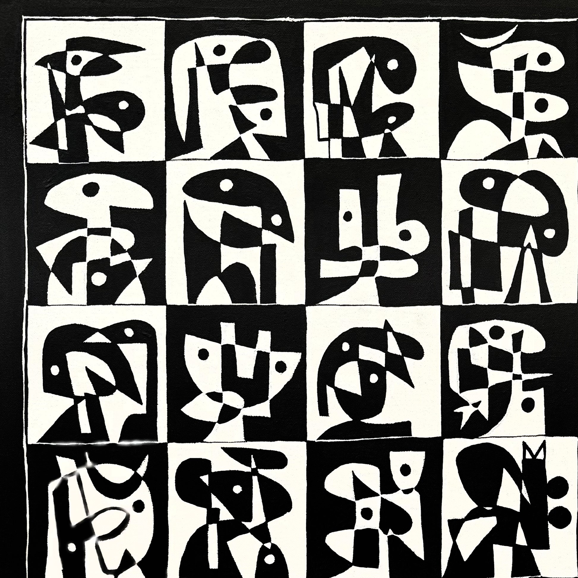 La composición se construye mediante una cuadrícula que regula la totalidad del plano pictórico. Esta organización serial establece un ritmo constante que guía la mirada del espectador a lo largo de la superficie. La alternancia entre fondos claros y oscuros intensifica la tensión visual y refuerza el diálogo entre figura y fondo, evitando cualquier lectura estática o repetitiva.