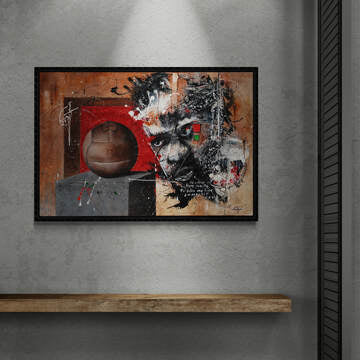 • La parte derecha de la pintura está dominada por el rostro de un hombre, representado con gran intensidad y realismo. Sus ojos penetrantes y expresión seria sugieren una profunda carga emocional. El rostro está rodeado de líneas y trazos abstractos, frases dichas por jugadores más famosos del mundo, así como de letras y palabras, que parecen estar escritas de manera