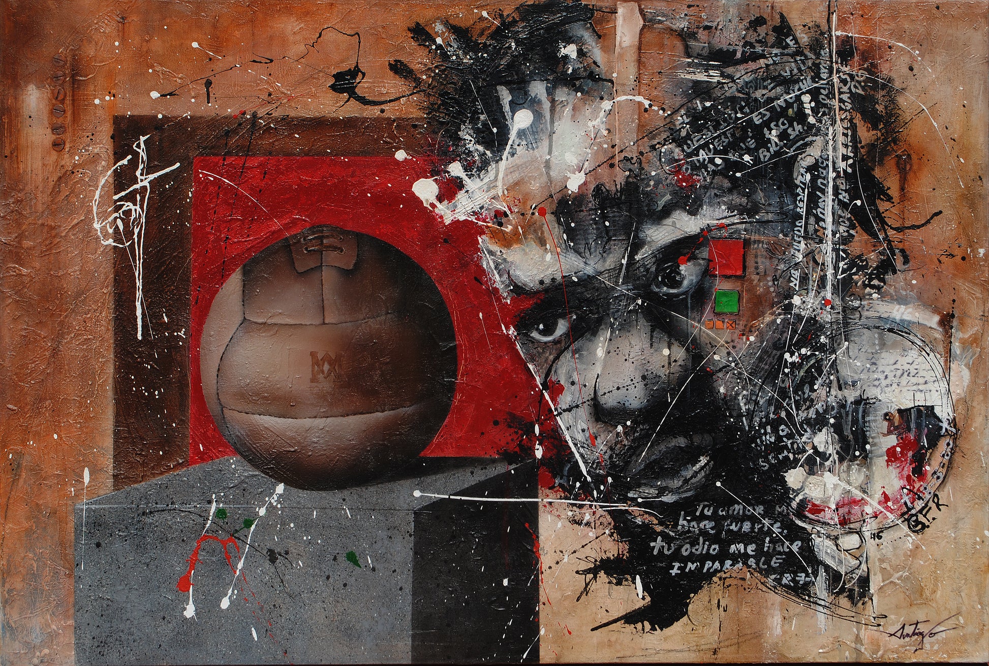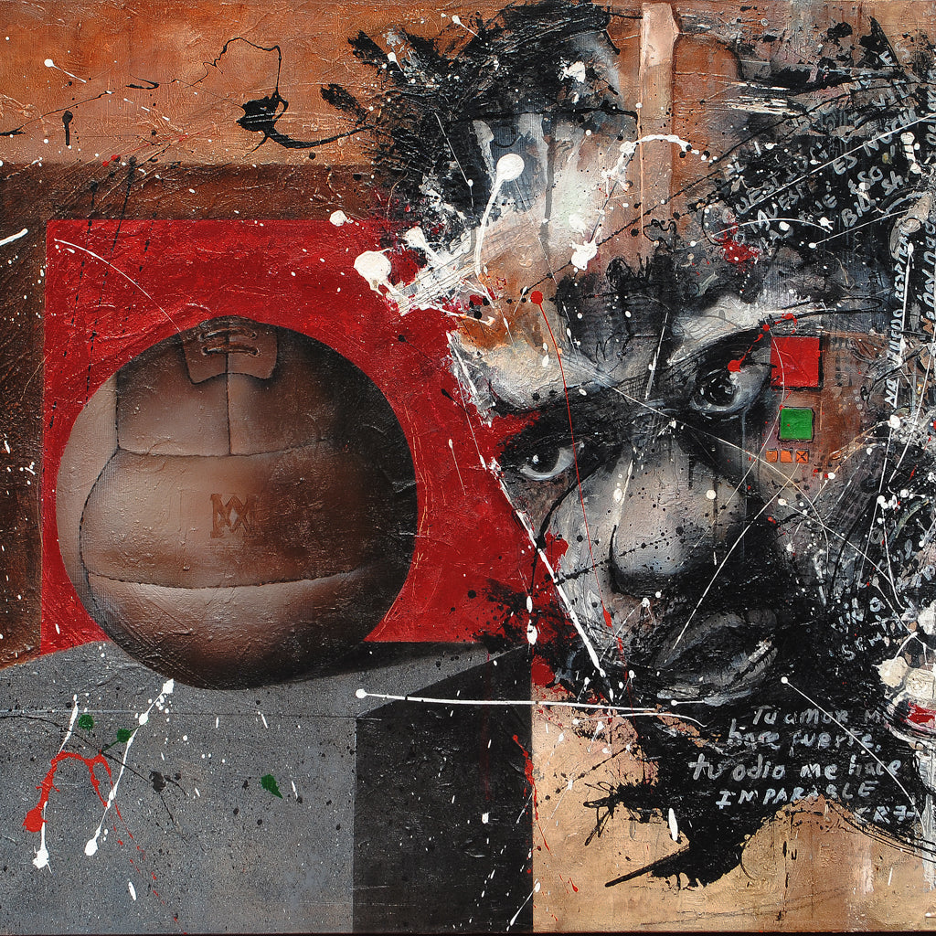 • El fondo de la pintura es dinámico, con salpicaduras de pintura blanca y otros colores que añaden textura y movimiento. Estos elementos abstractos contrastan con las figuras más definidas del balón y el rostro, creando una tensión visual que refuerza el mensaje de la obra.