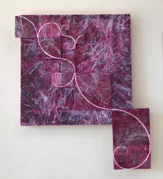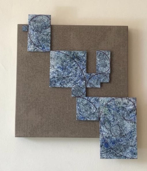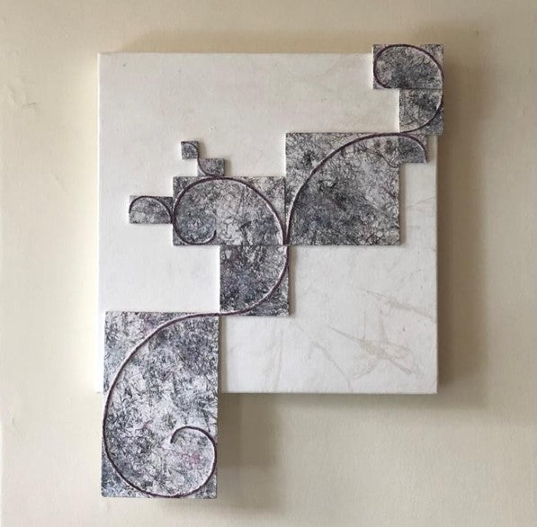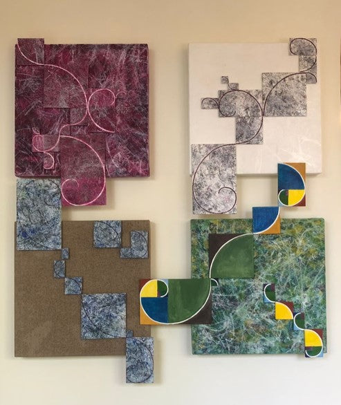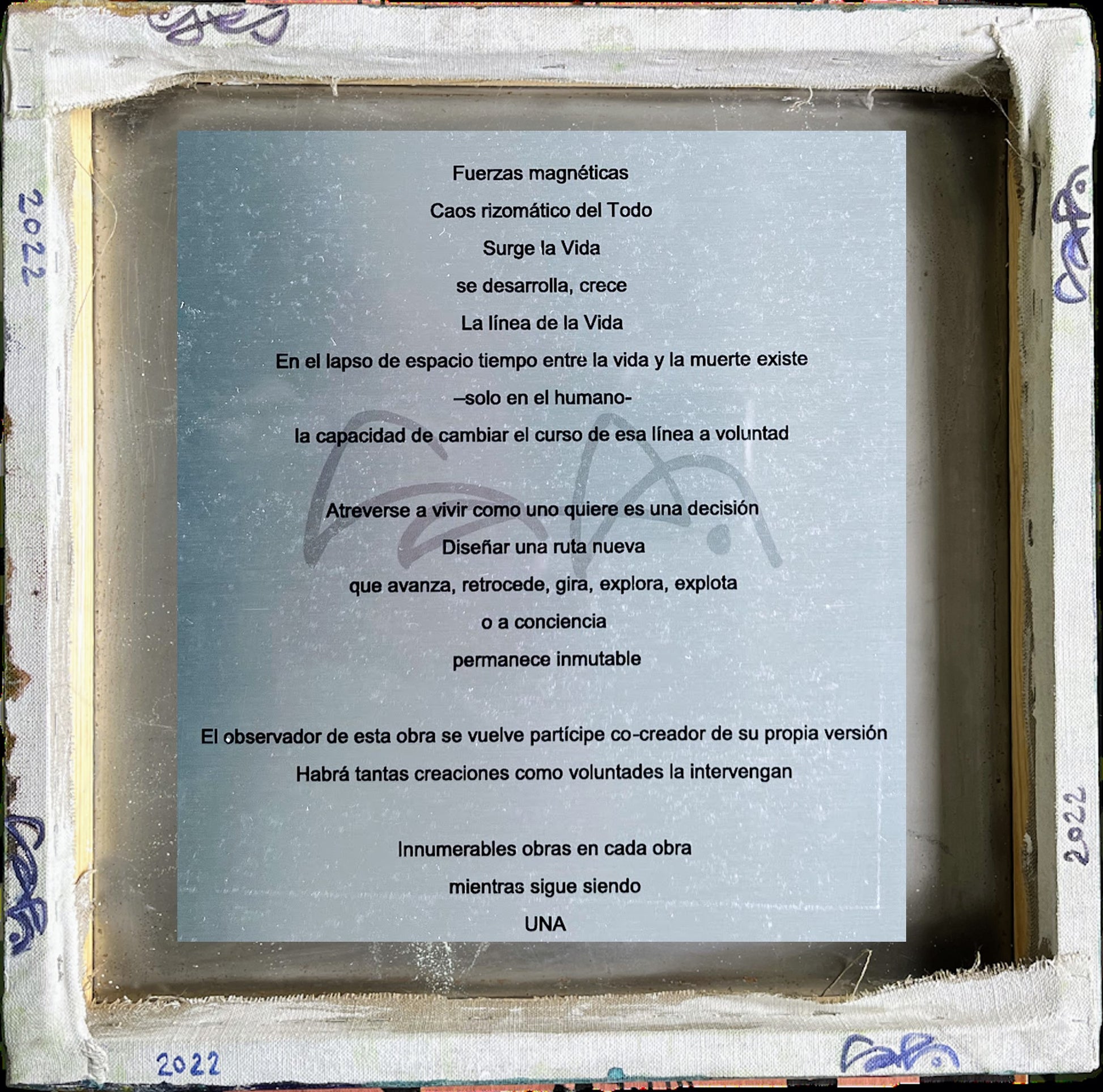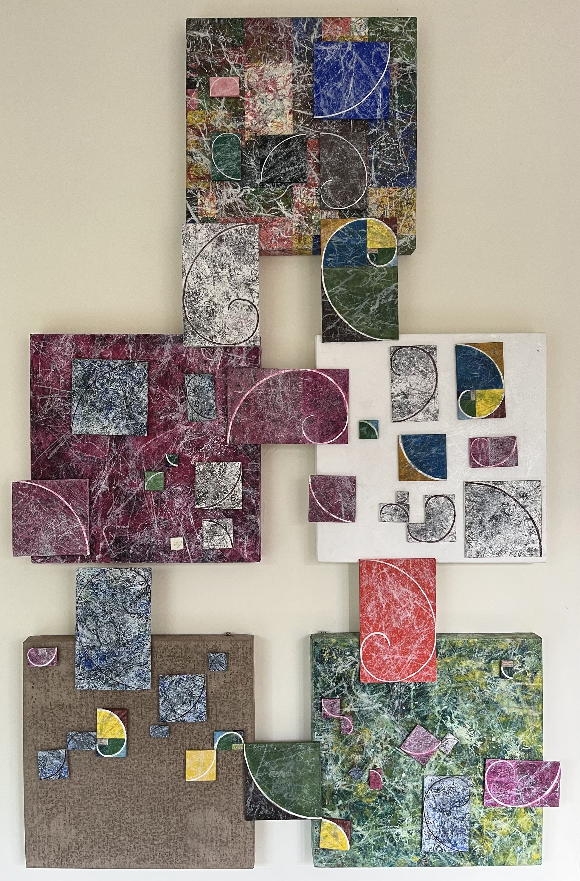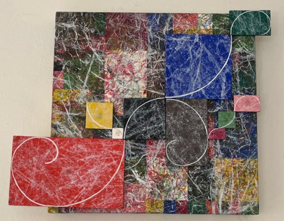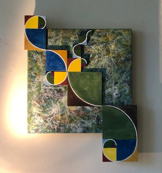 Técnica: El cuerpo principal: temple sobre lino en aluminio. 10 piezas móviles: temple sobre lino en madera. Dimensiones del cuerpo principal (0.51 m x 0.51 m). !0 piezas móviles de tamaño variado que sigue la secuencia de Fibonacci.