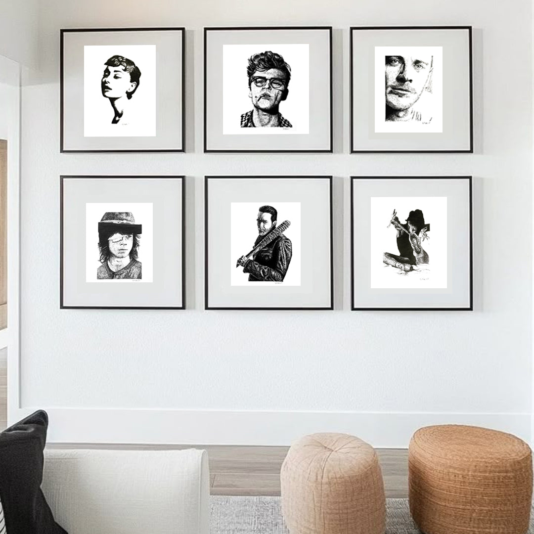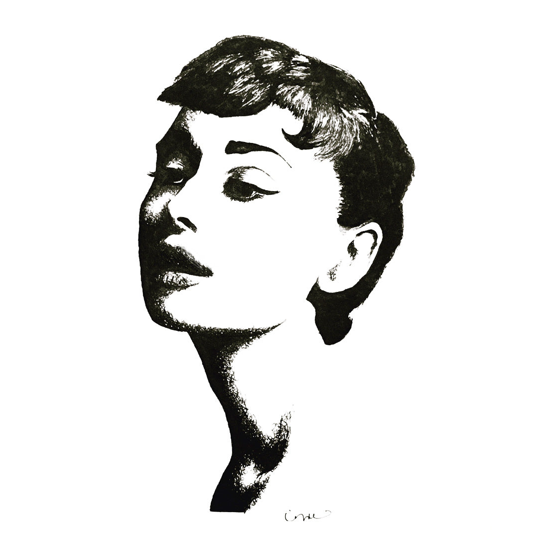 Retrato en estilo realista de la actriz Audrey Hepburn, realizado utilizando la técnica de scribble o doodles con estilógrafos sobre papel. Listo para enmarcar.