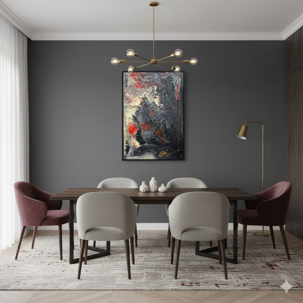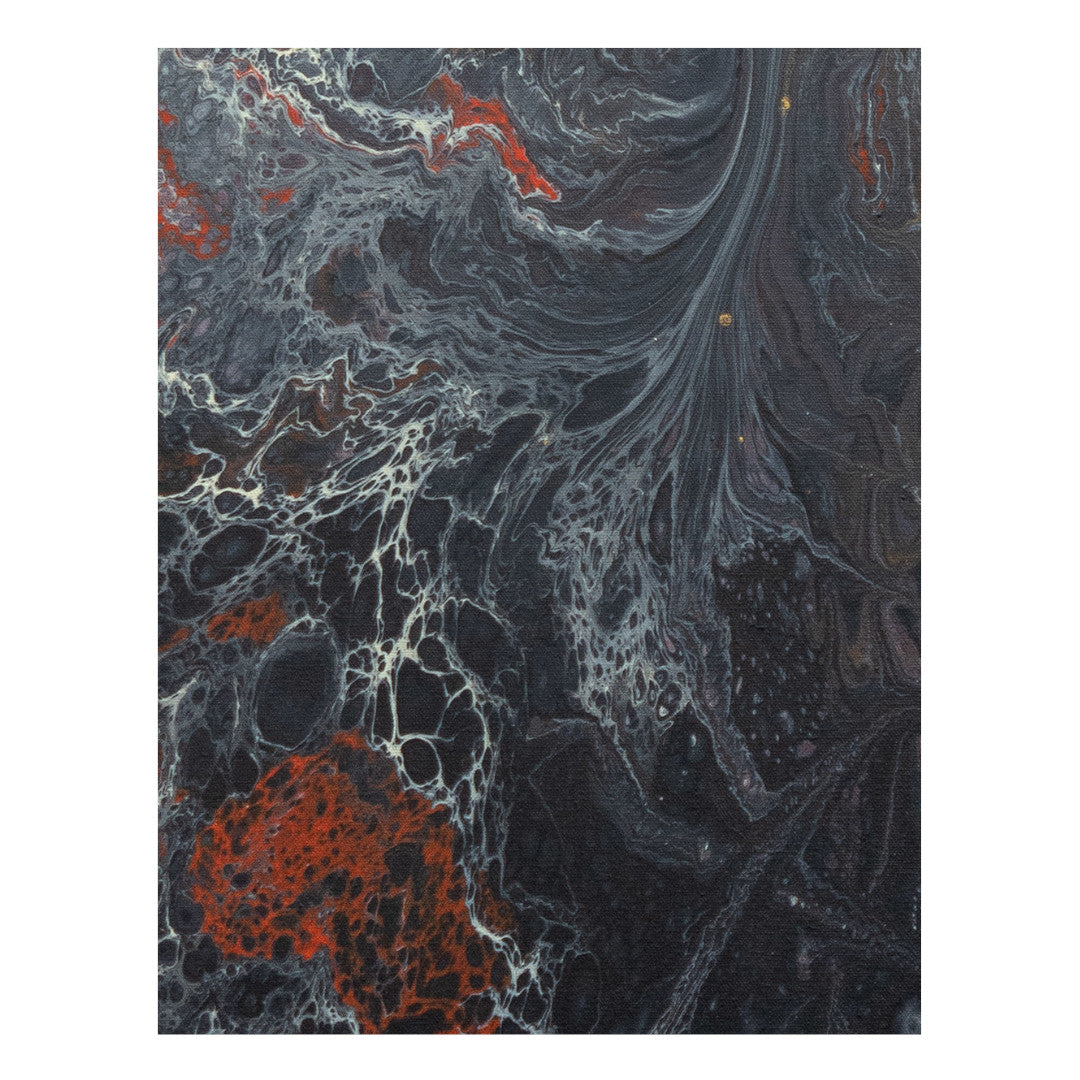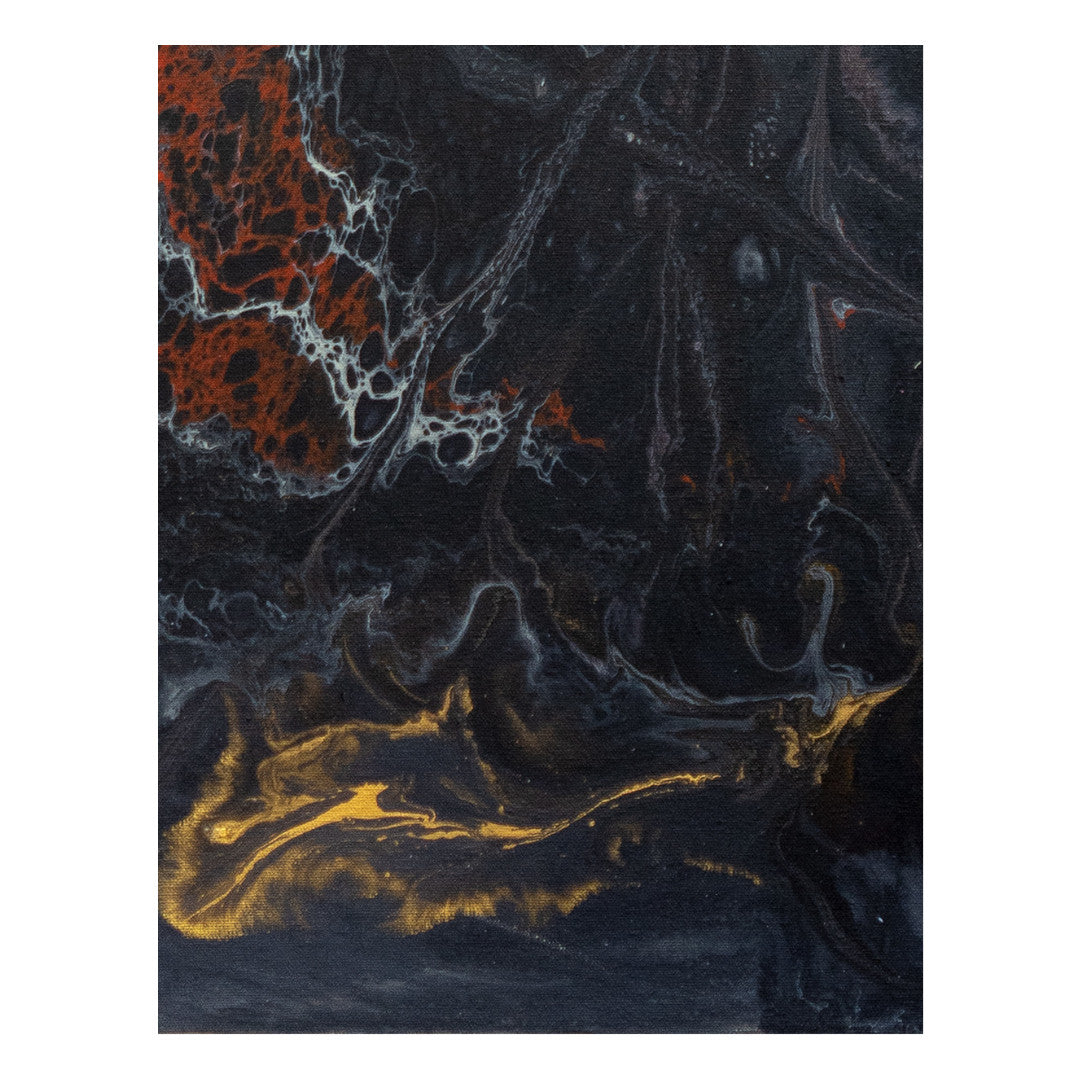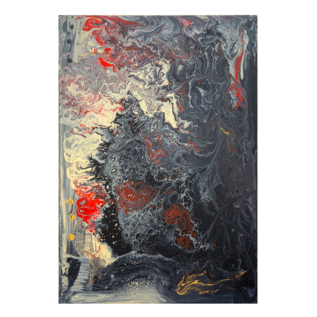 Abstract art on a cotton canvas frame using brushstrokes and Dutch pouring techniques.
